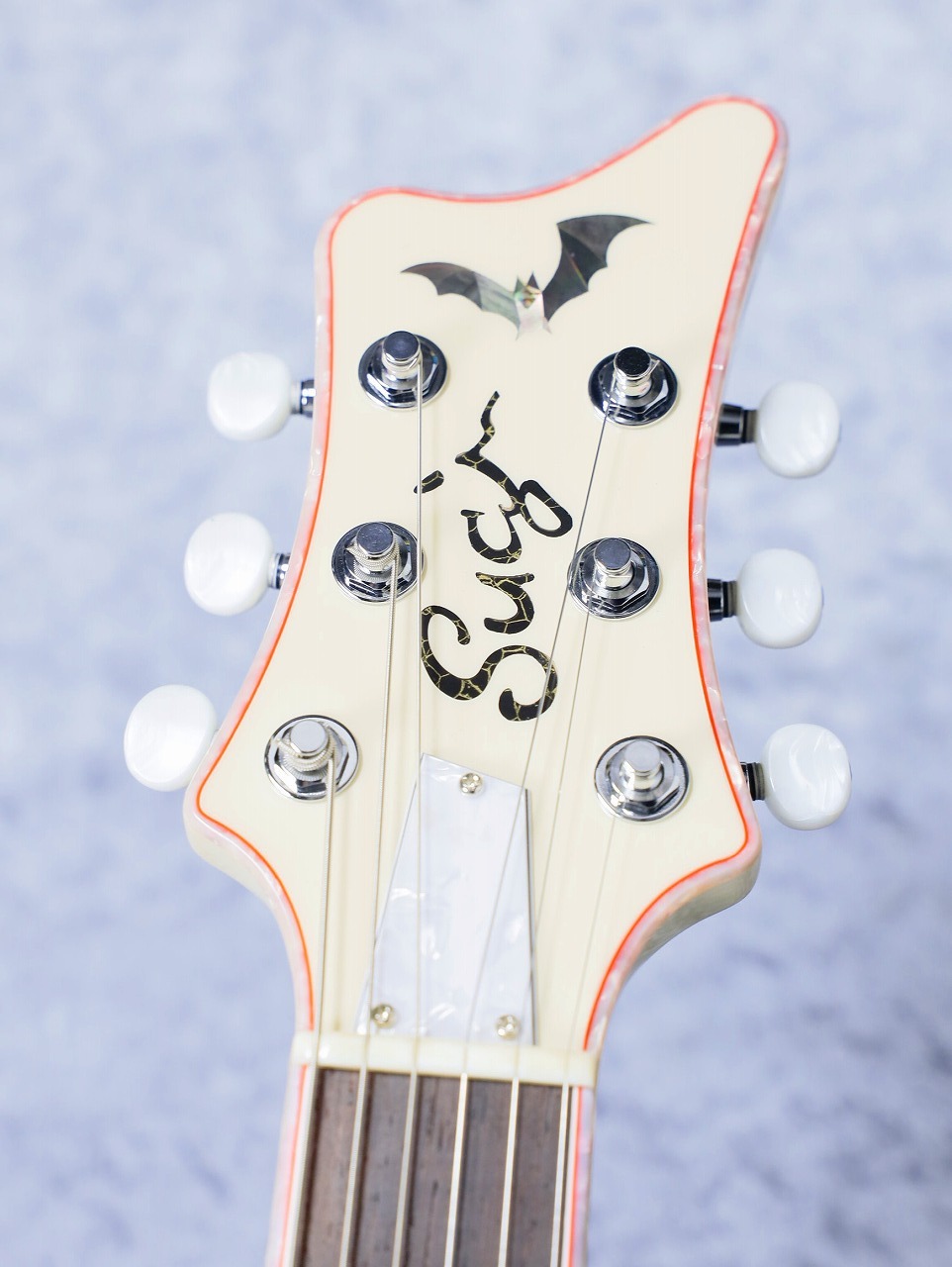 ヘッドには大きく20周年限定のコウモリと縦ロゴを配置。ボディと指板サイドにはピンク色とホワイトパーロイドの積層バインディングが入っており、このセンスはSugi Guitarsならではでございます。
