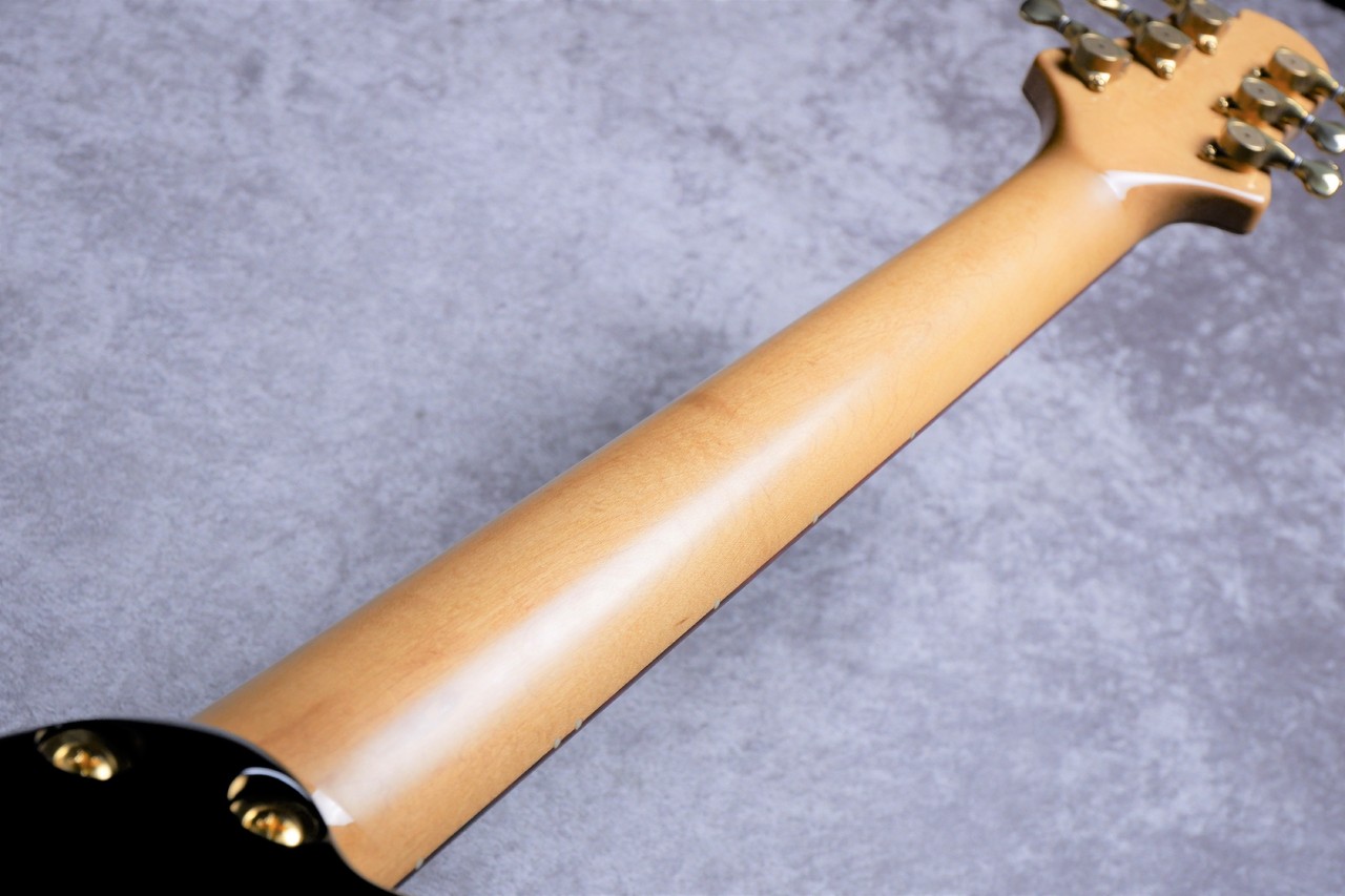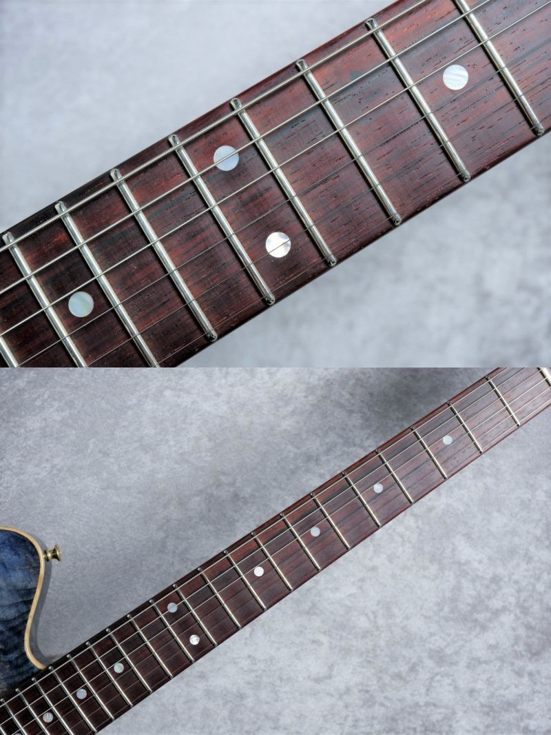 赤めで美しいココボロ指板、極上の杢目を併せ持つ「Extra exotic maple」を贅沢に採用。角度によって揺れ動く細かい杢目が非常に引き付ける1本です。ネックはアクアティンバーメイプルネック。このウッドマテリアルは、マニア心もくすぐります。木に拘りぬいたSugiならではのスペックです。