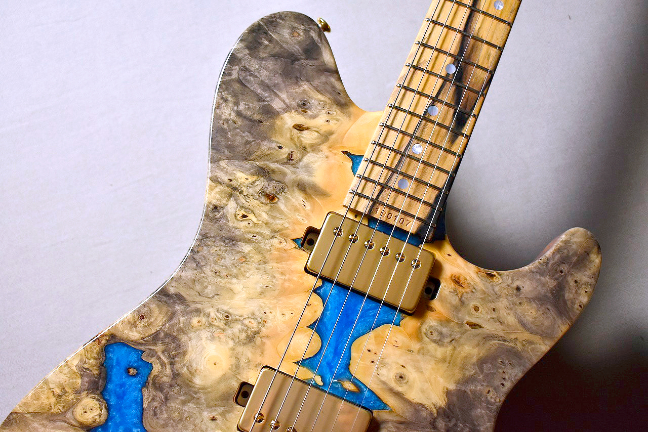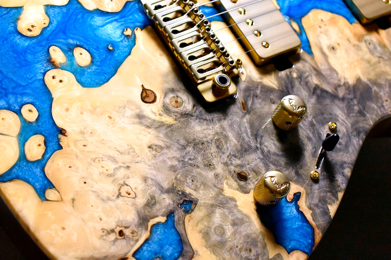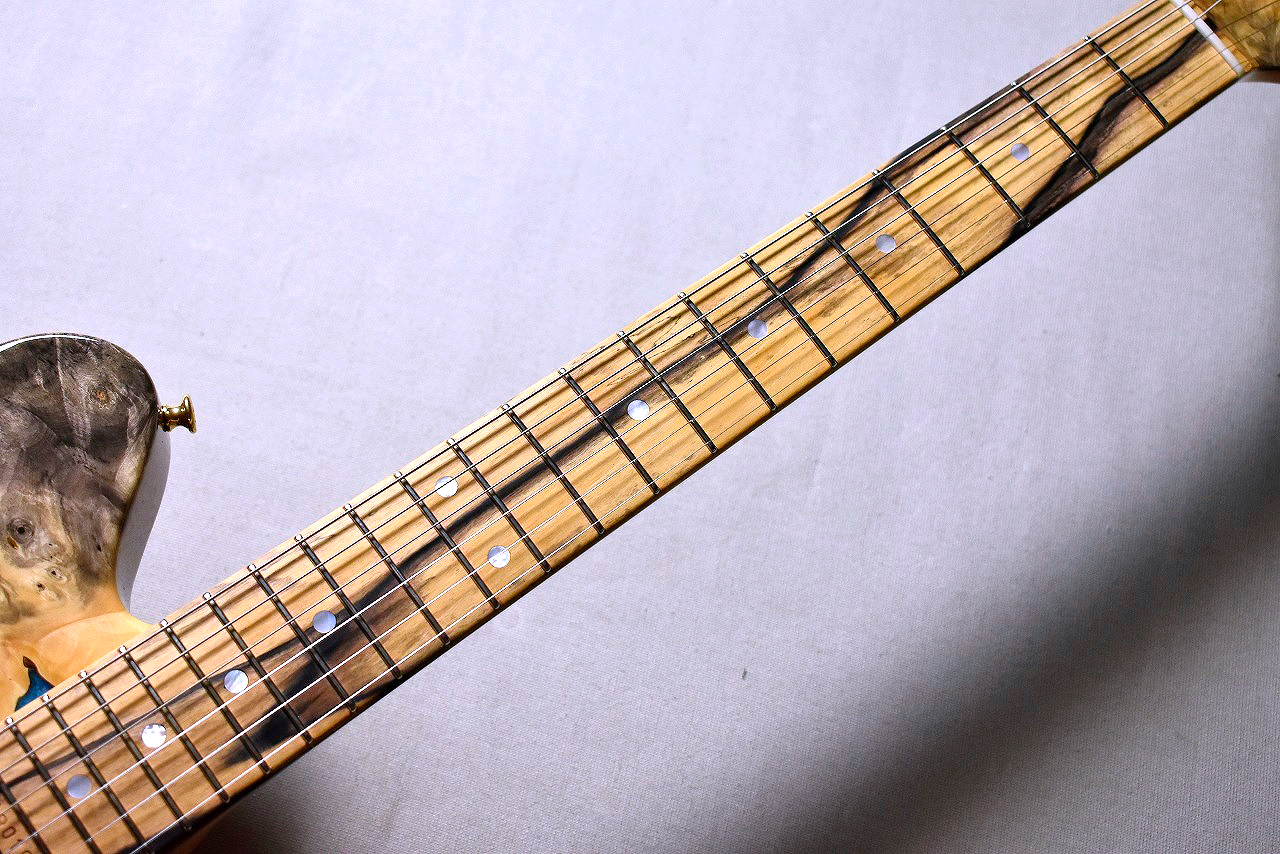 当店スタッフが杉本氏と一緒に選定した極上のバールメイプルを採用、木材を活かしたナチュラルカラーで仕上げ、美しいレジンを入れました。指板はこれもスペシャルな「ブラック&ホワイトエボニー」を採用!!パーツは華やかにゴールド、ノブもバットノブへ変更。Sugiらしく見目麗しい特別な1本になりました。