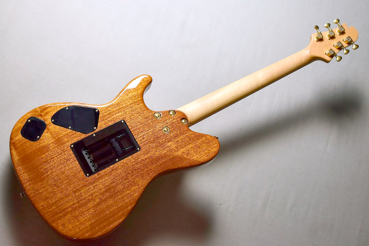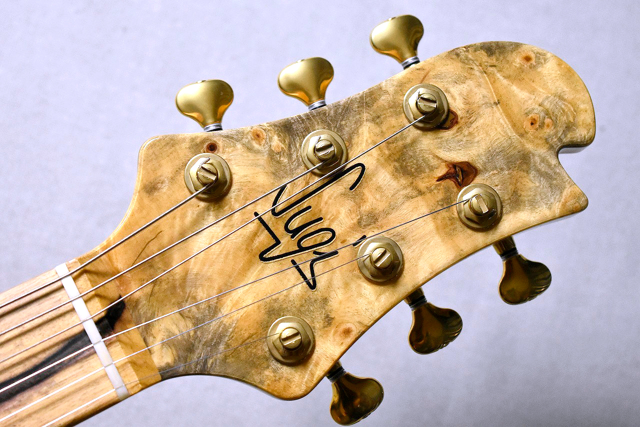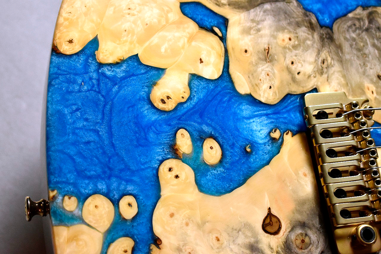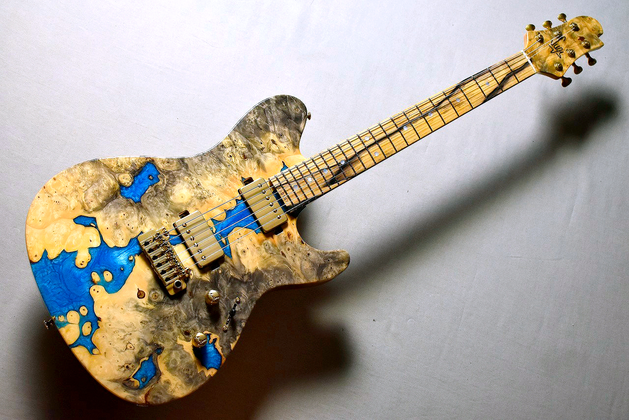 当店スタッフが杉本氏と一緒に選定した極上のバールメイプルを採用、木材を活かしたナチュラルカラーで仕上げ、美しいレジンを入れました。指板はこれもスペシャルな「ブラック&ホワイトエボニー」を採用!!パーツは華やかにゴールド、ノブもバットノブへ変更。Sugiらしく見目麗しい特別な1本になりました。
