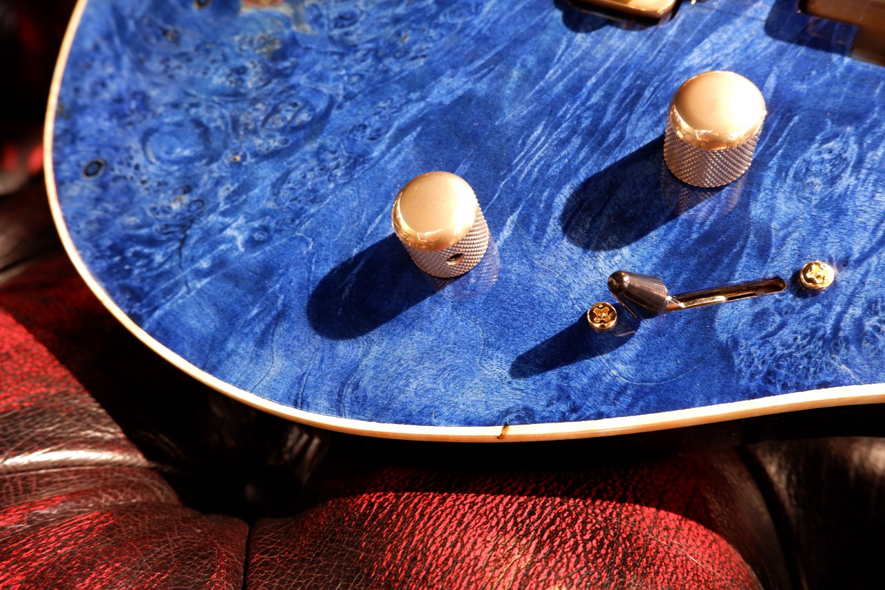 選定した「フルムーンメイプル」は、複合的な杢目が美しい材になっております。フレイムっぽい見た目や、バール感のある杢目が入りまざっており、自然の生命力を感じる神秘的な木材です。元の材が白いため、上品なRoyal Blueがくすむことなく再現されております。濃いブルーに合わせて、ゴールドパーツで更に華やかな仕上げに。