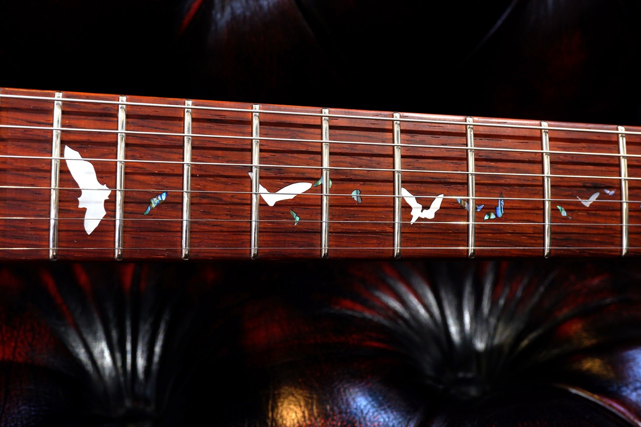 指板はココボロ材を採用。高い密度を誇る木材で、輪郭のはっきりしたサウンドが特徴。アコースティックギターなどによく見かけるかと存じますが、赤味のある色と、このうねる様な杢目が特徴で、高級材として装飾や家具にも扱われていたものになります。美しい赤味のある色にバットインレイを施しており、夕方の空を舞うかのような印象がうっとりしてしまいます。