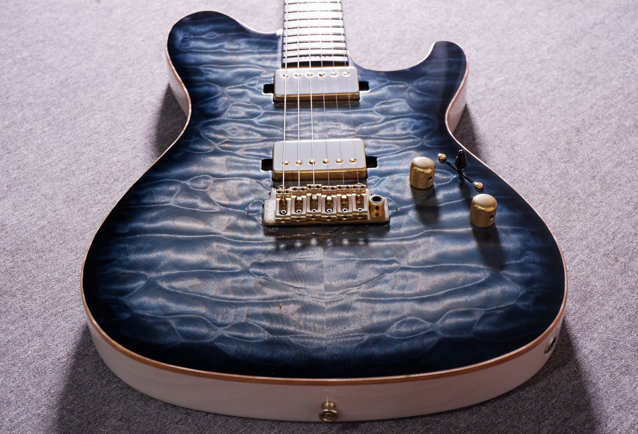 厳選された5Aランクのキルトメイプルをトップに採用し、通常の Dark Ocean Blue Burst よりもやや青みが弱く杢目の強弱を活かした非常に美しい仕上がりになりました。バックはアッシュ材を採用しており、バイカラーがお洒落な1本です。