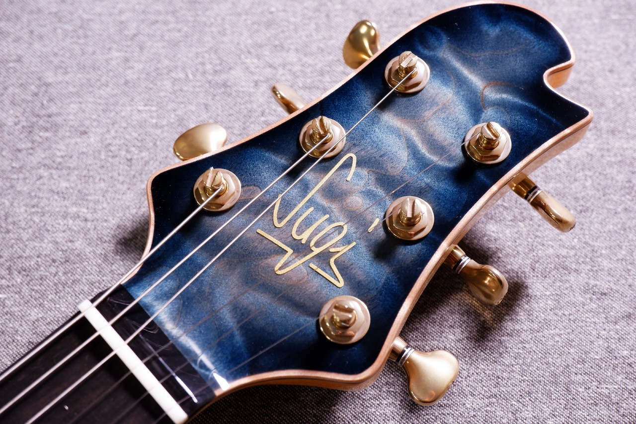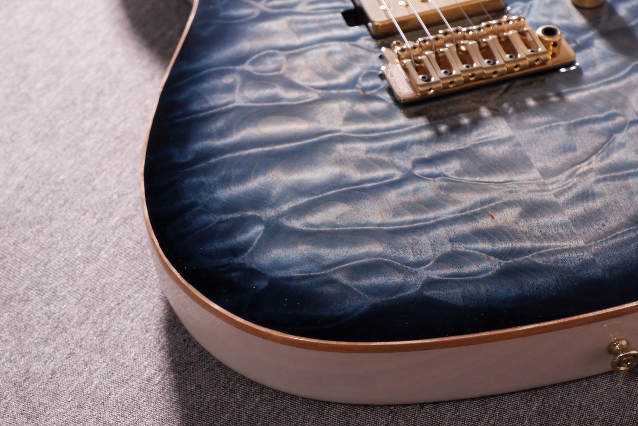 現地・長野でキルトメイプルを選定。細かすぎず・大振りすぎず、動きのあるメイプルを選定いたしました。ヘッドにも同じ木材を採用し、全体的に統一感を。暗めのブルーを選択しておりますが、バーストの中心部は明るくし、杢目の陰影を活かしたカラーリングにしております。このカラーリング技術は流石の Sugi。