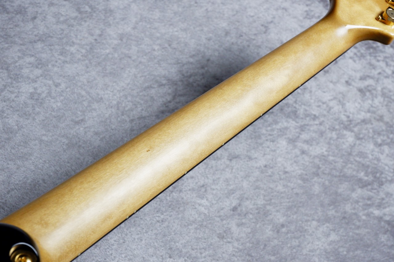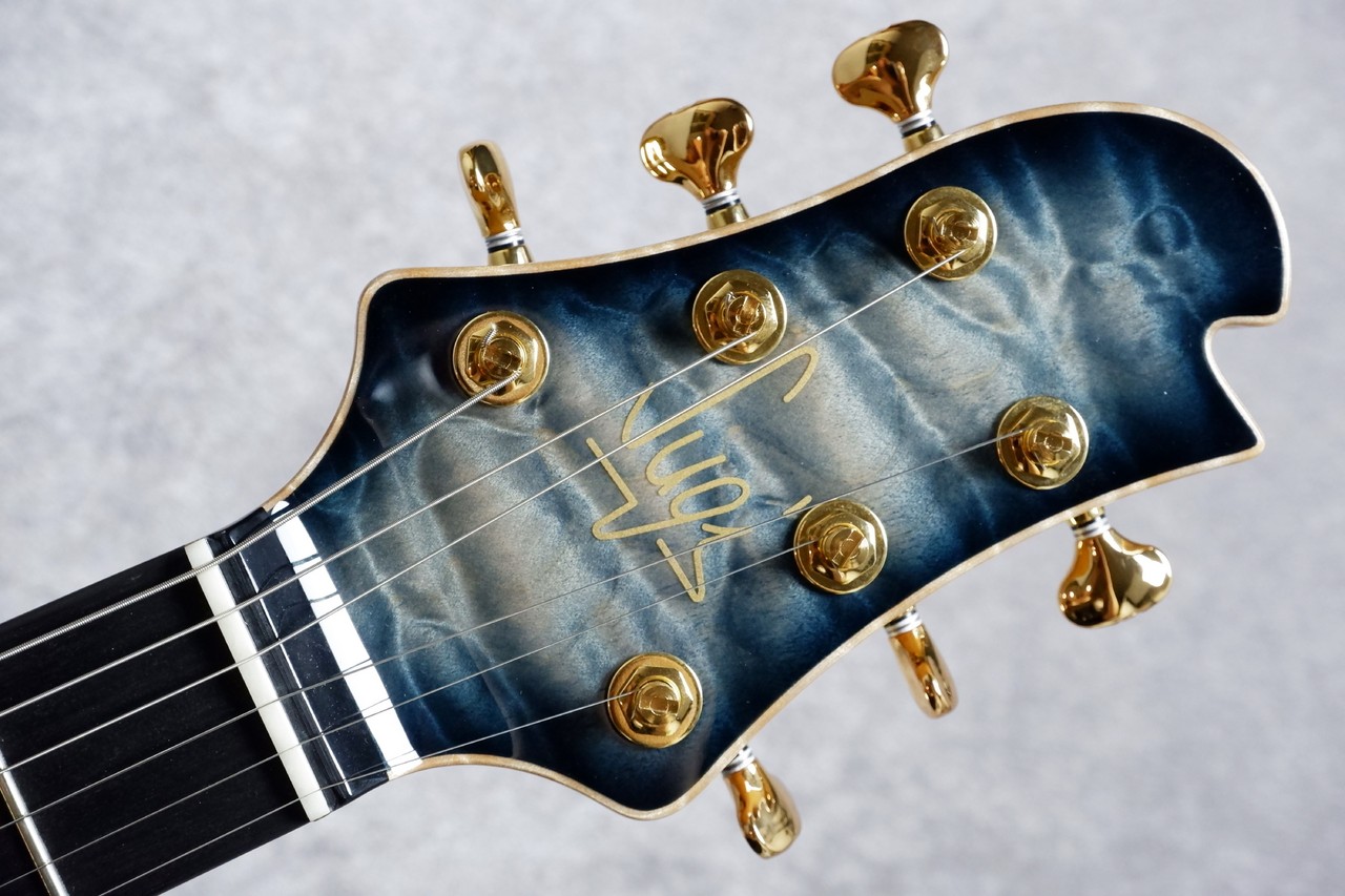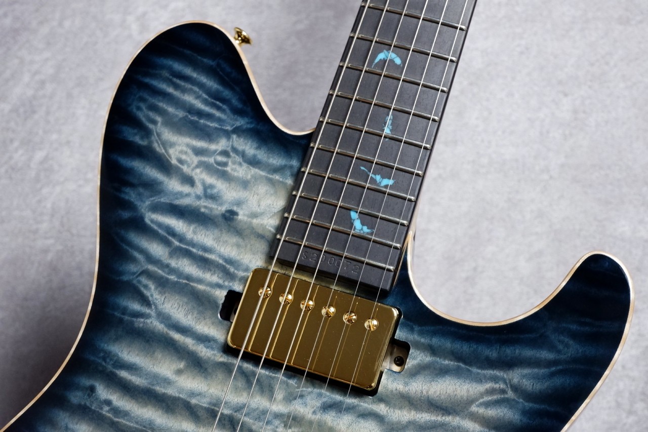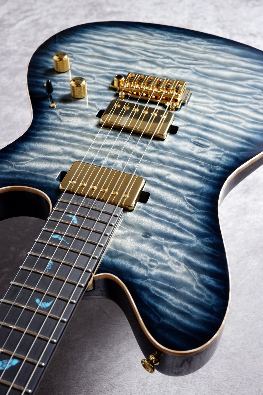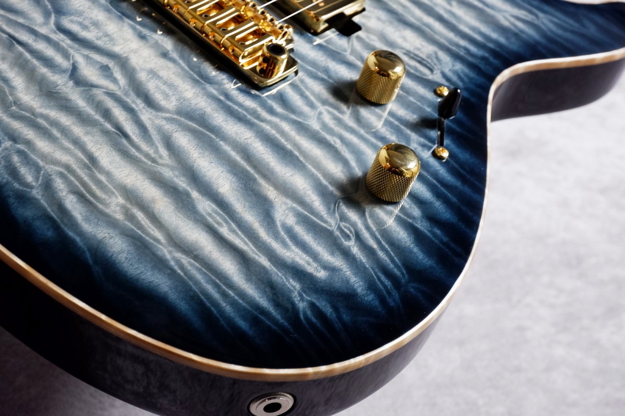 当店スタッフが現地で選定したバキバキの超極上6Aキルトメイプルを惜しみなく採用。揺れ動く杢目の陰影を活かした深く、淡いブルーでオーダーしました。夜空みたいな色合いがとっても美しく、中心部分はより杢目を際立たせた1本!