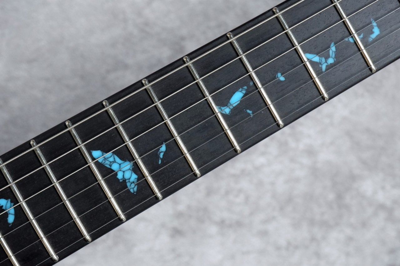 シンプルにエボニー指板を採用。インレイもこだわり、Sugiのお馴染みでもあるBat Inrayを採用。いつもとは一味違う、ターコイズカラーにてインレイをオーダーいたしました。