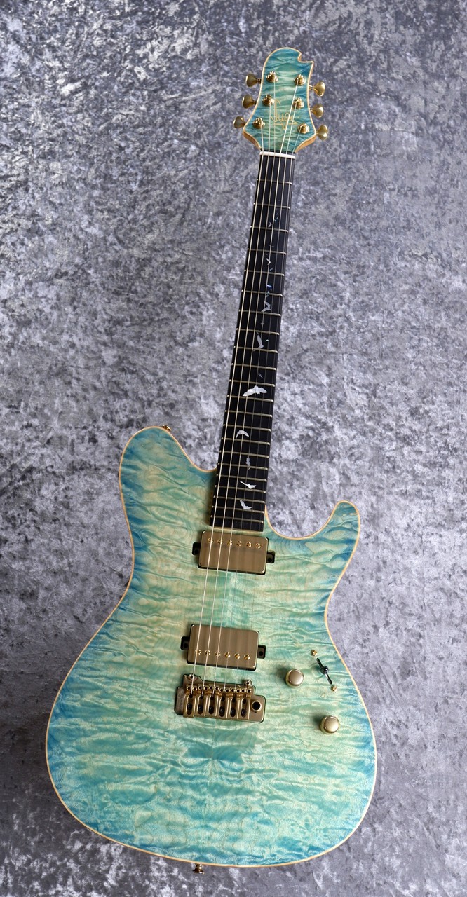 杢目を最大に活かせるよう、シアー感の強い mountain stream blue で着色。この絶妙なバーストカラーは数々の美しいギターを制作してきた Sugi だからこそ。さらにはゴールドパーツで更に華やかな仕上げに。
