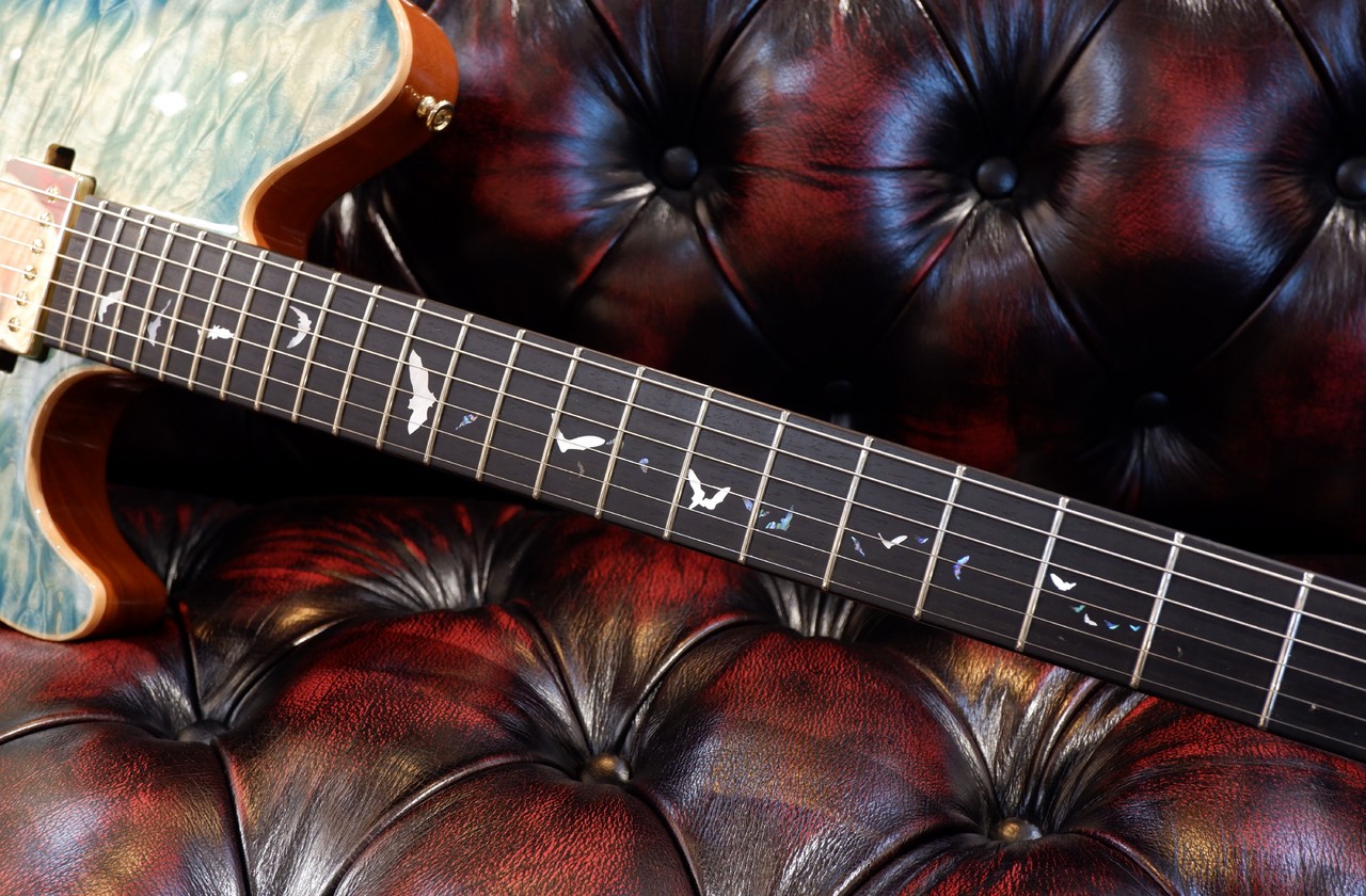 そしてなんといってもこのネック!こちらも現地選定のカーリーメイプルを採用。繊細なトップに合わせて、繊細に細いカーリーメイプルを選んでおります。角度によって揺れる美しいメイプルは、演奏時にもテンションが上がってしまう逸品です。指板は艶の美しいエボニーを採用。夜空に舞うコウモリの如く、白いバットインレイが映えています。