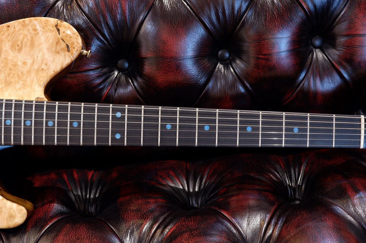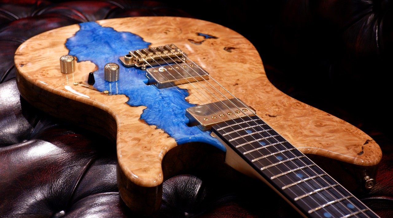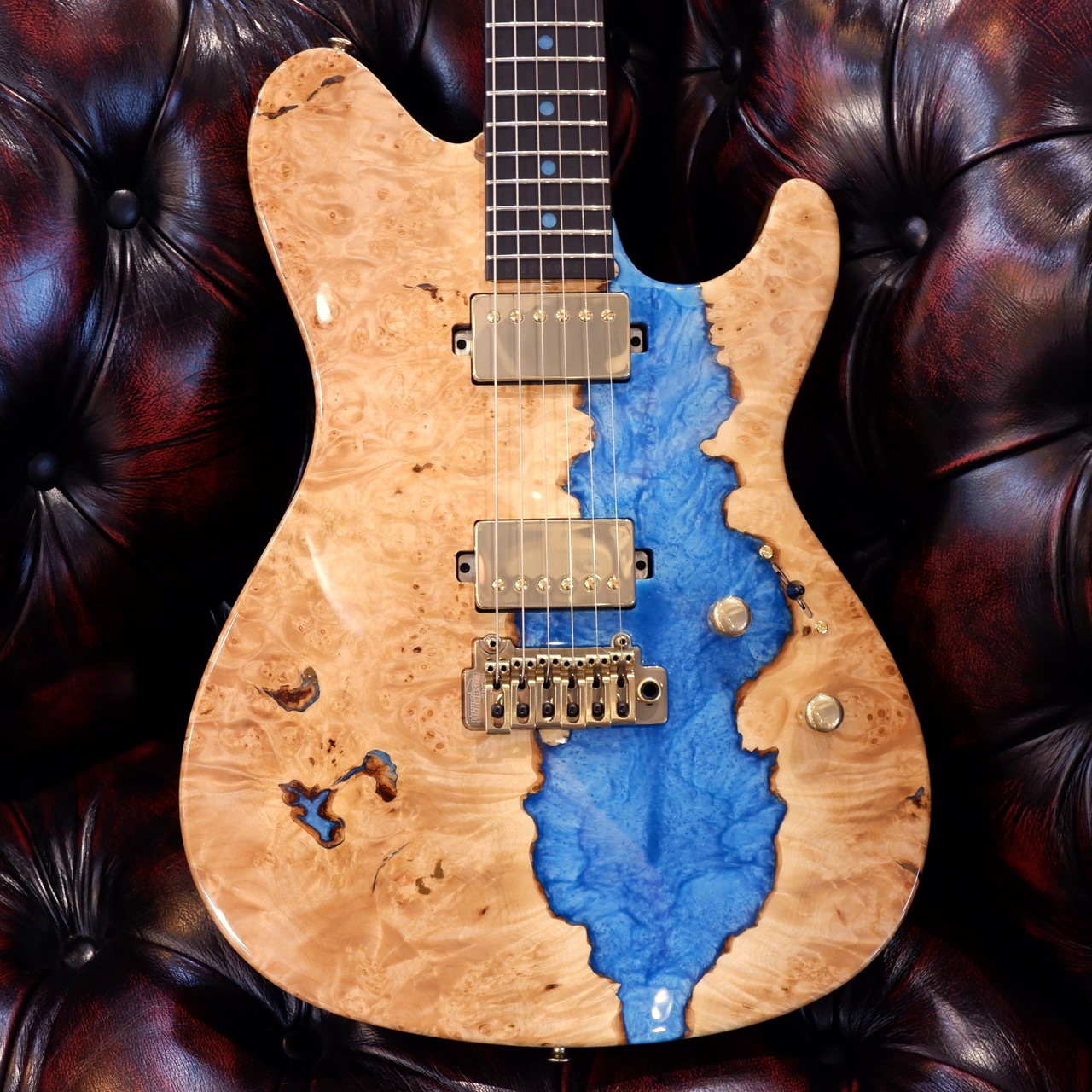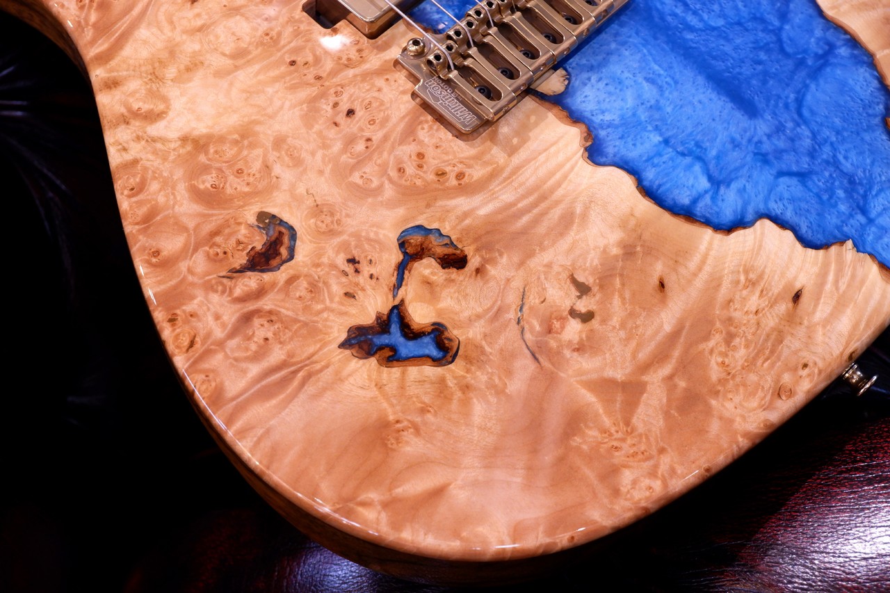 わざと隙間を大きくとっており、キラキラと輝く青いレジンで個性を出しております。自然発生の神秘的な杢目×人工物のレジンが織りなす芸術的ルックスは、Sugi guitarsのセンスならでは。