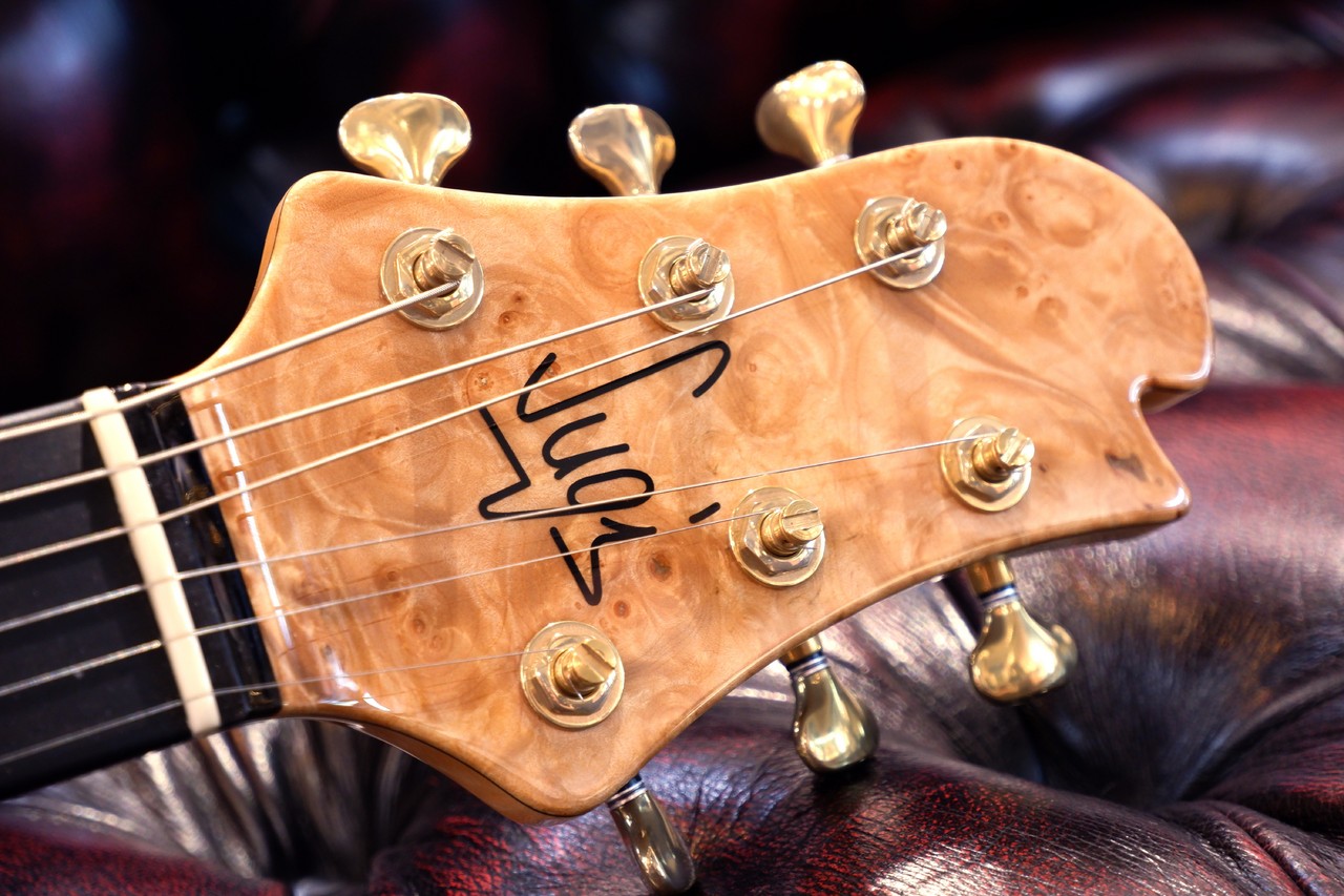 パーツは華やかにサテンゴールドで、Sugiらしく見目麗しい特別な1本になりました。濃い色使いではないため、余すことなく杢目の強弱を活かした非常に美しい仕上がりになりました。