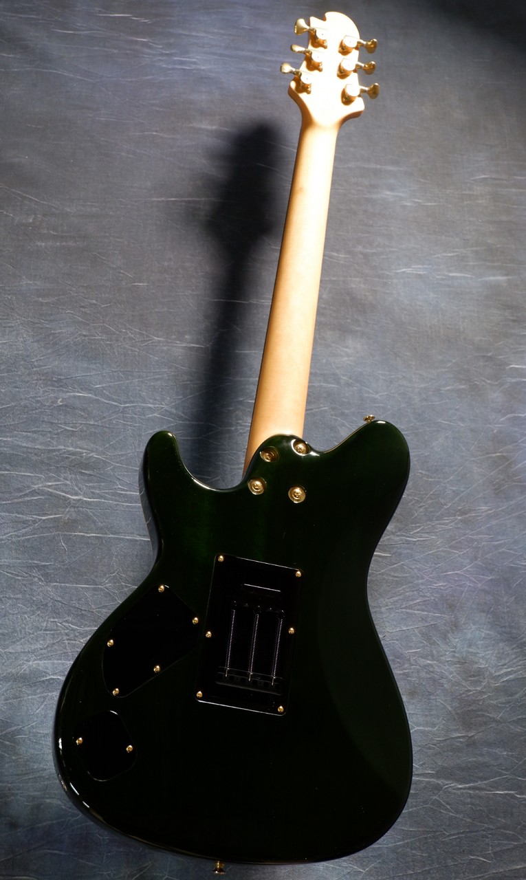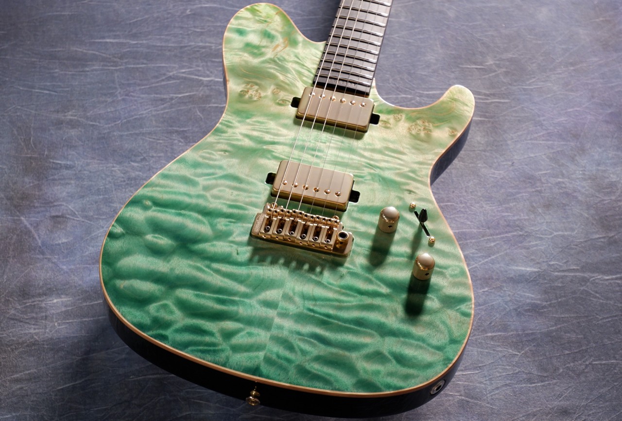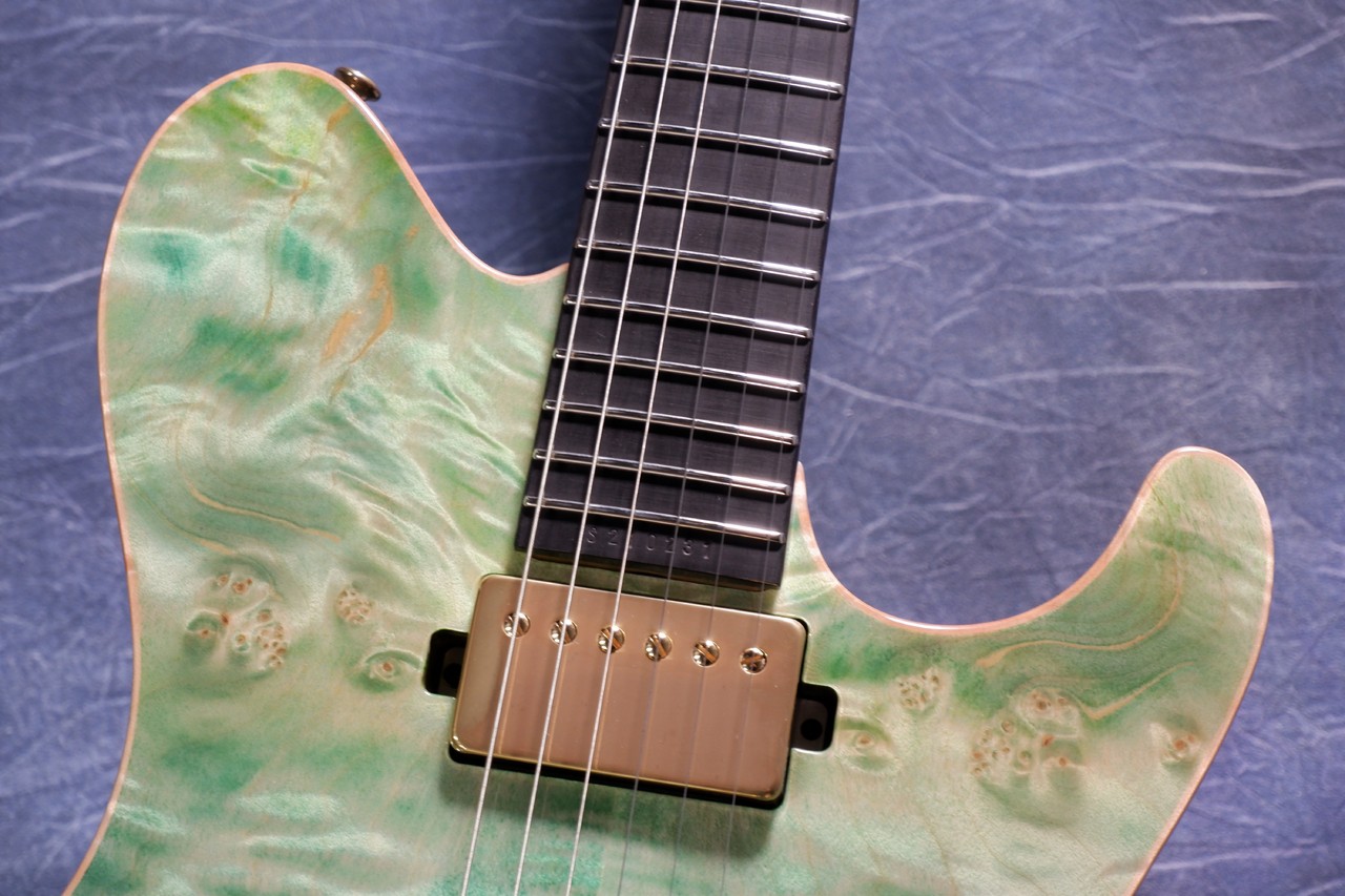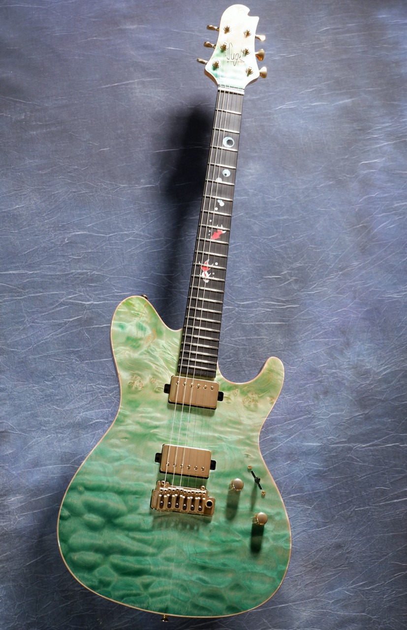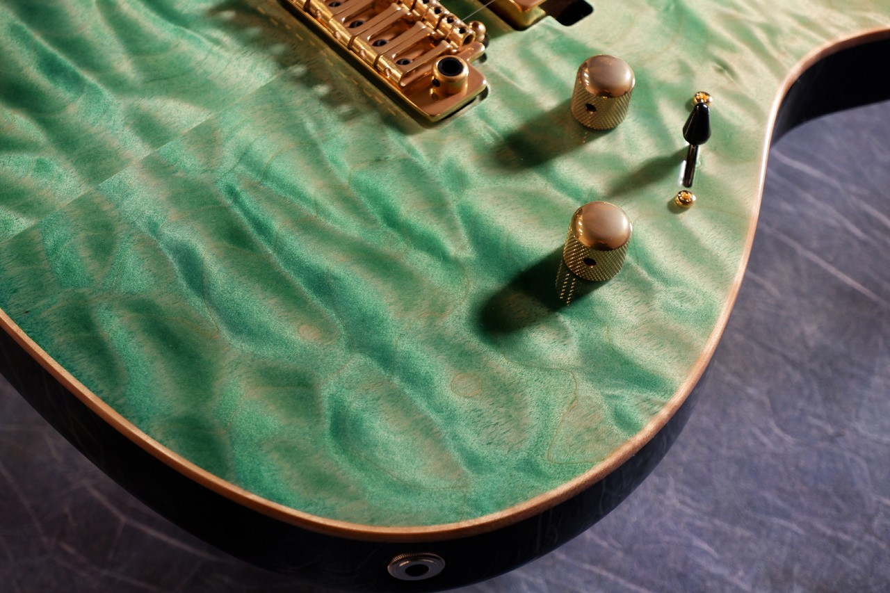 当店スタッフが選定した玉杢のようなエキゾチックメイプルを採用、水中をイメージしたカラーにしたかったので、こちらは透明感のあるグリーンのグラデーションカラーにしました。ヘッドも併せてグラデーションカラーにてオーダー、小さな泡模様がポイントです。玉杢風なのは、水面を再現したかったからになります。まるでボディが金魚鉢のような仕上がりです。海外ユーザーの反応も上々、担当も非常にお気に入りのデザインとなりました。