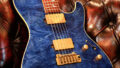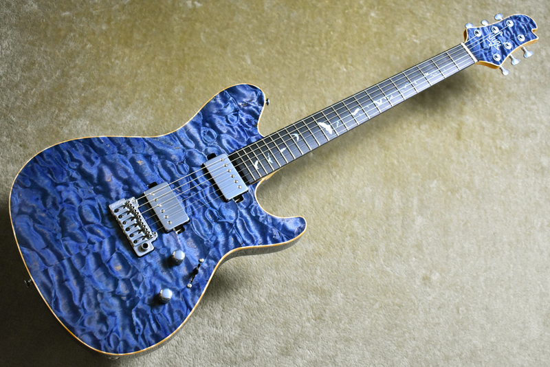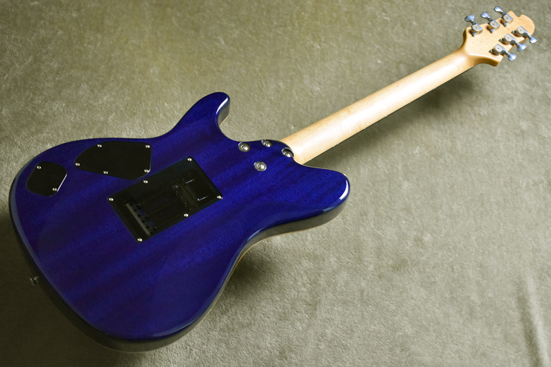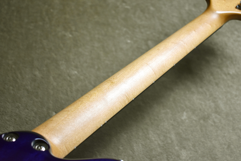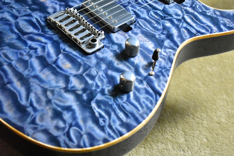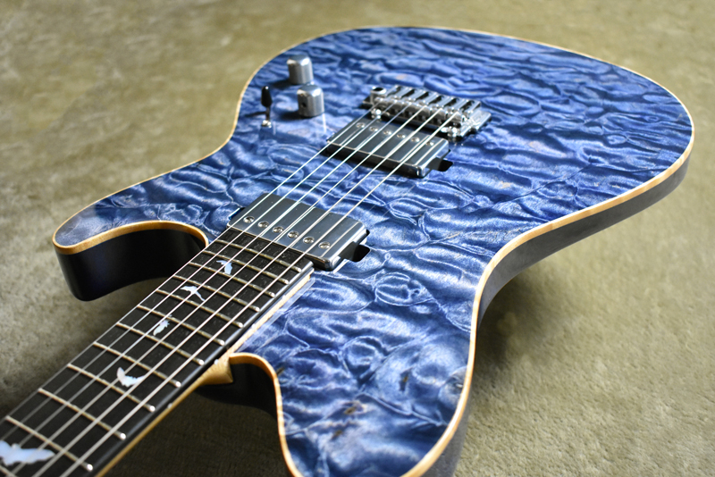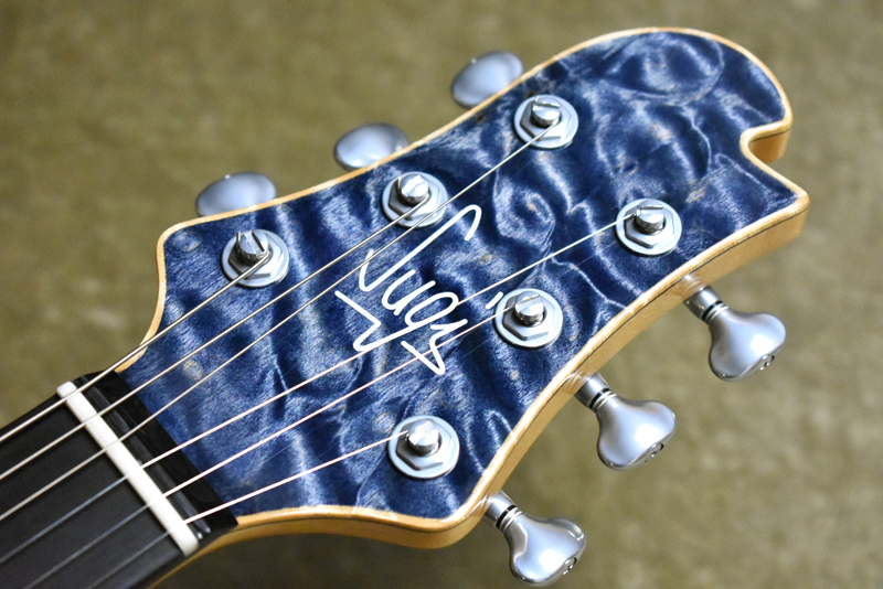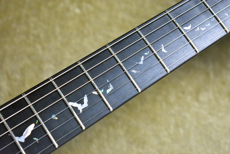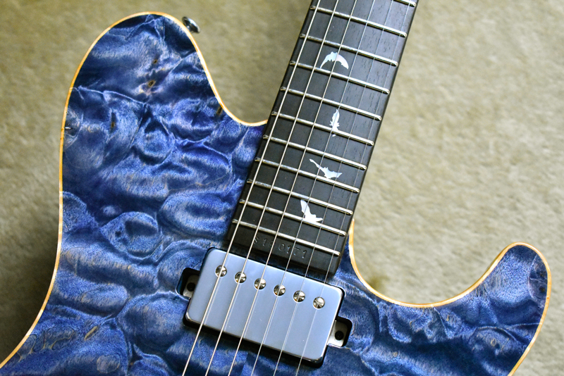 当店スタッフが杉本氏と一緒に選定した Marverick Quilted Maple を贅沢に採用、ダークトーンなネイビーブルーに合わせてエボニー指板にいたしました。Sugiのアイコンである「コウモリ」を指板にあしらい、Sugiらしく見目麗しい特別な1本になりました。