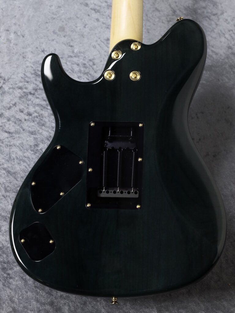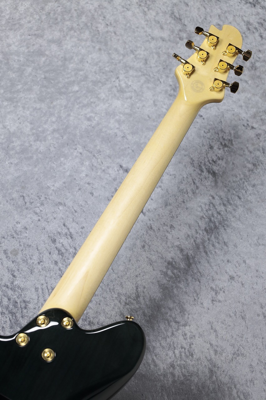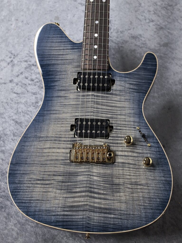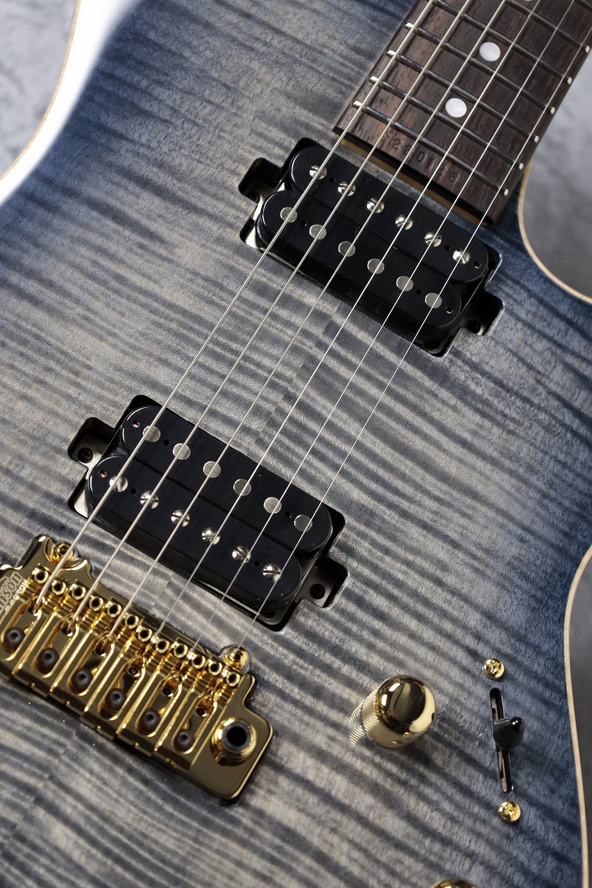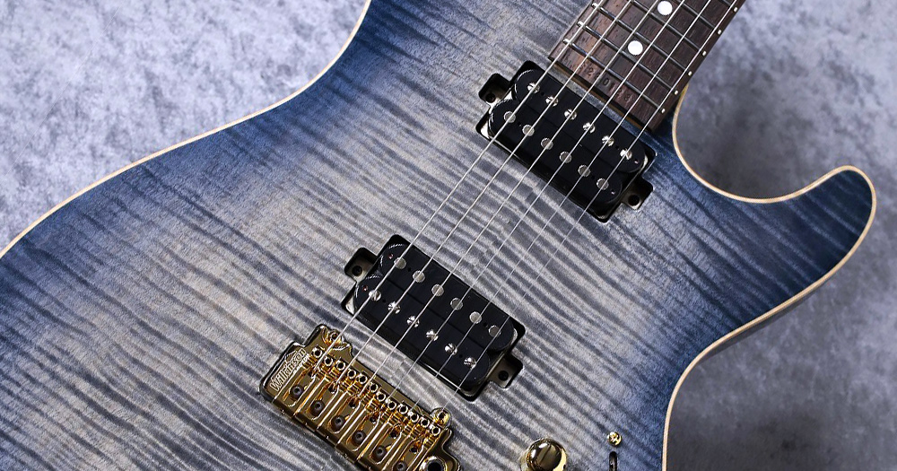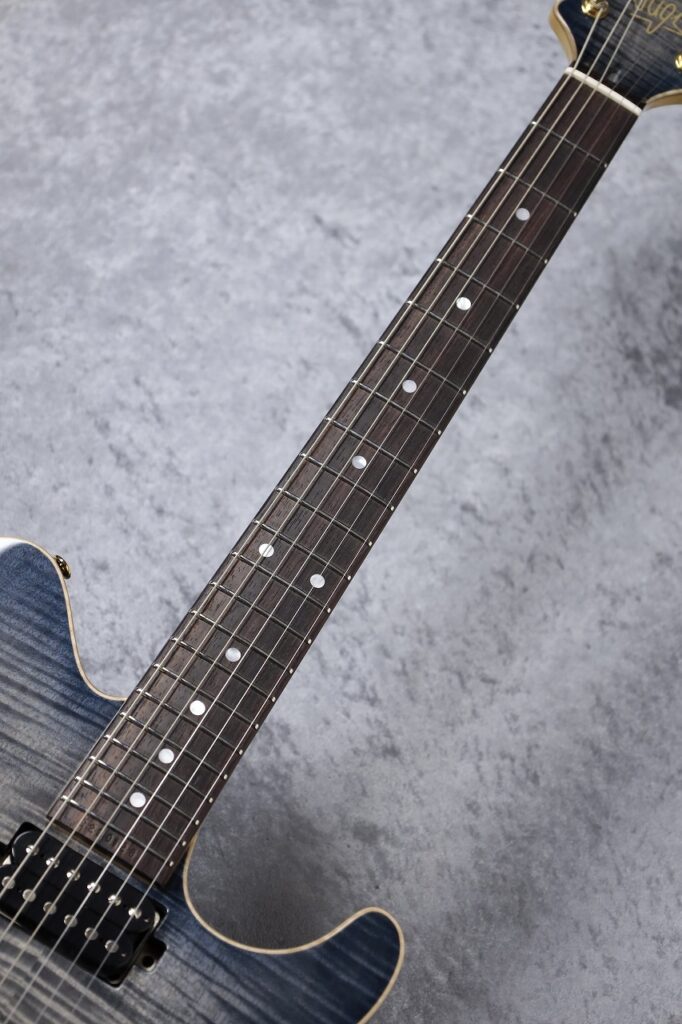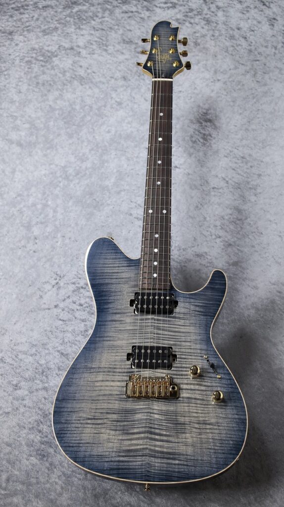 淡く・落ち着いたブルーバーストを纏った独特な雰囲気の1本。トップには杢目の美しい5Aランクのフレイムメイプルを採用しており、杢目を潰さないための淡めな色使いとの相性が非常に良い1本です!!恐らく、元のフレイムメイプルも綺麗な白色だったのか、ニュアンスカラーが非常に引き立っております。更にはゴールドパーツが華を添えた目を引く個体でございます。
