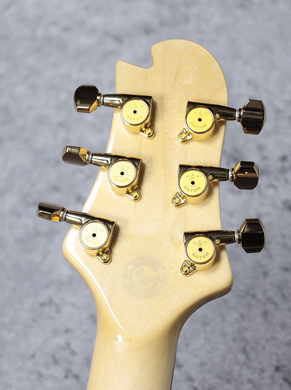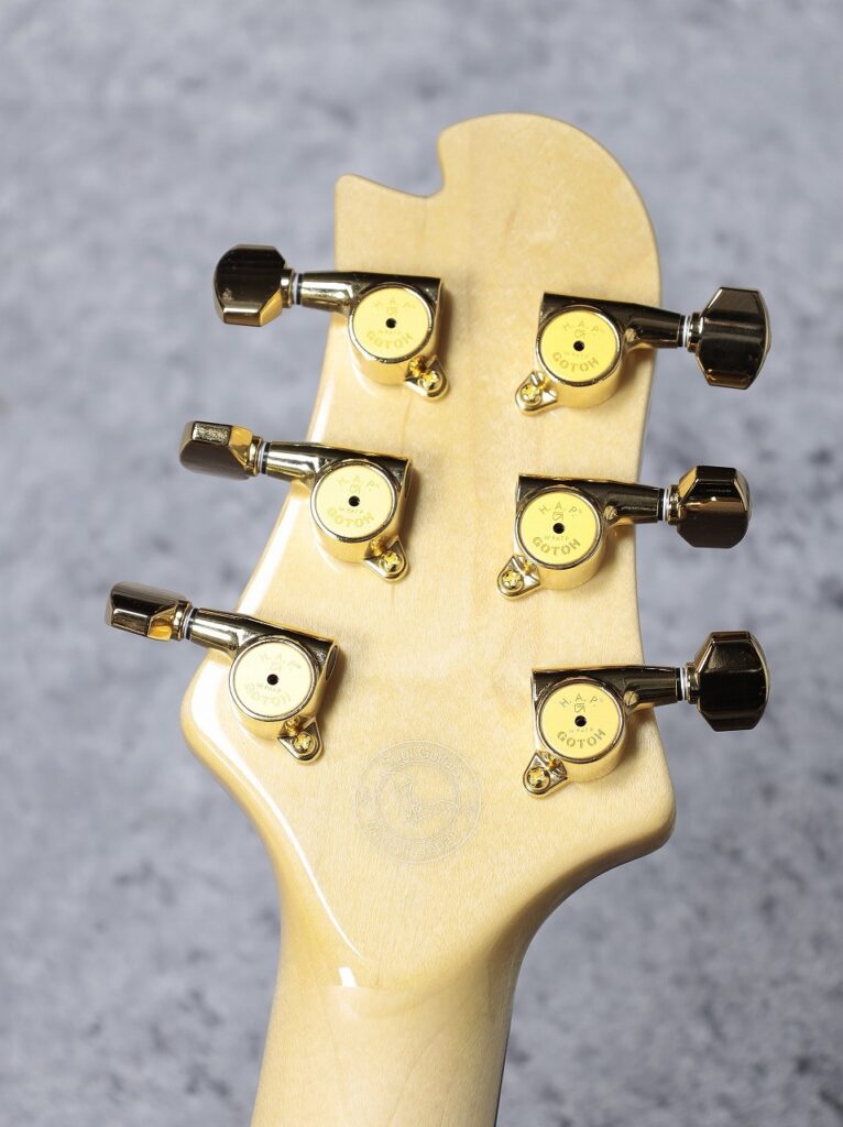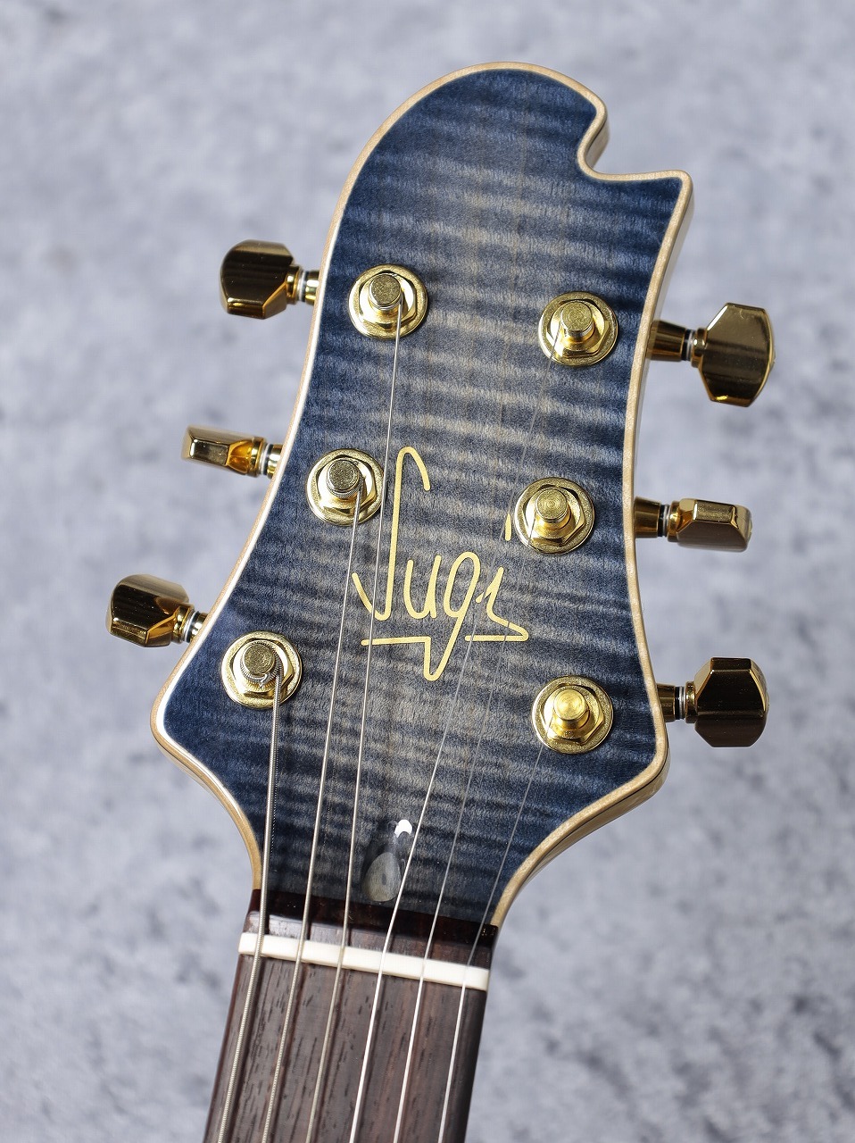 角度を変えると動きを見せてくれるフレイムメイプルは木材の良いSugiならではでございます。ゴールドパーツも相まって鮮やかながら落ち着きをもった最高の仕上げとなっております。国産ハイエンドの最高峰、憧れのSugiギターを是非この機会にいかがでしょうか。