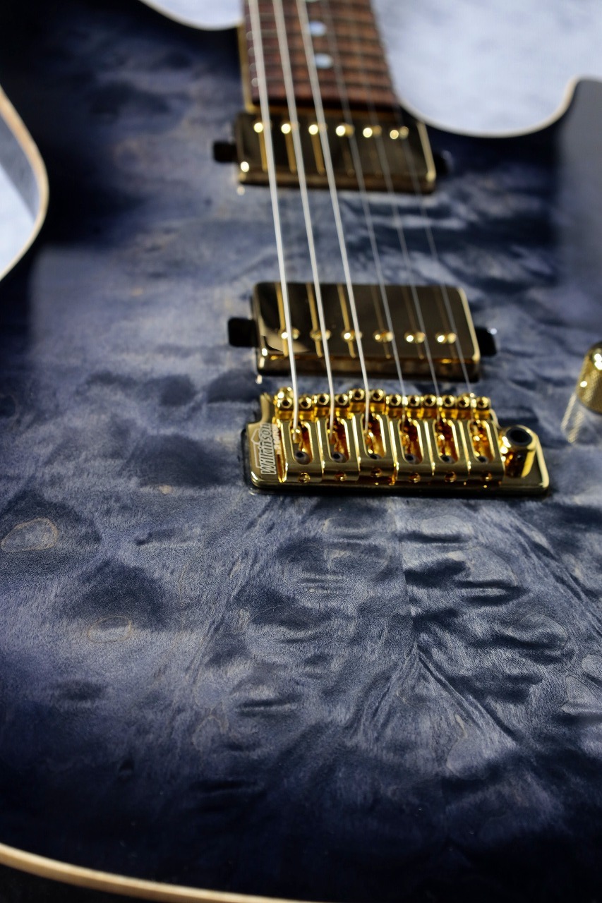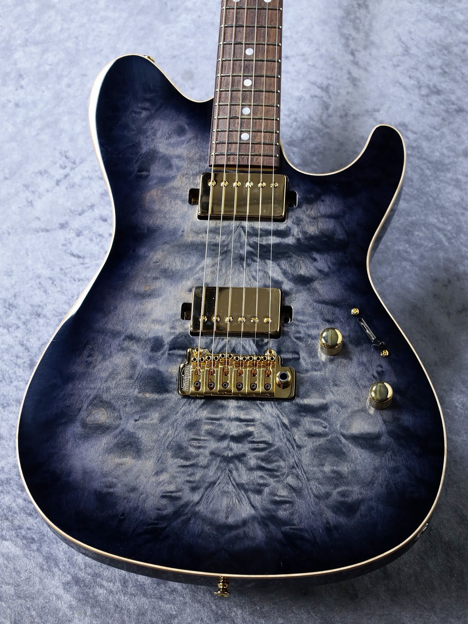 今回の入荷はシースルーブラックを纏った渋くて飽きのこない大変良いビジュアル。トップには均等な魅力のフレイムとは違う、複雑で美しい杢目のエキゾチックメイプルをチョイス。杢目を潰さない絶妙な色使いとの相性が非常に良い1本です!!更にはゴールドパーツが華を添えた目を引く個体でございます。