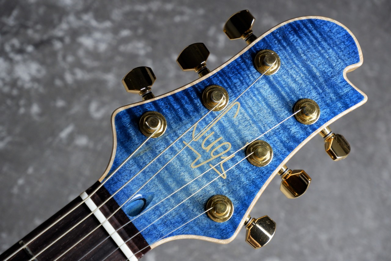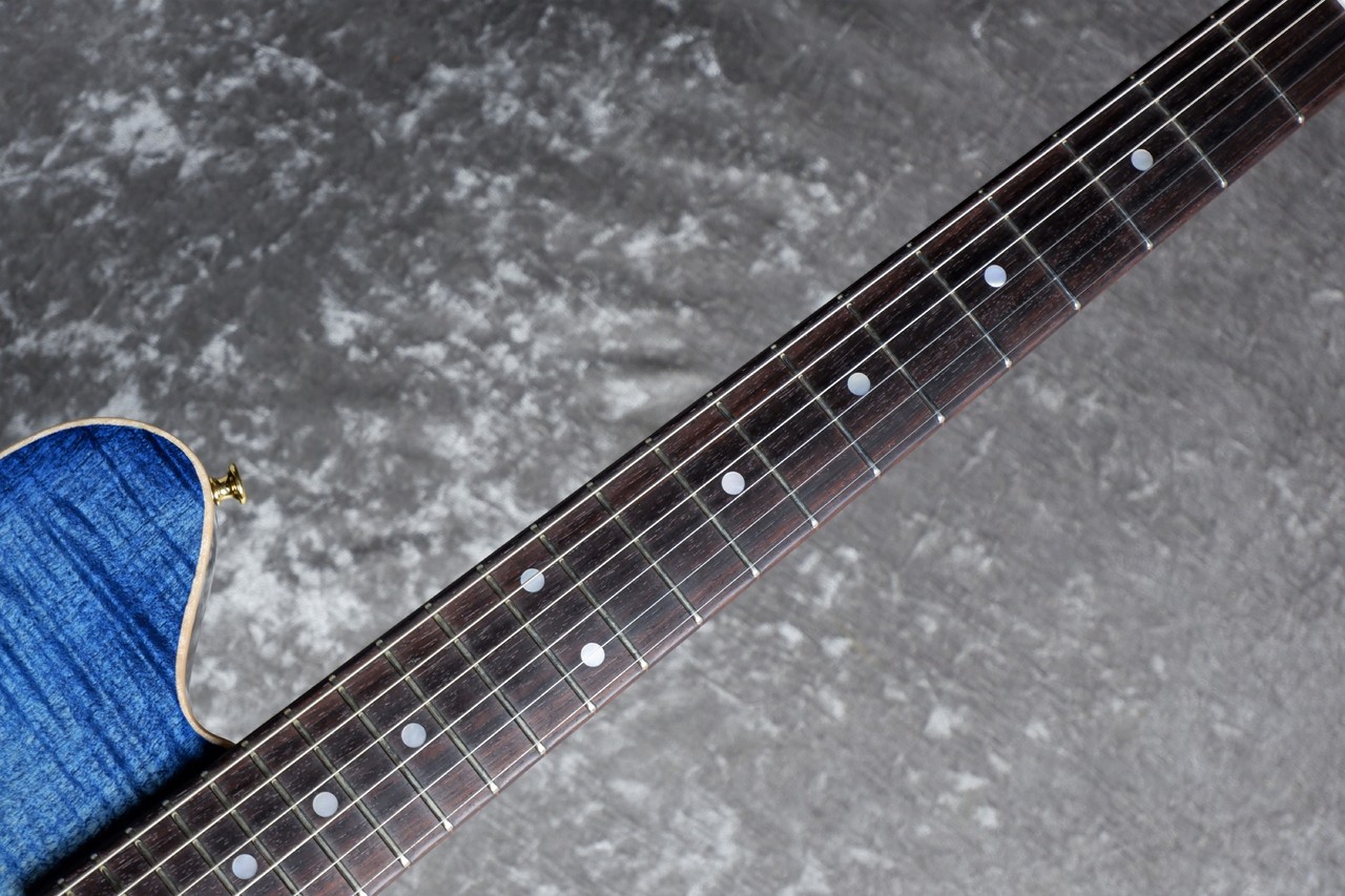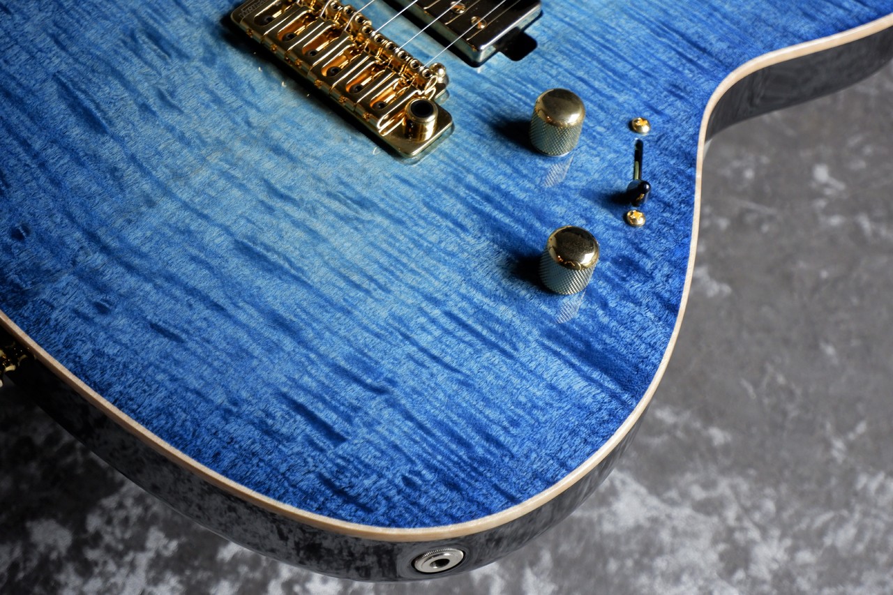 今回の入荷は美しく柔らかみのある「青」が特徴的なトランスブルー!Sugi はシースルーバーストなどの色味が多い中、やわらかい色合いが非常に特徴的です。エキゾチックメイプルの上品さが相まって非常に繊細な美しさ。細かい杢目がエレガントです。更にはゴールドパーツが華を添えた目を引く個体になりました。