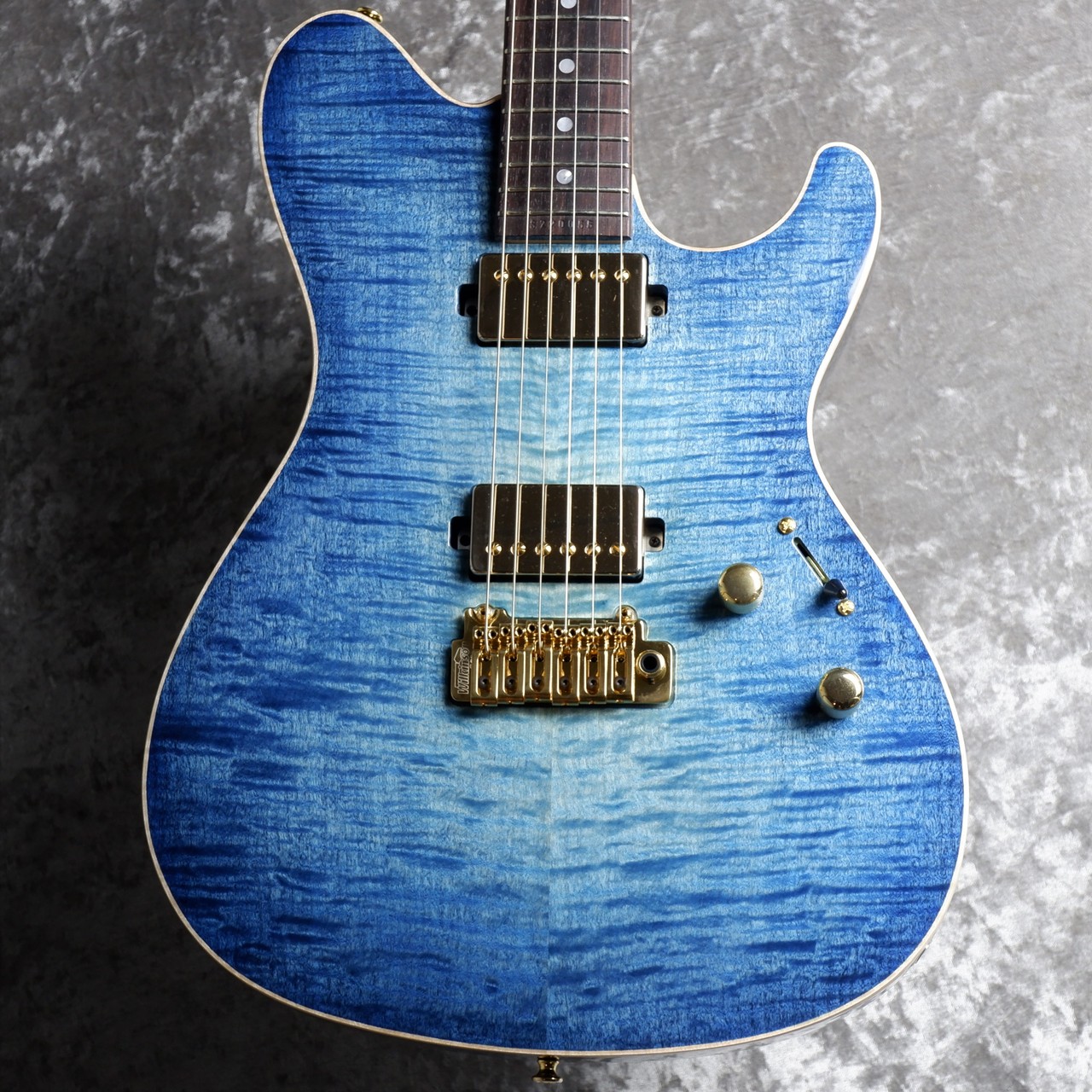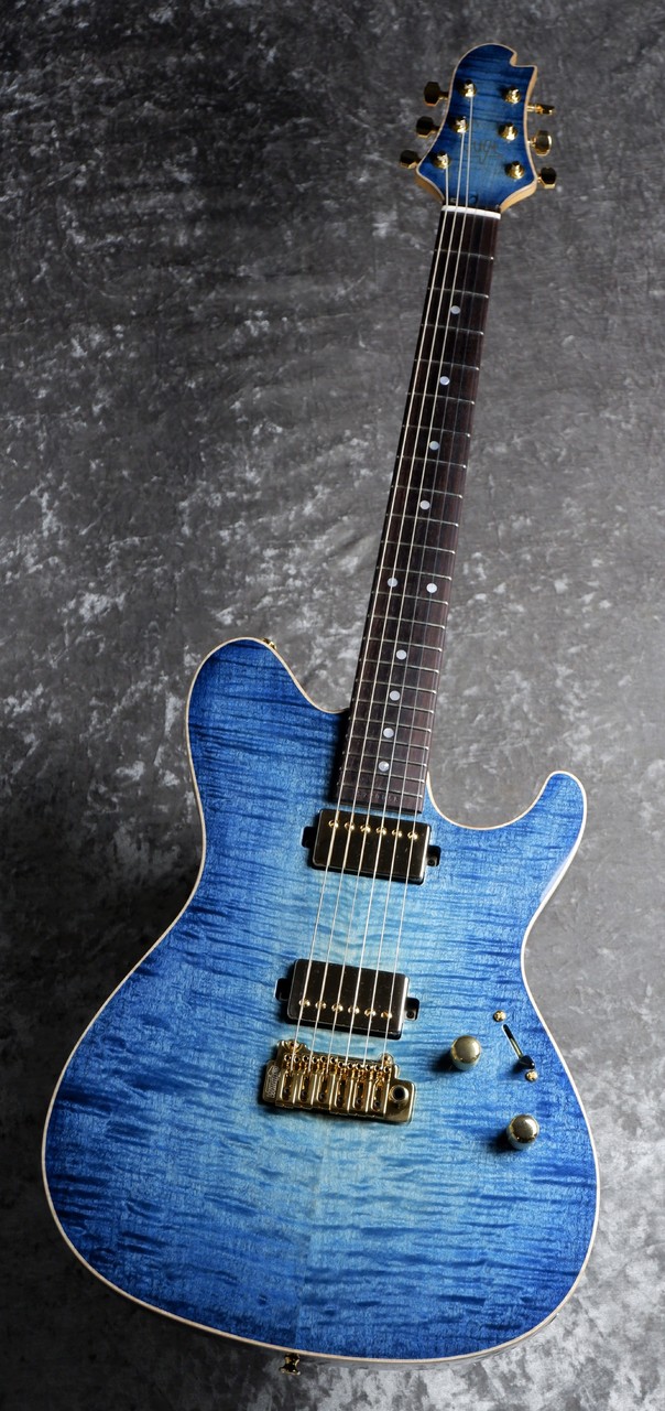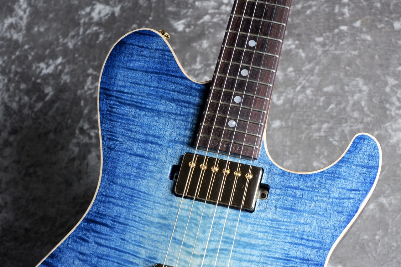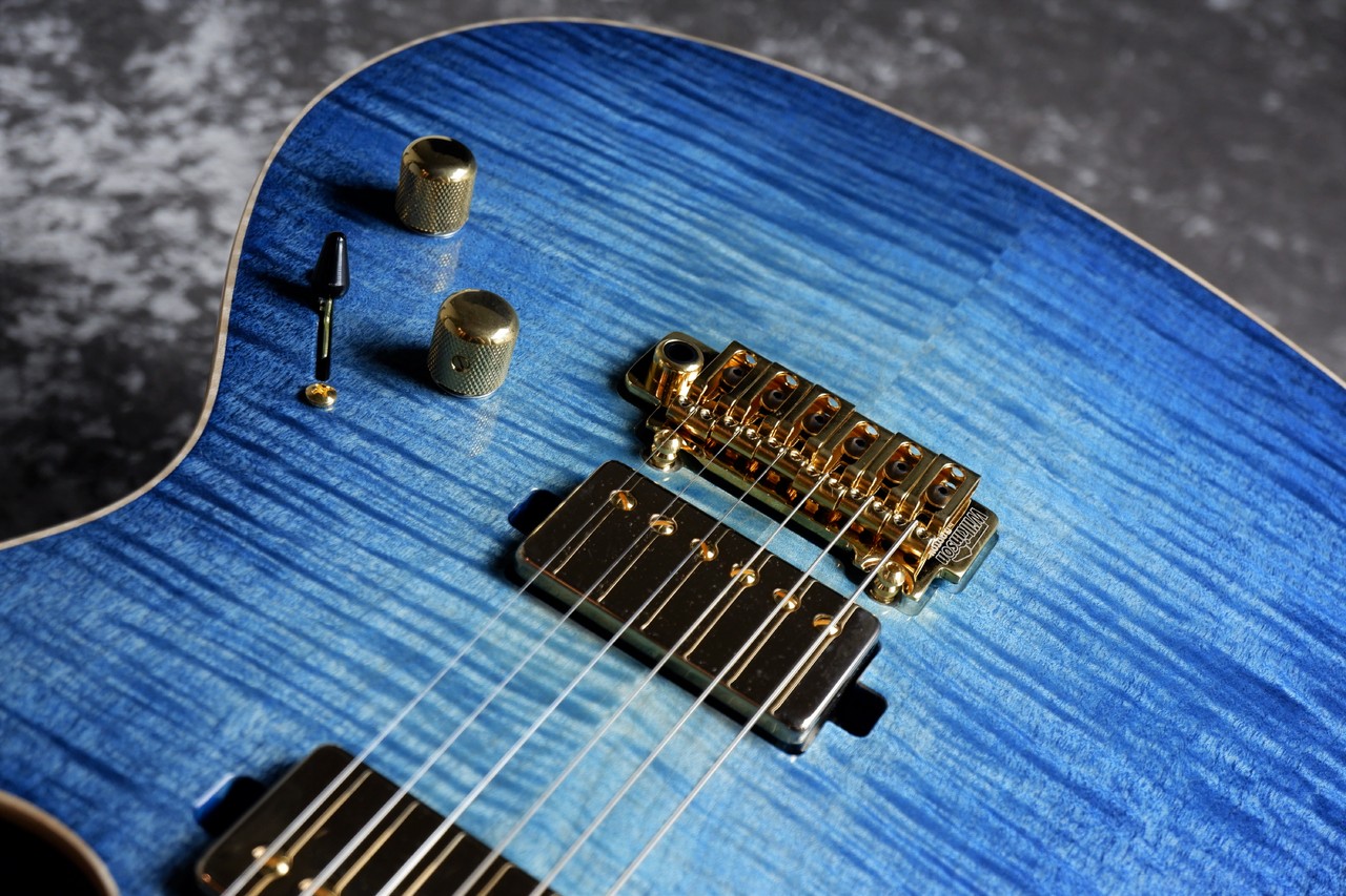 今回の入荷は美しく柔らかみのある「青」が特徴的なトランスブルー!Sugi はシースルーバーストなどの色味が多い中、やわらかい色合いが非常に特徴的です。エキゾチックメイプルの上品さが相まって非常に繊細な美しさ。細かい杢目がエレガントです。更にはゴールドパーツが華を添えた目を引く個体になりました。