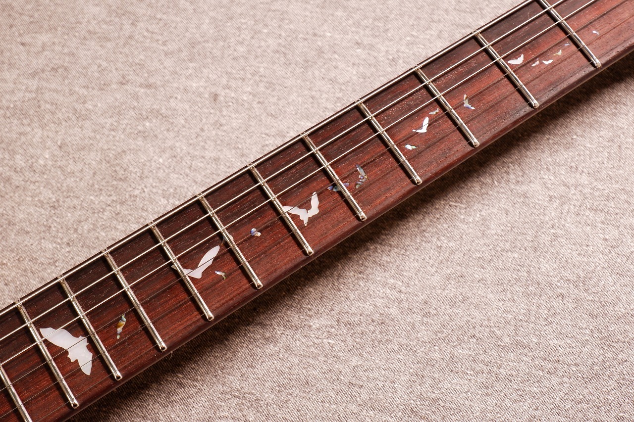 握りやすいネック、人気のアッシュ×ローズ指板を採用し、Sugiの特徴の一つでもあるバット(コウモリ)インレイをあしらっております。一匹一匹個性があり、幸せを運んでくれるコウモリが夜空を羽ばたくような幻想的な仕上げです。フレットサイドの処理やサテンフィニッシュのネック、非常にバランスの取れたボディシェイプ等、プレイ時のストレスも最小限に抑えられております。