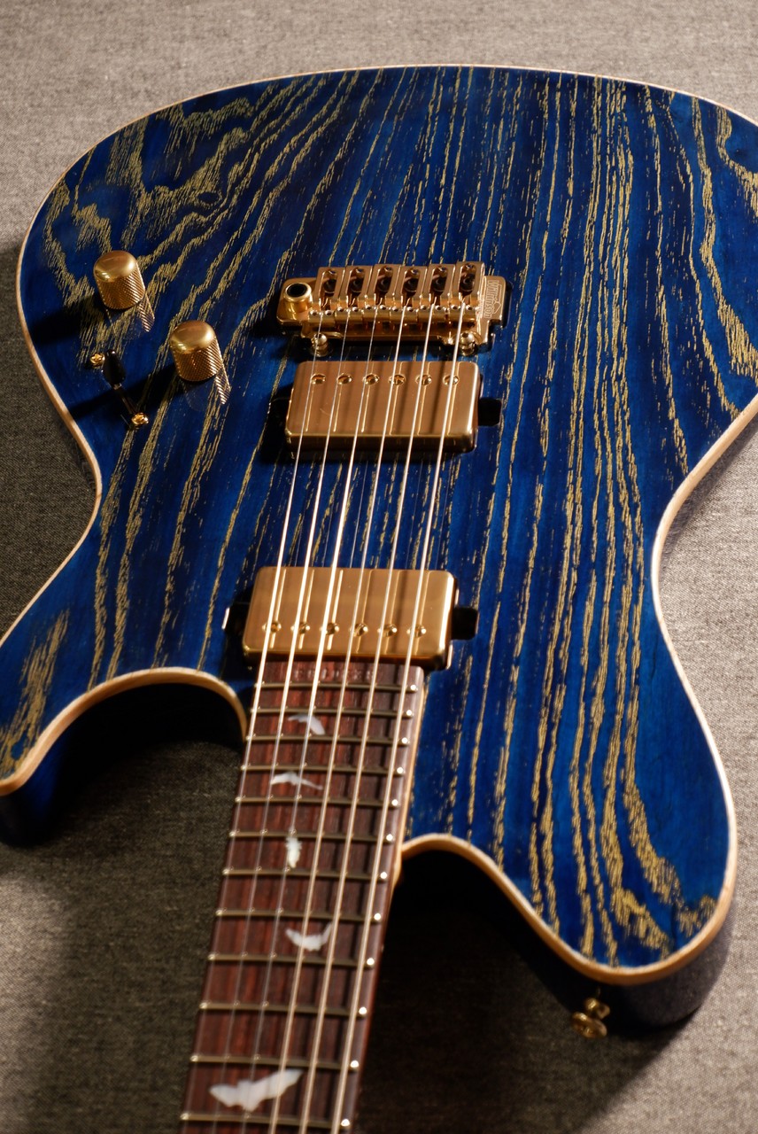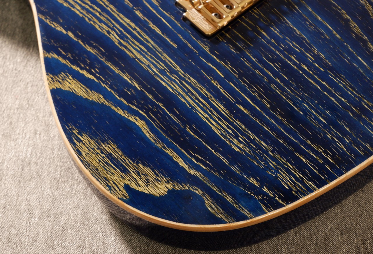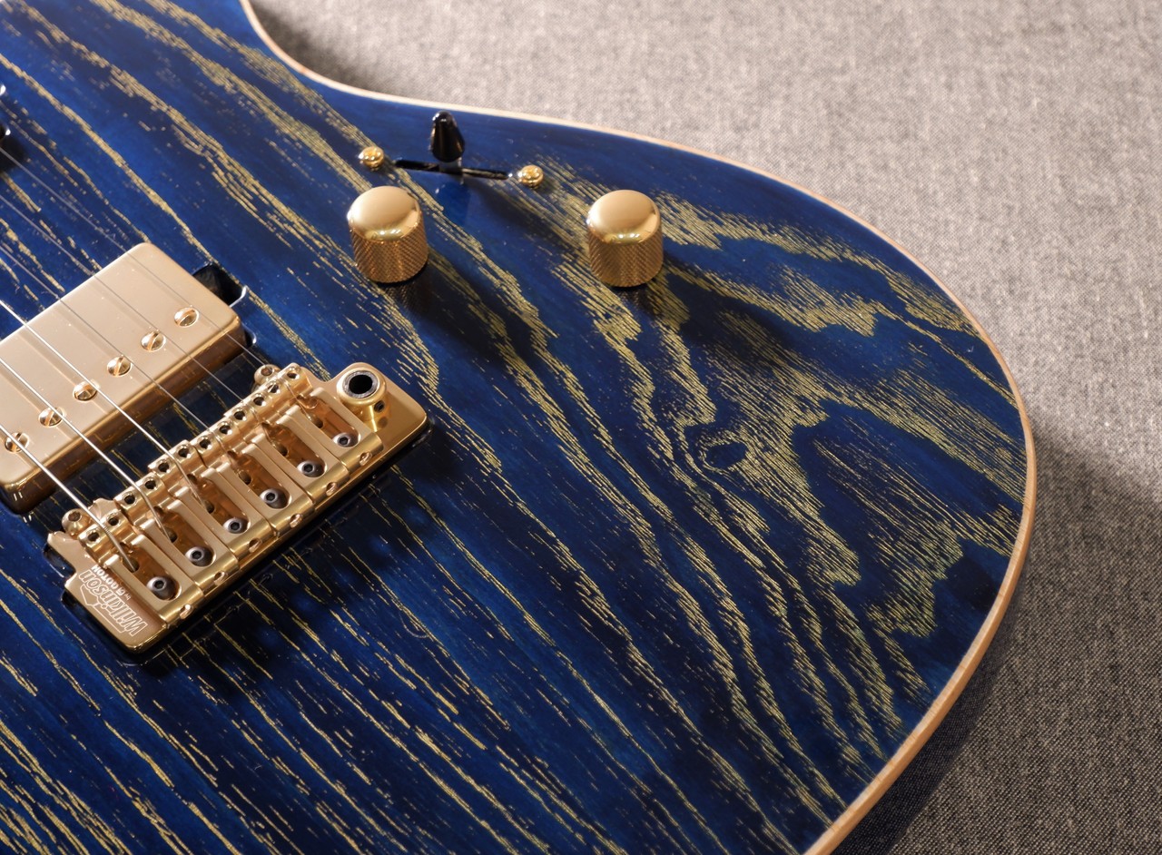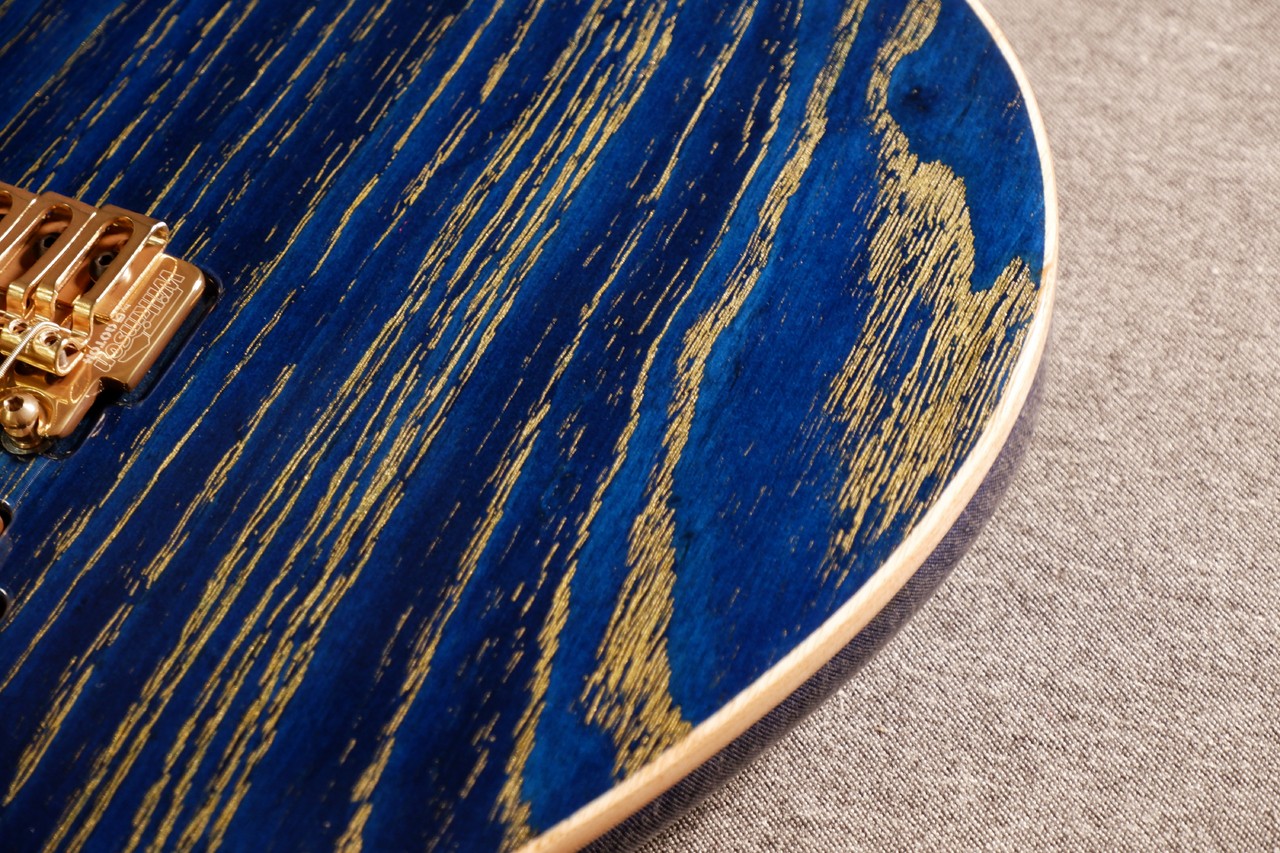 ソリッドな音色に定評あるDS496ですが、アッシュ単体にすることによってよりシングルコイルもお楽しみいただける1本となりました。アッシュ材が世界的に不足する中、墨入れを行ったときに映えるような杢目を選んでおります。アッシュの導管に入れる墨の色はゴールドを選択し、深みのある紺色との相性は抜群。ボディにはナチュラルバインディングが入っておりますので、全面同じ色での塗装を行っておりますが、輪郭がしっかりとしてより高級感を高めました。
