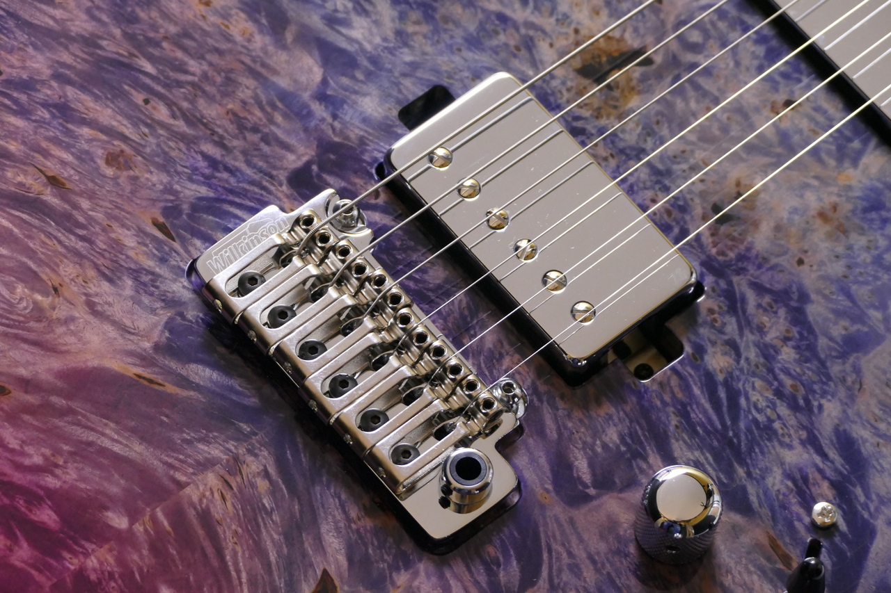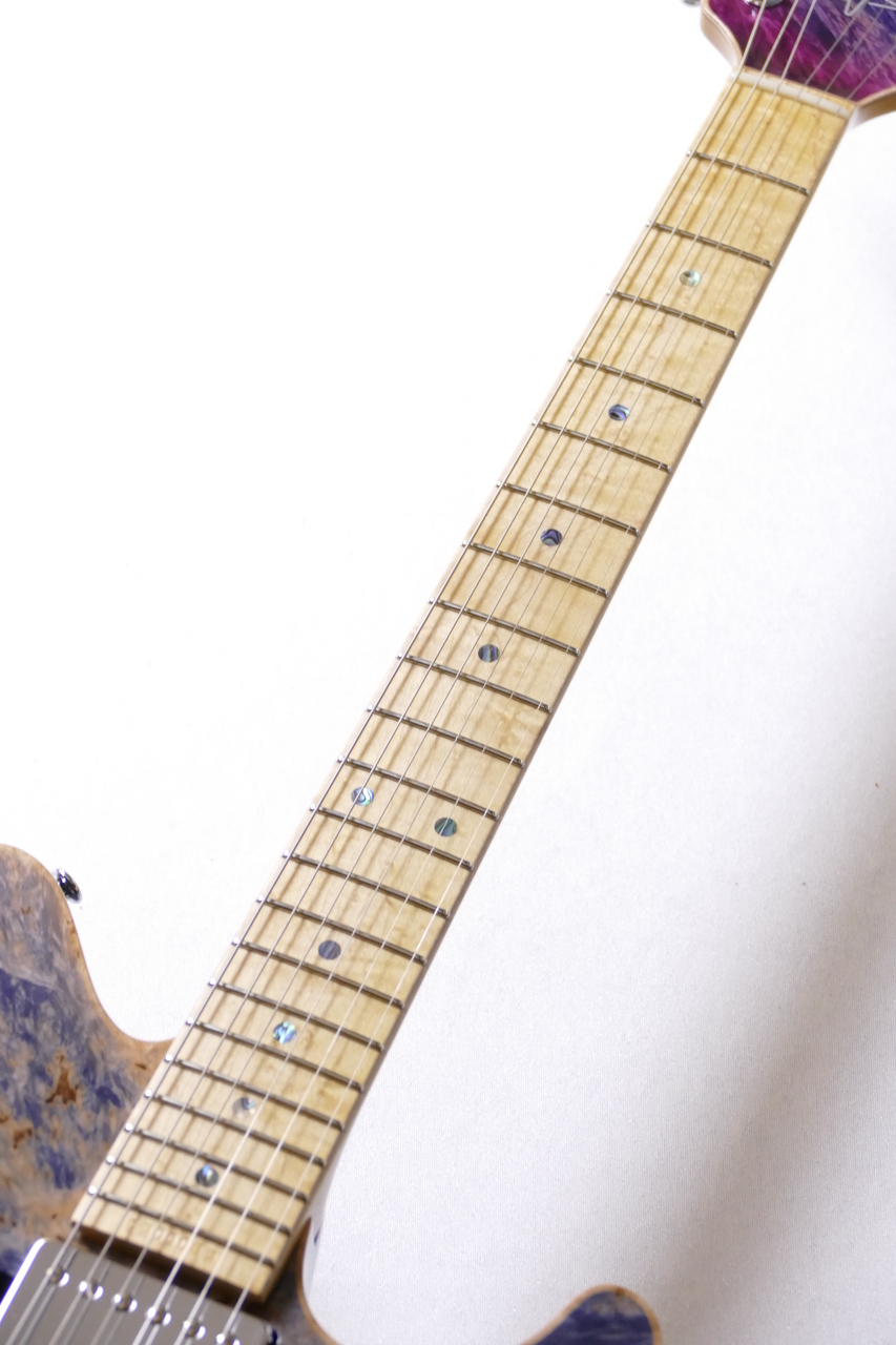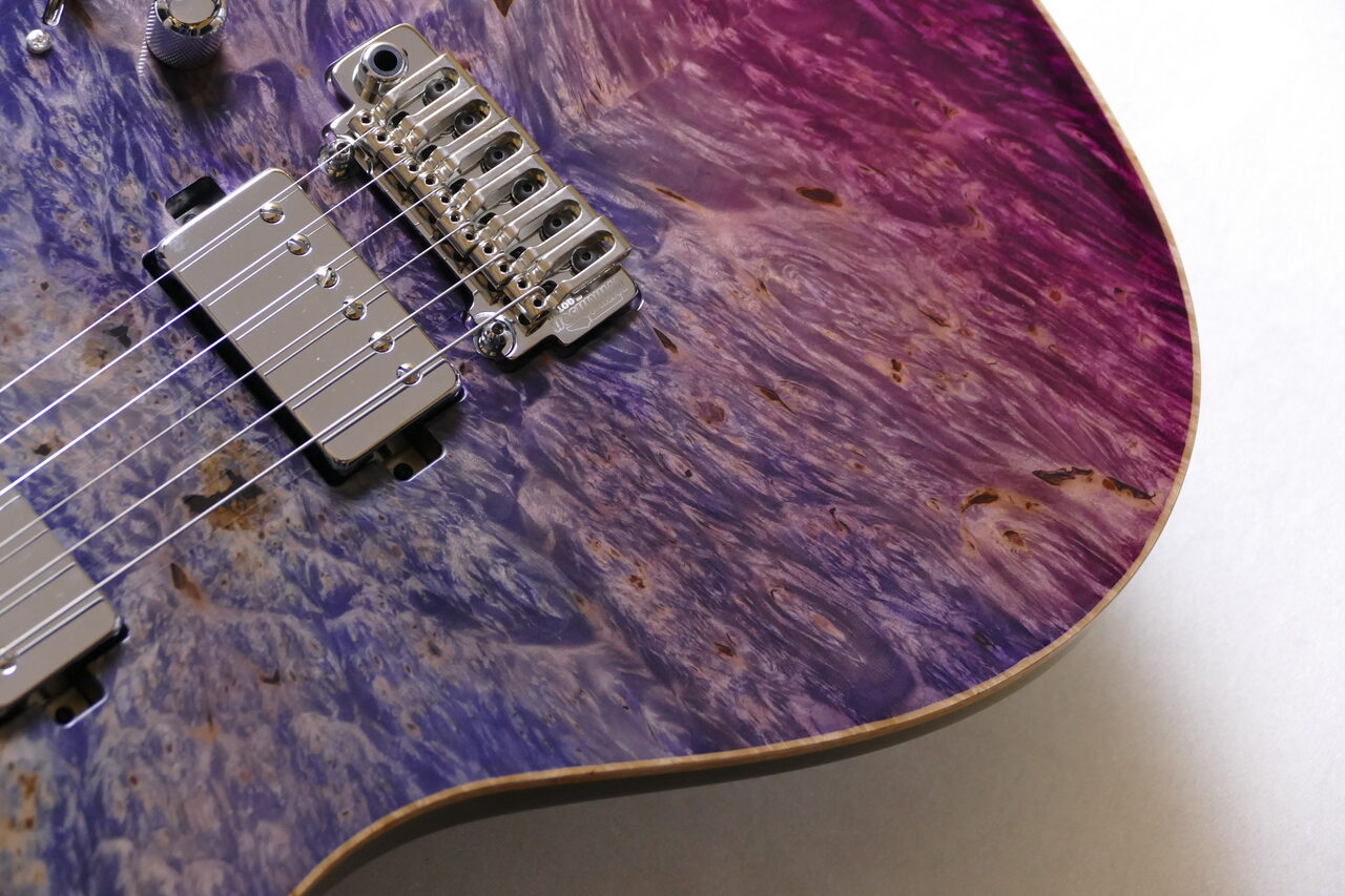当店スタッフが現地にて選定したバールメイプルをボディトップに採用!細かく均等に杢目が入っていおります。カラーはパープルからブルーのフェードでオーダー。トップ材と相性が良くとても美しい仕上がりに、、、!