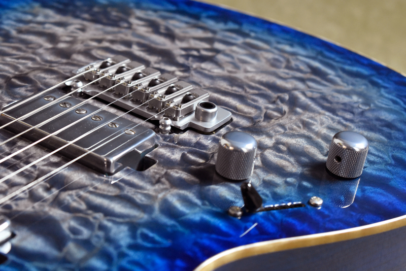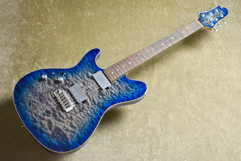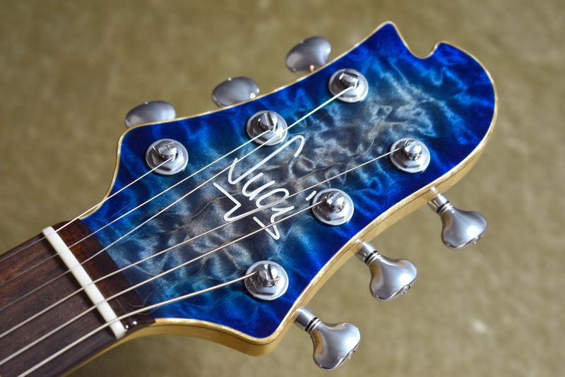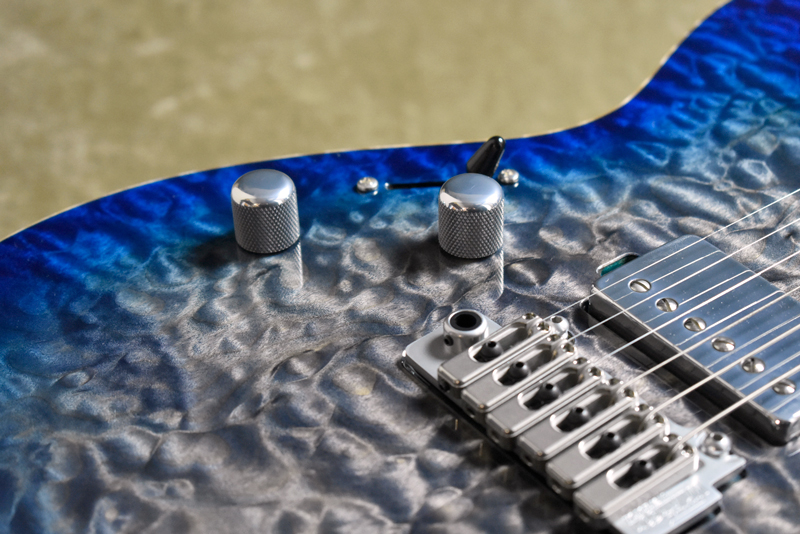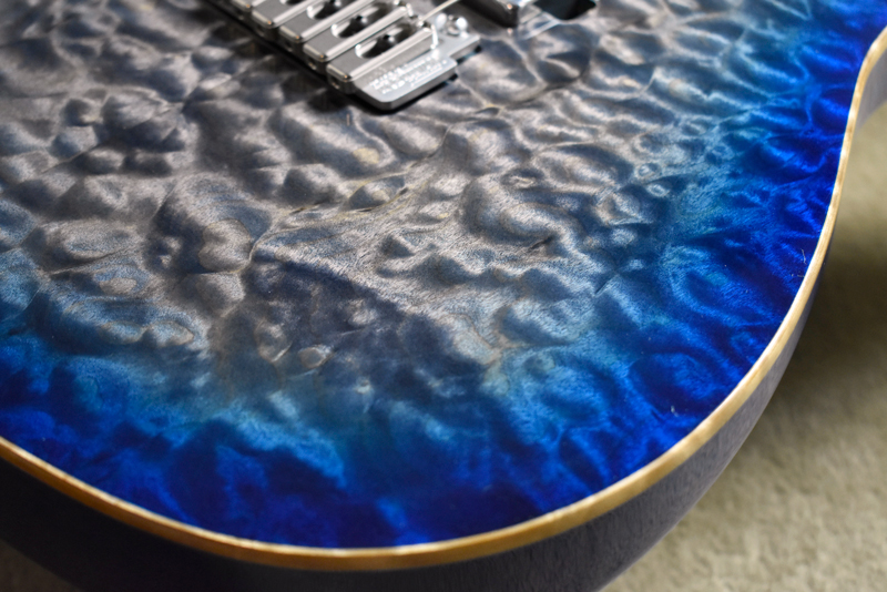 こちらは「Marverick Quilted Maple」の名通り、異端児なSugi最上位クラスのTOP材。通常であれば5Aのキルトですが、節があることによって価格を抑えることが可能になりました。カラーは派手になりすぎないネイビーブルー。極上の杢目と合わさって息をのむような美しさになっております。