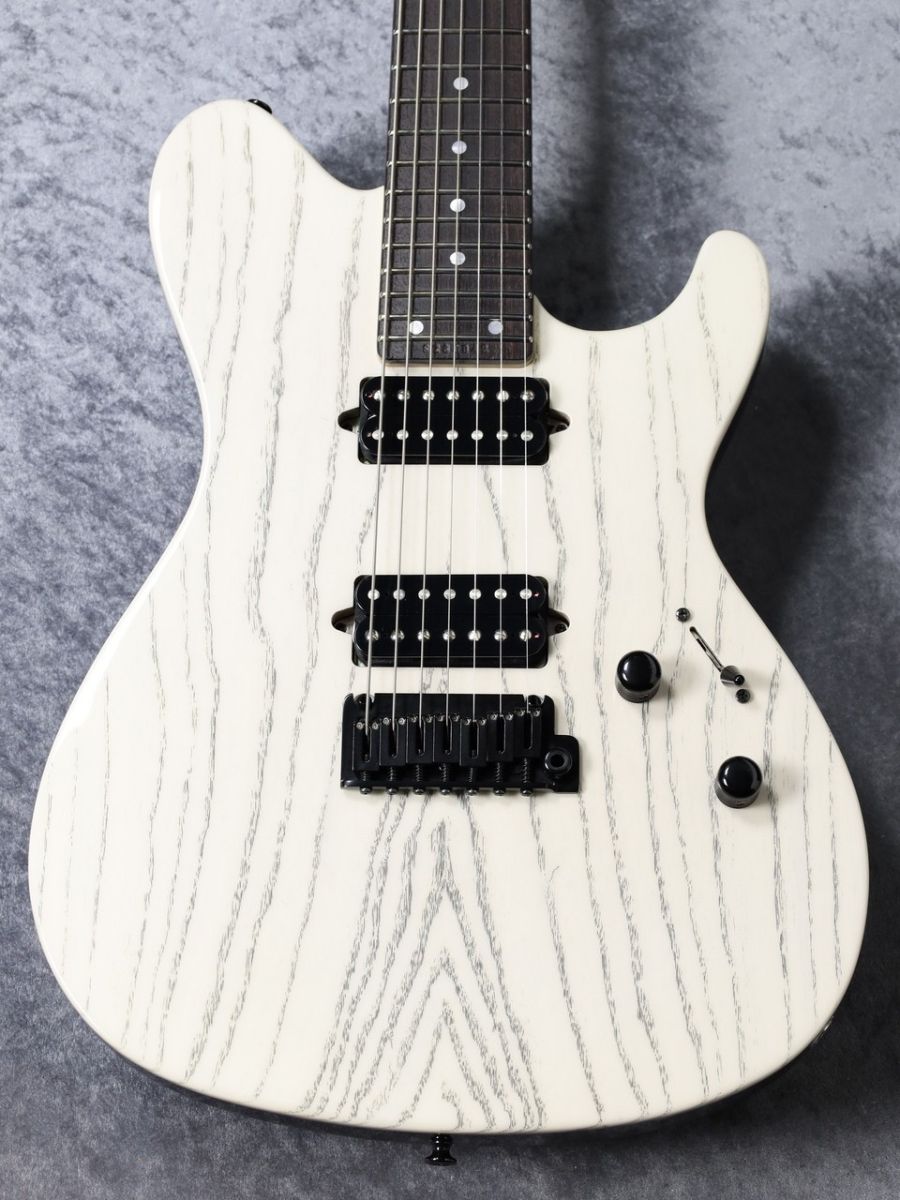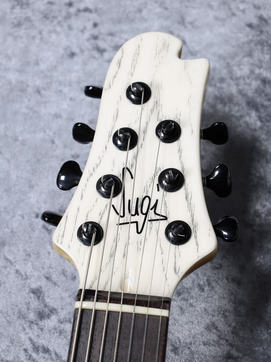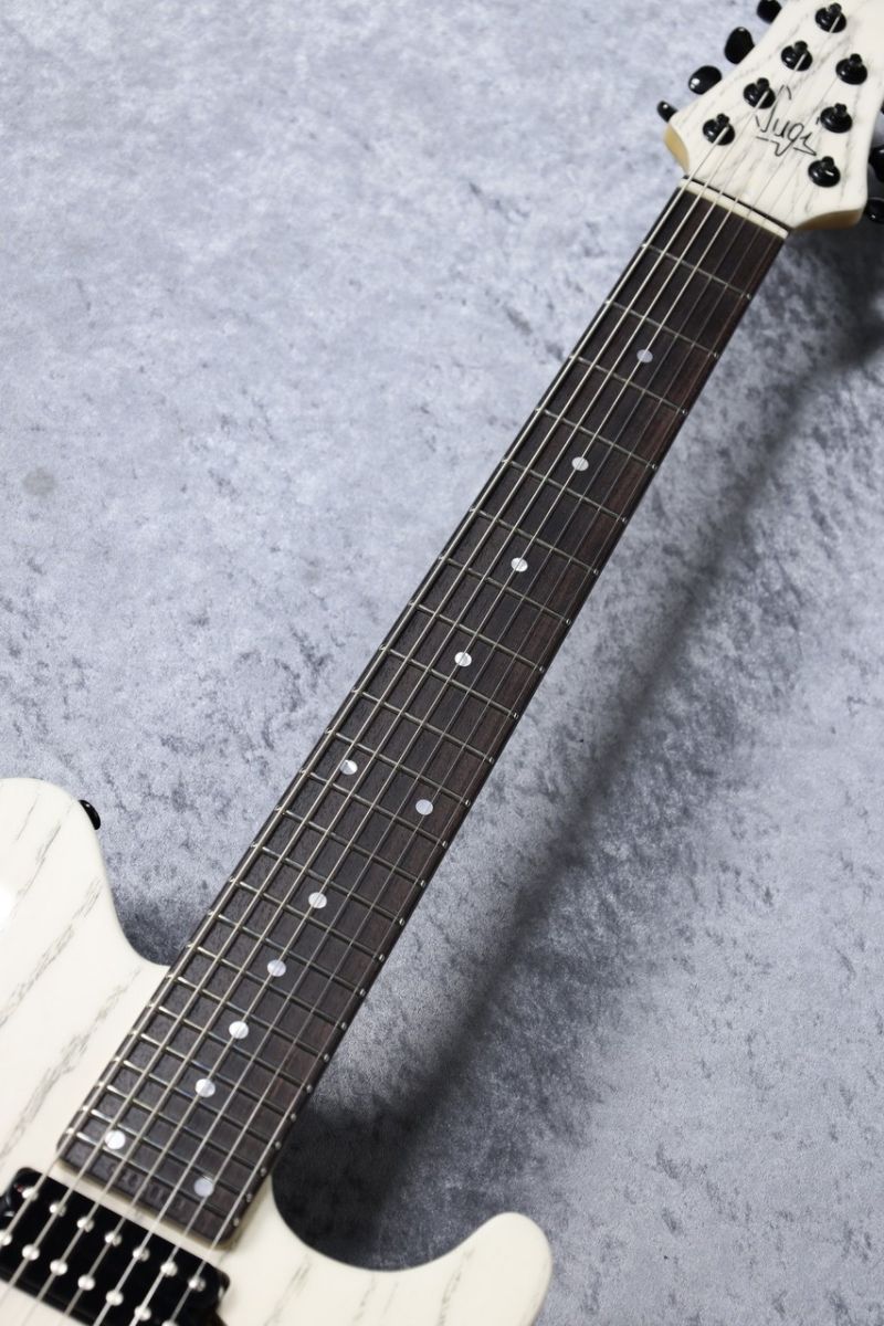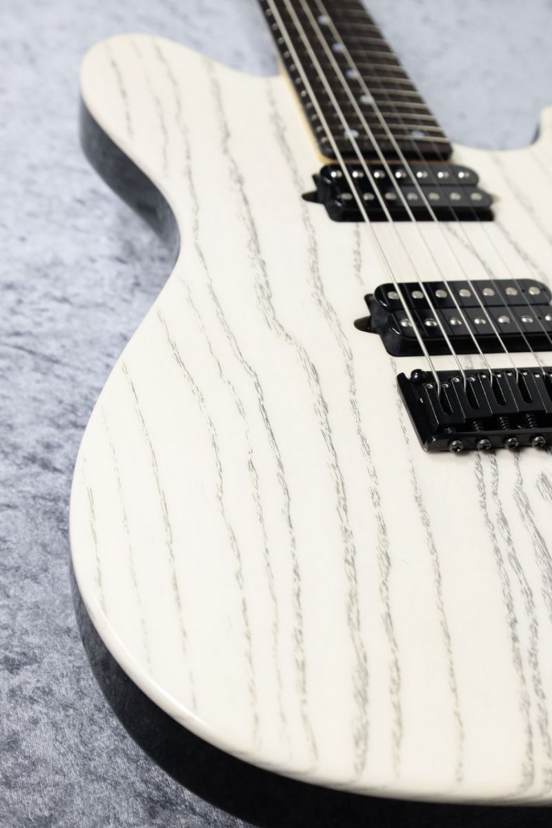 年間12本しか製作されない、Sugi 幻の7弦が入荷いたしました!シンプルなルックスが非常にカッコ良い1本でございます。こちらは非常に人気の高いカラーリング「Flosty Ivory」というカラーリング。アッシュの杢目に墨入れを行い、最大に杢目を活かした美しいルックスになりました。DS7ならではの嬉しい24F設計、更にはブラックのパーツで白×黒のバイカラーで統一。大変貴重な1本になりますので、気になる方は是非お早めにお問合せ下さいませ。
