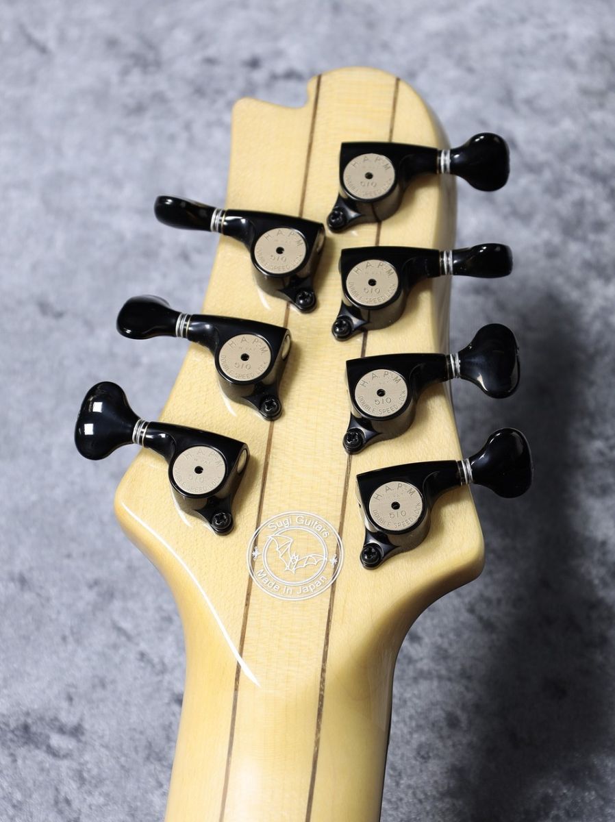 通常モデルと同じく、5WAYのレバースイッチにより、サウンドバリエーションが豊富です。フロントハム・フロントシングル・ハムのミックス・シングルハーフトーン・リアハムの多彩なオートコイルタップ。シングルのハーフトーンという絶妙なセレクトが更に選択肢を広げてくれます。Sugi らしくタイトなサウンドで、その特徴は7弦にもよく活かされております。前述した通りクリアなサウンドでございますので、ハイゲインな音作りをしてもサウンドは潰れません。他ブランドにない作りこみの精度の高さ、ソリッドな Sugi サウンド。クリアでコードの分離感も楽しむことができます。