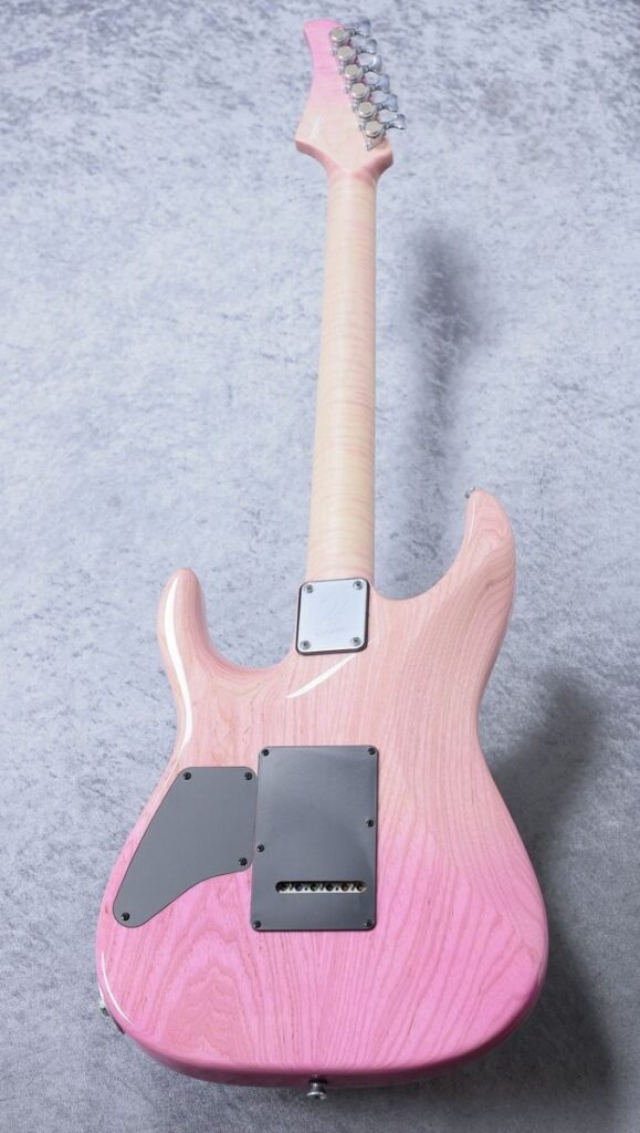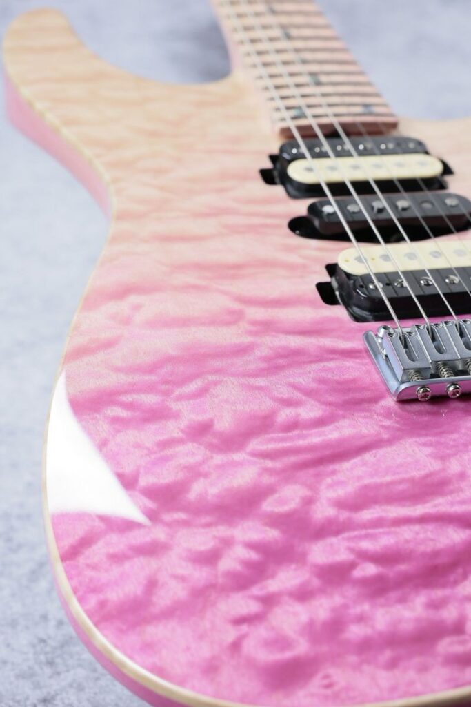 ネックも美しいフレイムメイプルを採用しており、贅の限りをつくしております!そんな杢目の上には「Faded Pink」を選んでおり、ヘッドからグラデーションカラーを採用しました。地の色も生かしたカラーリングで、陰影も美しい1本。