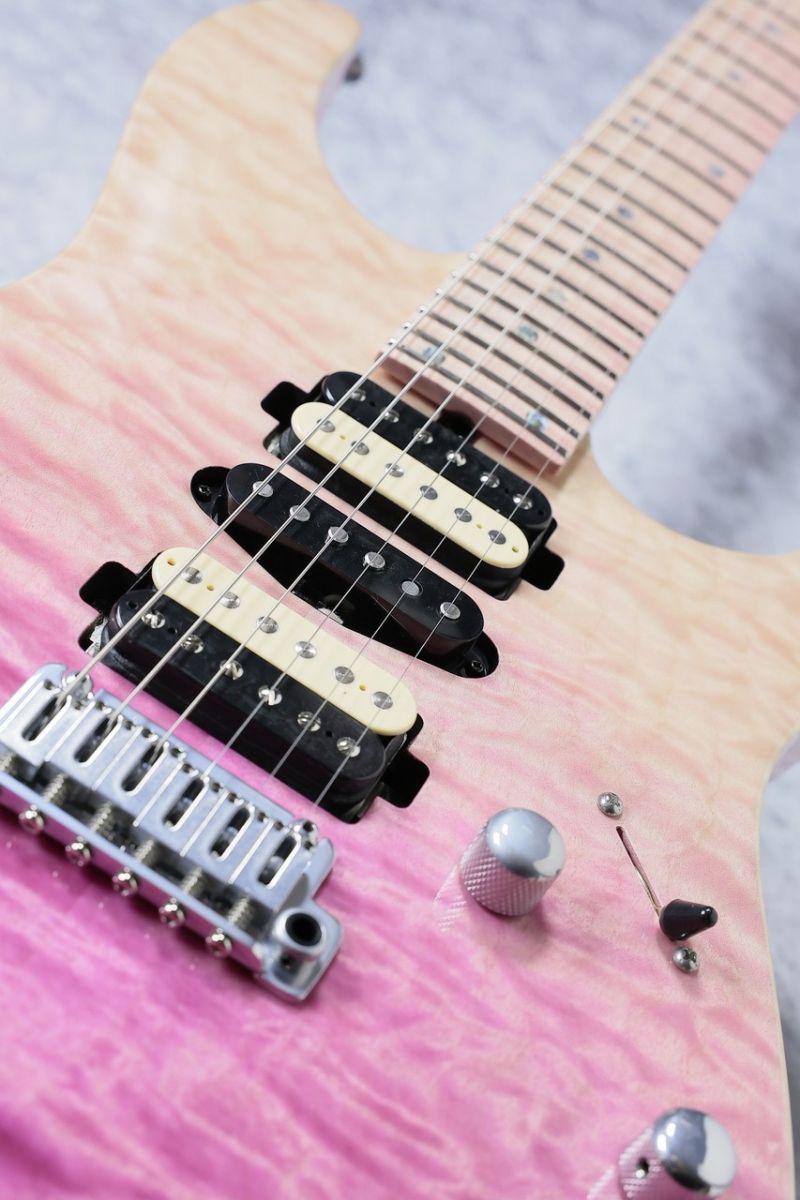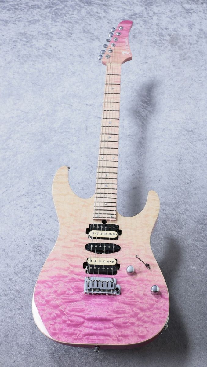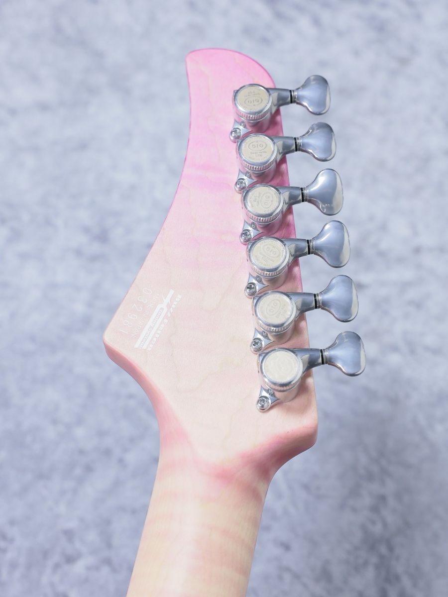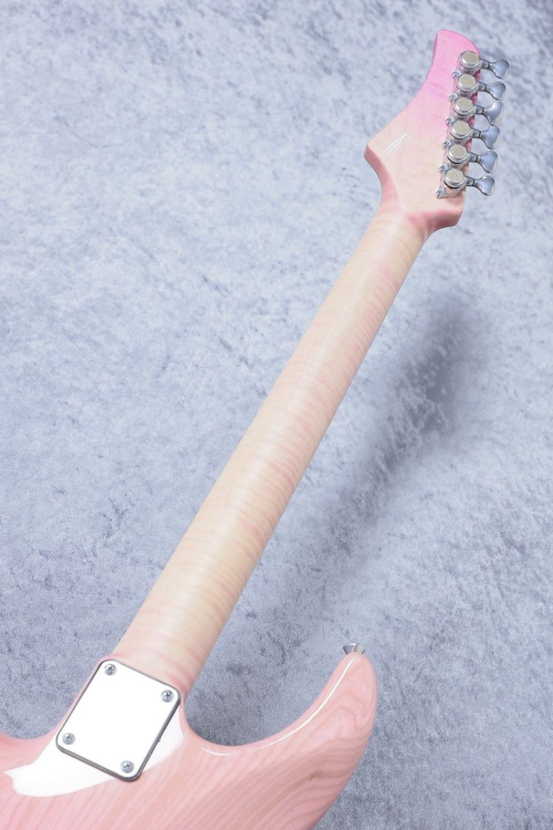 ネックも美しいフレイムメイプルを採用しており、贅の限りをつくしております!そんな杢目の上には「Faded Pink」を選んでおり、ヘッドからグラデーションカラーを採用しました。地の色も生かしたカラーリングで、陰影も美しい1本。