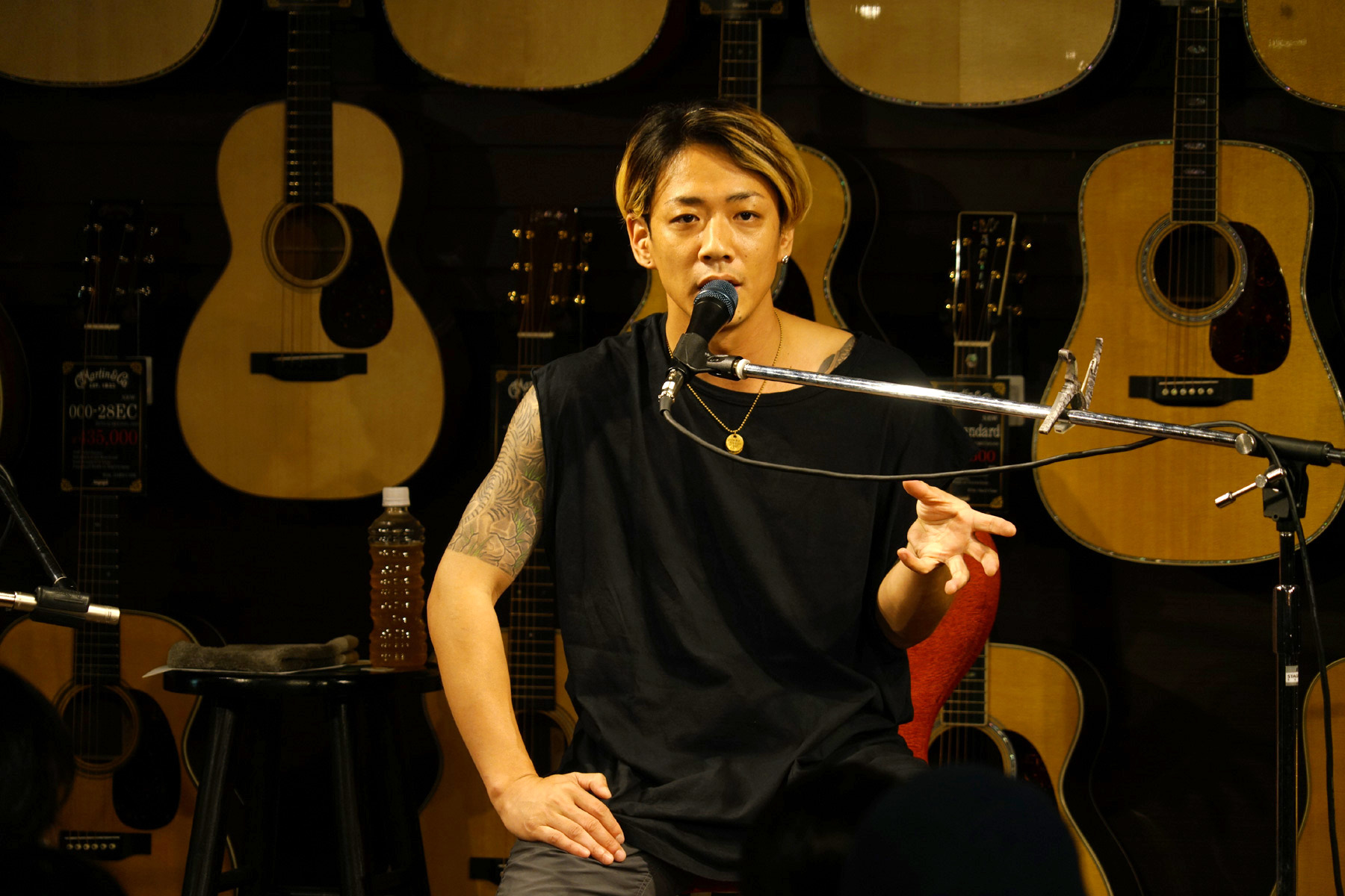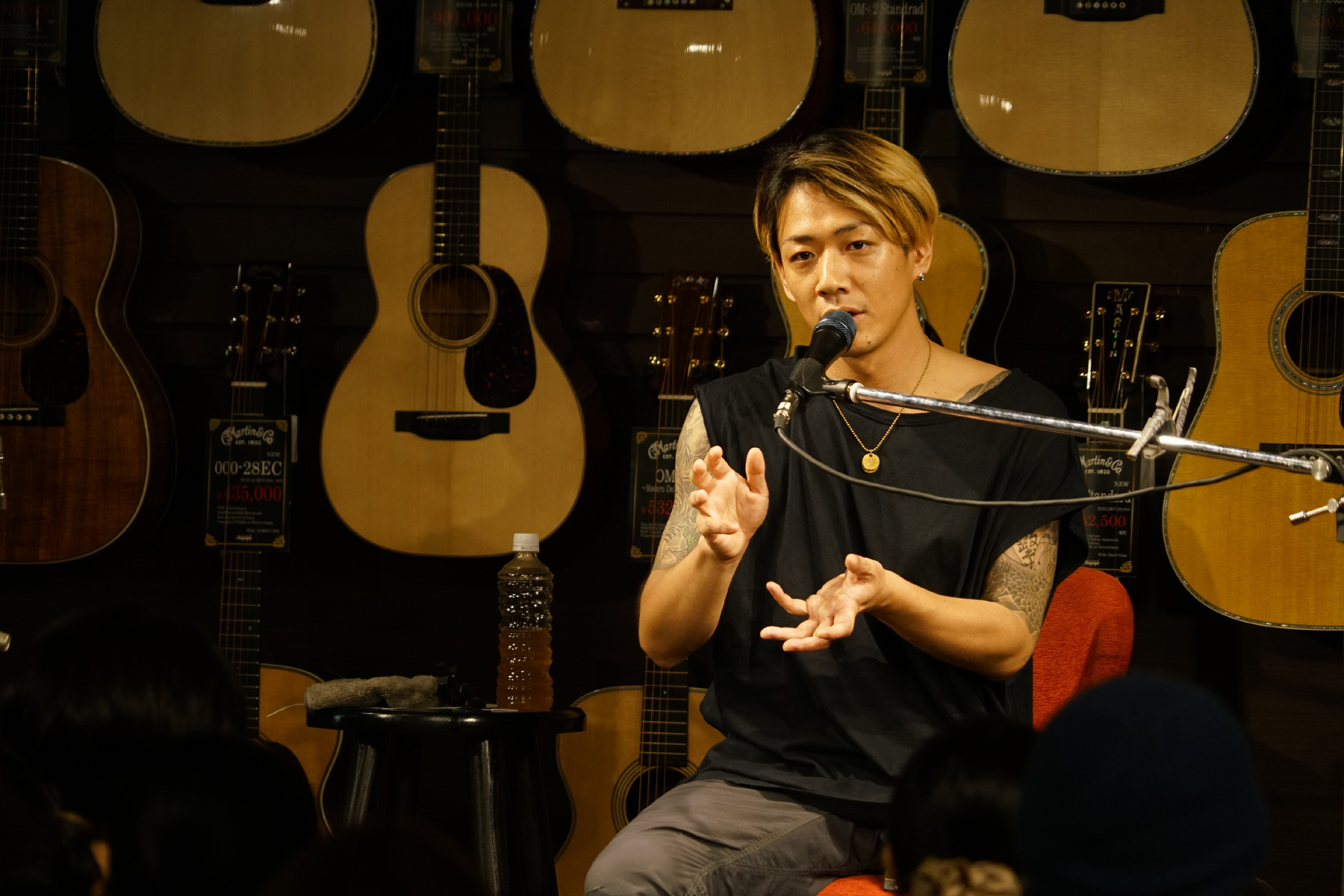 演奏後は実演を交えながら、「俺はマホガニーの音が好きなんですよ。中でもこれ(GP-18E)は、ガッと強く弾いた時にも音がつぶれずにいてくれる。だからIsolationのリフとも相性が良い。マホガニーの鳴りとトップ(表板)が上手く共鳴してくれている印象ですね」とコメント。