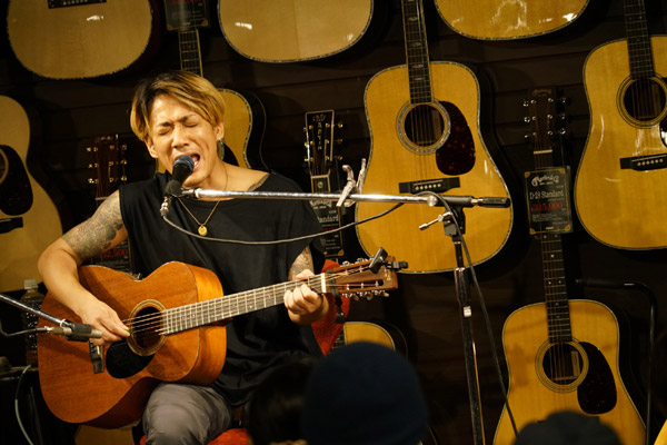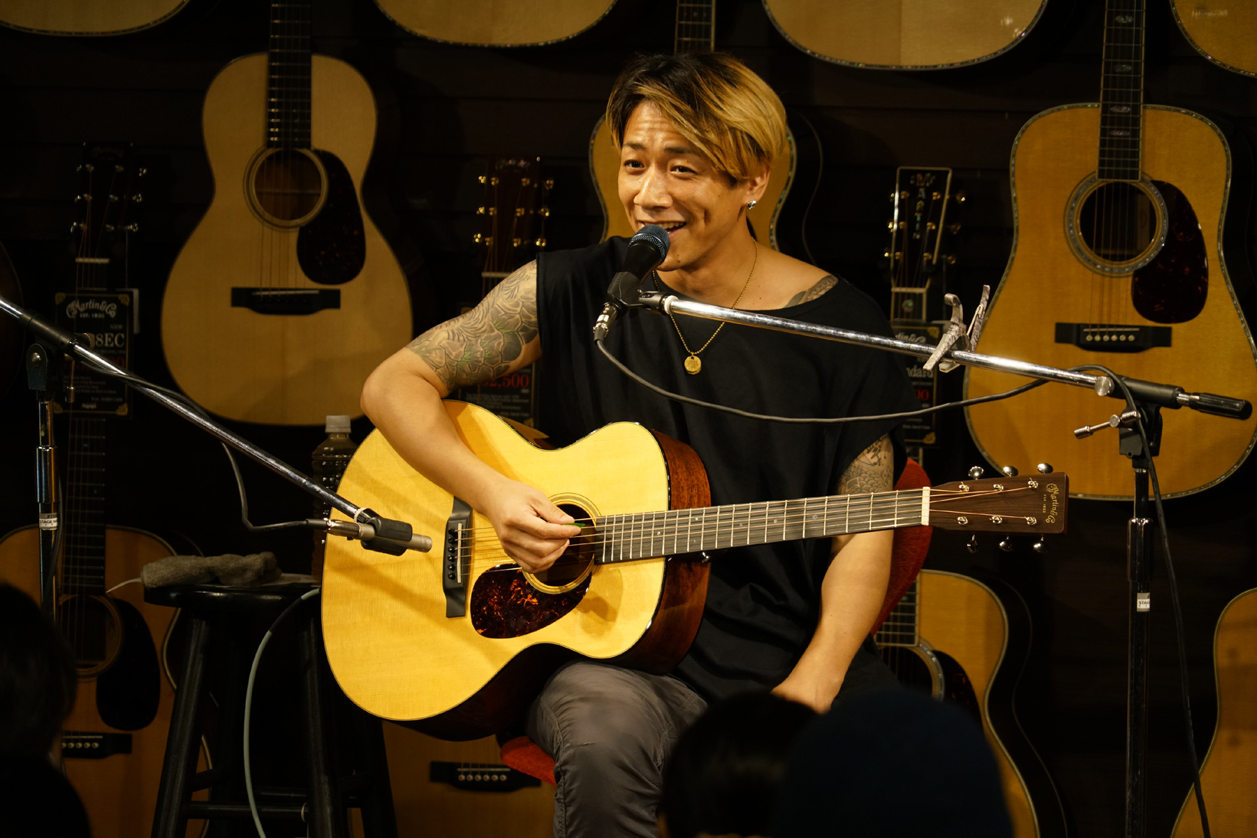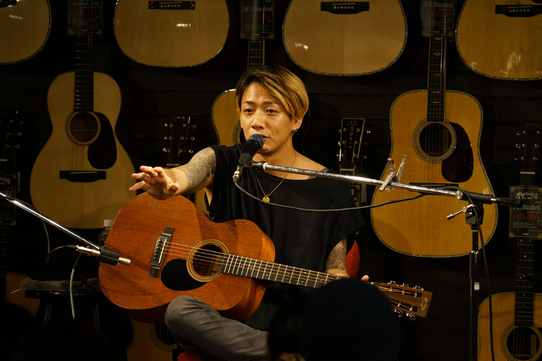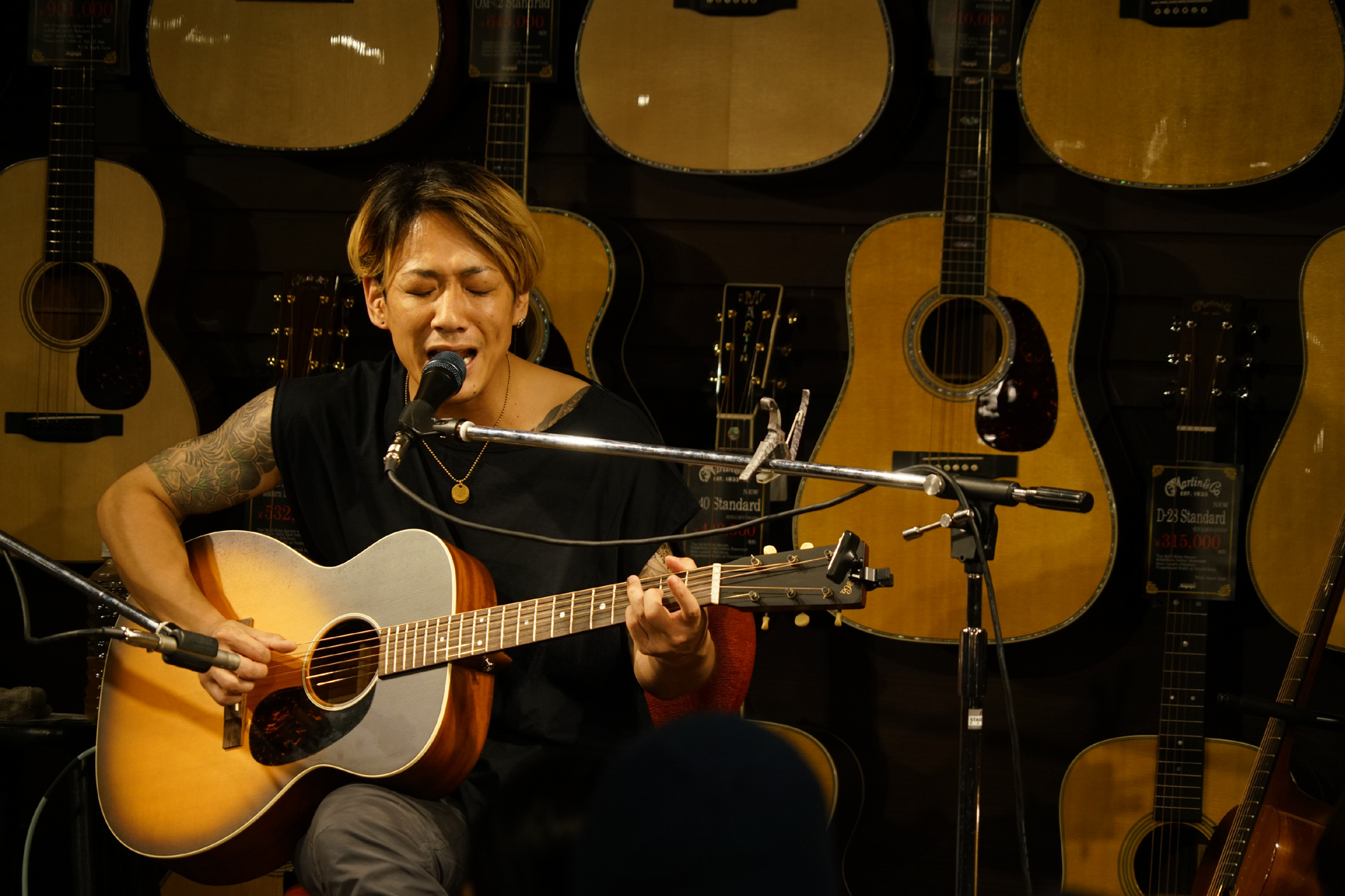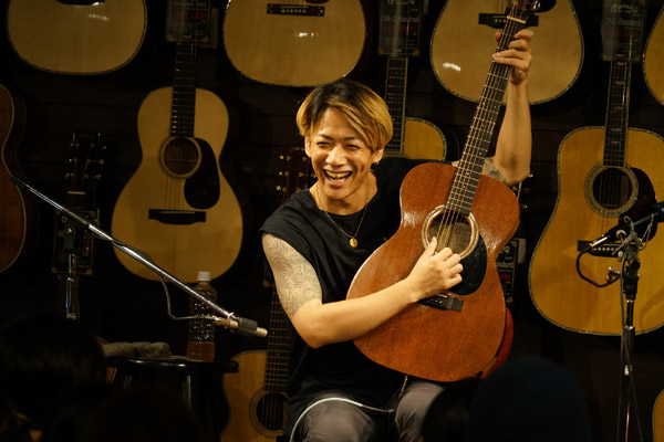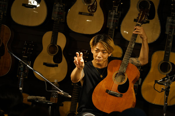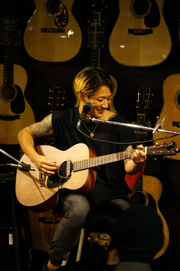 続く2本目では、オールマホガニー仕様のモデル「00-15M」を使って「青の雫」を演奏した。 「00-15M」は氏の愛用する「00-16DBM」と同様、トップ、サイド&バック材にマホガニーを使用したモデルだ。 自身の愛機、00-16DBMを指差しながら、「こいつにかなり近い。大好きな音色です。でも、より素朴感が強くて哀愁漂う印象ですね。青の雫と上手くマッチしてくれました」とコメント。