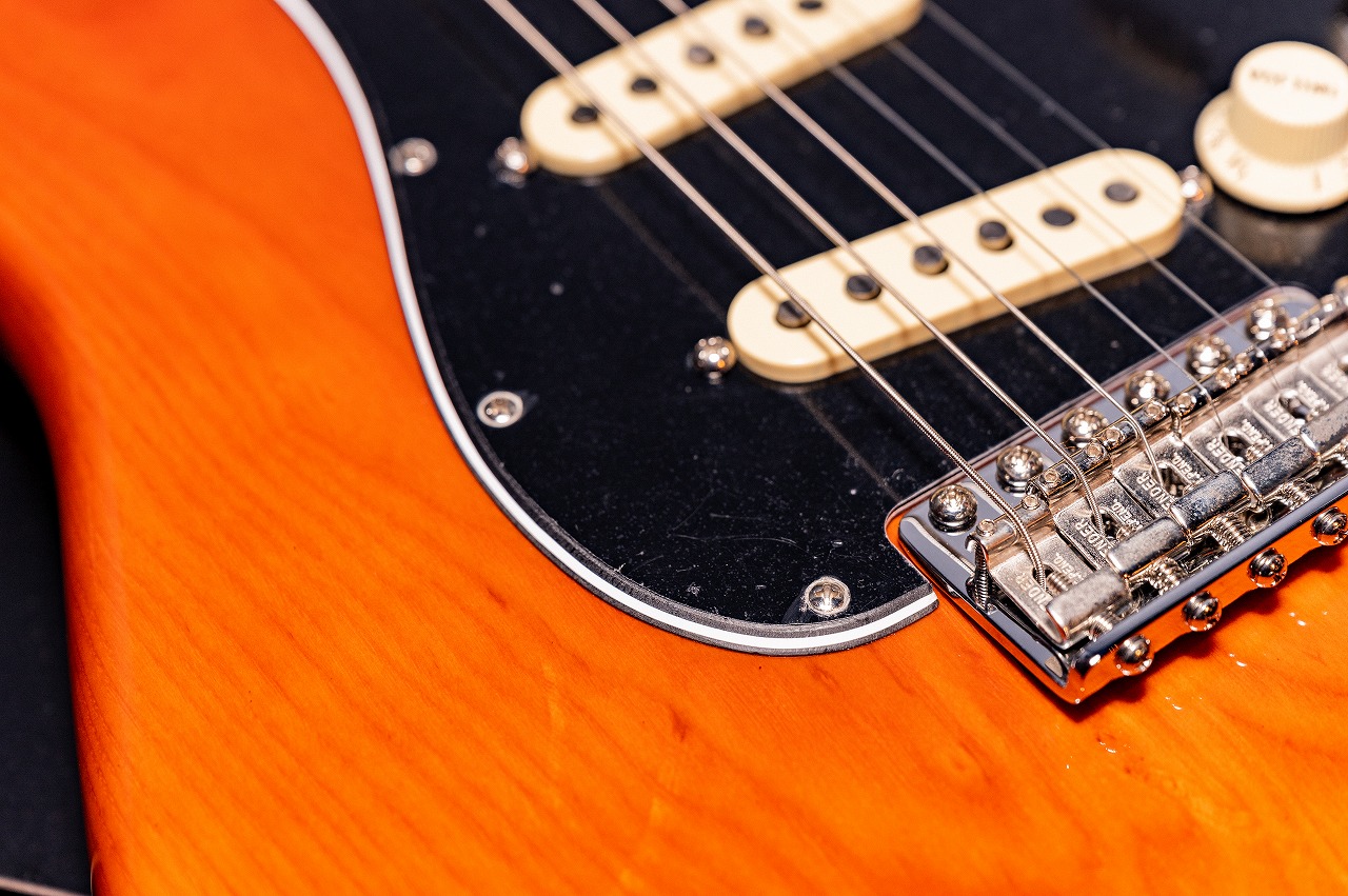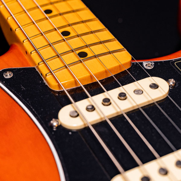 American Vintage II 1973 Stratocaster®は、Pure Vintage '73 Staggered Poleピックアップを3基搭載し、デュアルストリングツリー仕様のラージヘッドストック、ヘッドに配置された便利なBulletスタイルトラスロッドナット、Micro-Tilt™付きの3ボルト式ネックプレートなどを装備しています。1973 “C”シェイプのメイプルネックに21本のヴィンテージトールフレットを配した7.25インチラジアスのメイプルまたはローズウッド指板を採用し、まるで1973年に舞い戻ったかのような、当時の楽器の演奏性を彷彿させます。フェンダーのアイコニックなギターシェイプを讃えて開発されたAmerican Vintage II 1973 Stratocasterは、アッシュボディにLake Placid Blue、Mochaという2種類のフィニッシュをラインナップしています。MochaはStratocasterでBlackピックガードを採用した初のモデルです。その他、ヴィンテージスタイルのFロゴチューニングマシン、ベントスチールサドルとコールドロールド(冷間圧延)スチールブロック付きのシンクロナイズドトレモロといったプレミアムな仕様を備えています。
