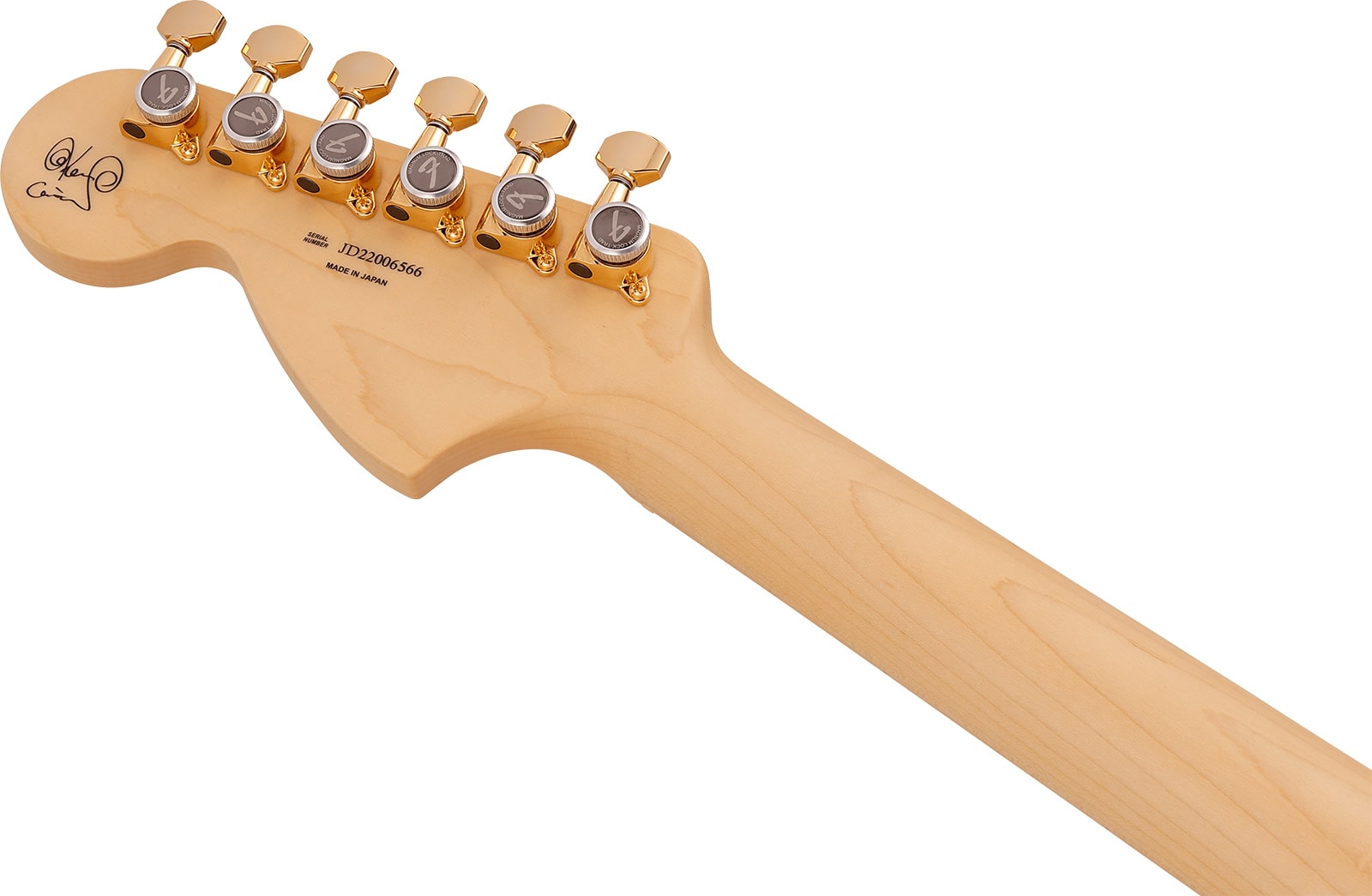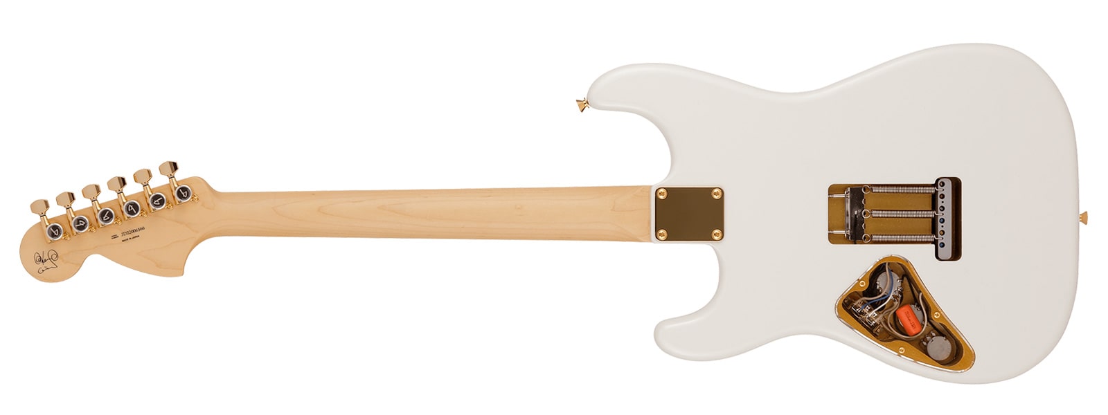 最小限のカットに抑えられたエルボーコンターはゴールドに塗装され、さらにアクリルのピックガードとコントロールパネルにより、ピックアップ、コントロール、スプリングのキャビティまでゴールドに塗装されているのが見て取れます。また、本人の実機からプロファイルされたこだわりの太いネックとバックコンターを敢えて無くした剛性の高いボディに直付けにされたピックアップ『V-Mod II』と『Fat 50s』の組み合わせによってKenの理想のサウンドを実現しました。