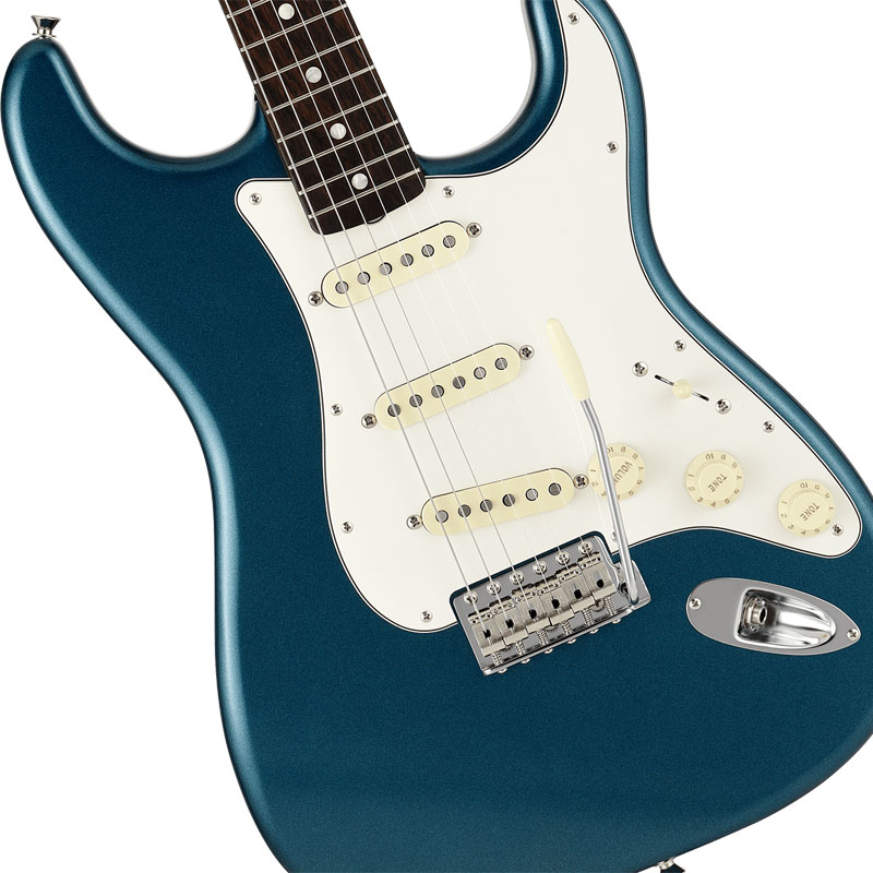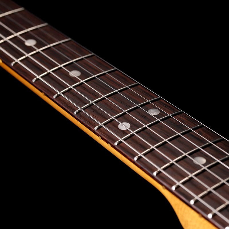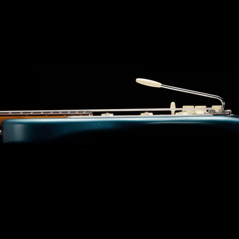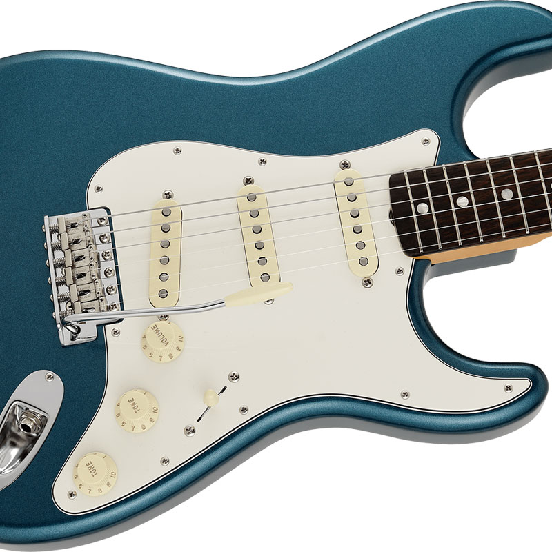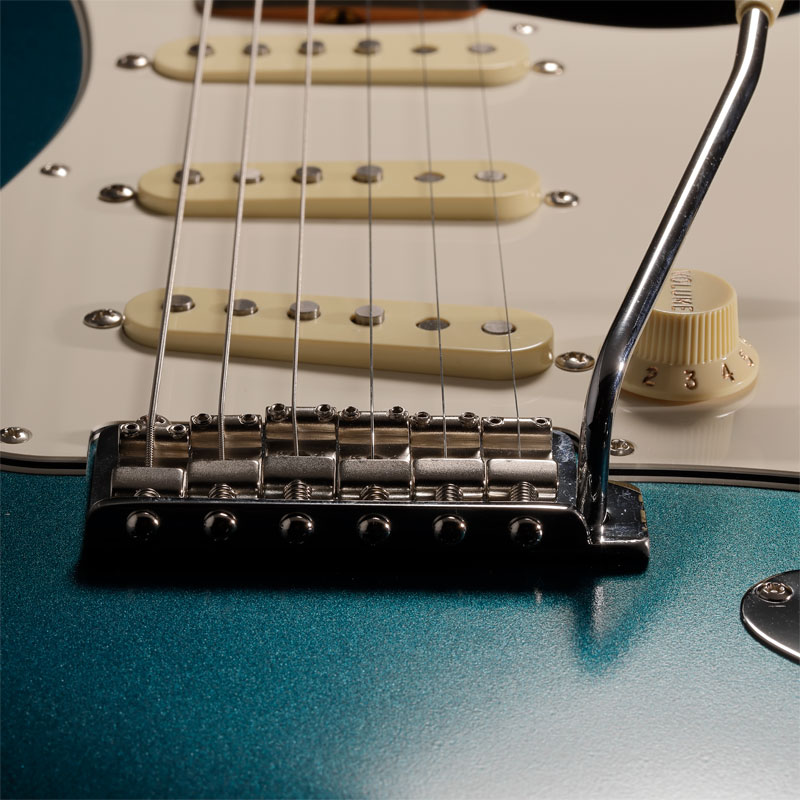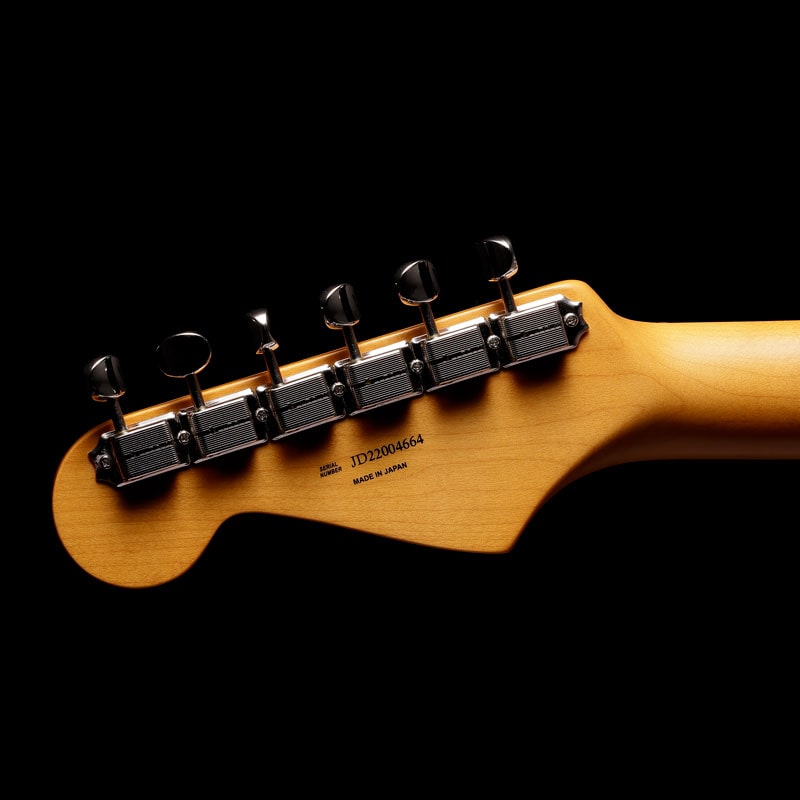 ボディを覆う"Paradise Blue"はLake Placid Blue が経年変化で深みを増した特有の色味を再現しながらメタリックを強めたこだわりのオリジナルカラー。トップコートのニトロセルロースラッカーは最小限に抑えられ、ヴィンテージのような鳴りとルックスをより早く楽しめる仕様となっています。本人実機からプロファイルされたネックは7.25インチラディアスのラウンドローズ指板に約41mmのナット幅と薄目の1965"C"シェイプとなっており、ヴィンテージの握り心地を忠実に再現しつつ、Narrow Tallフレットによりスムーズな演奏性を実現しています。