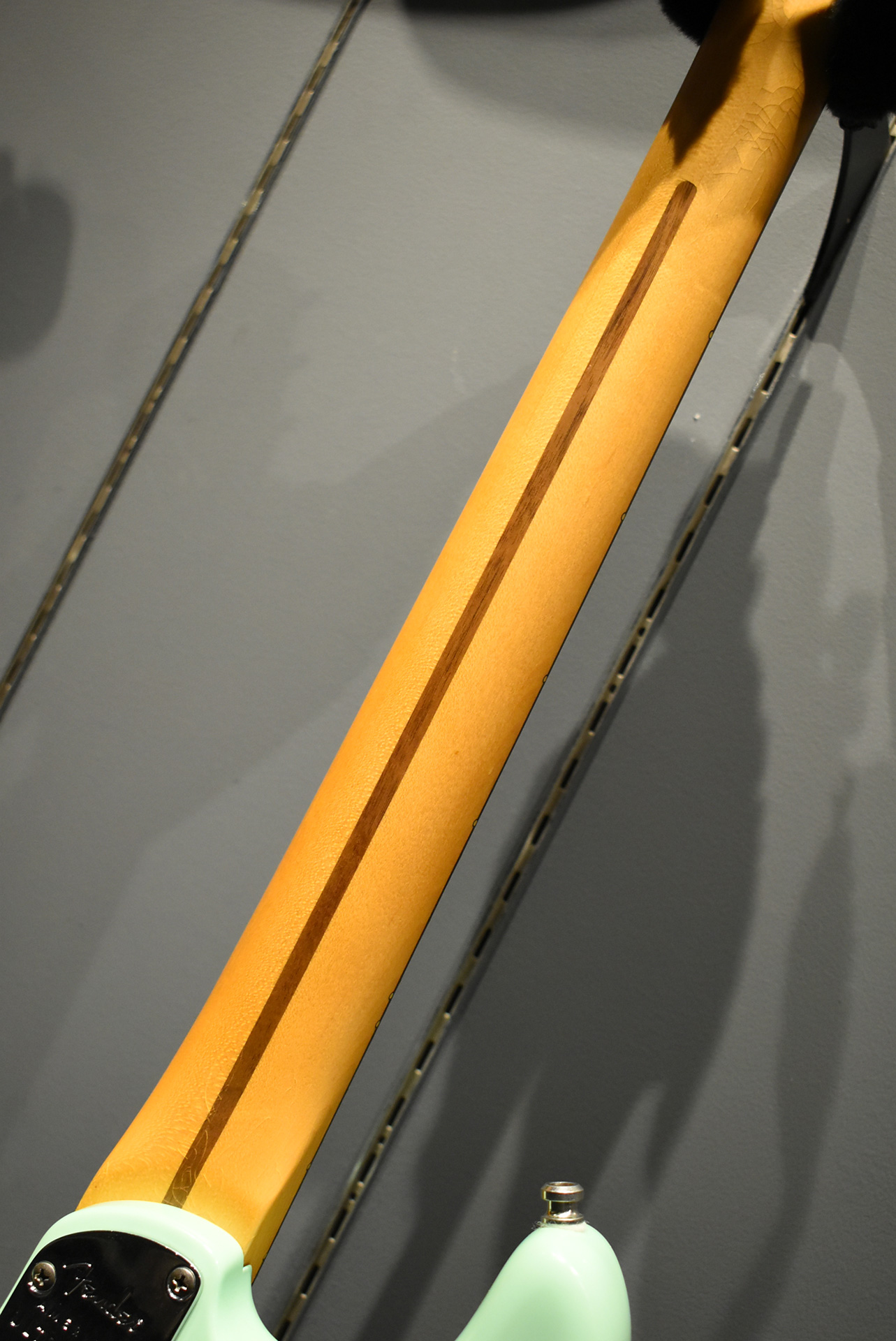 ネック裏はサテン仕上げながらエイジド加工が施されており、ヴィンテージのような外観とモダンな演奏性を両立。ヘッドのデカールも水貼り仕様になります。