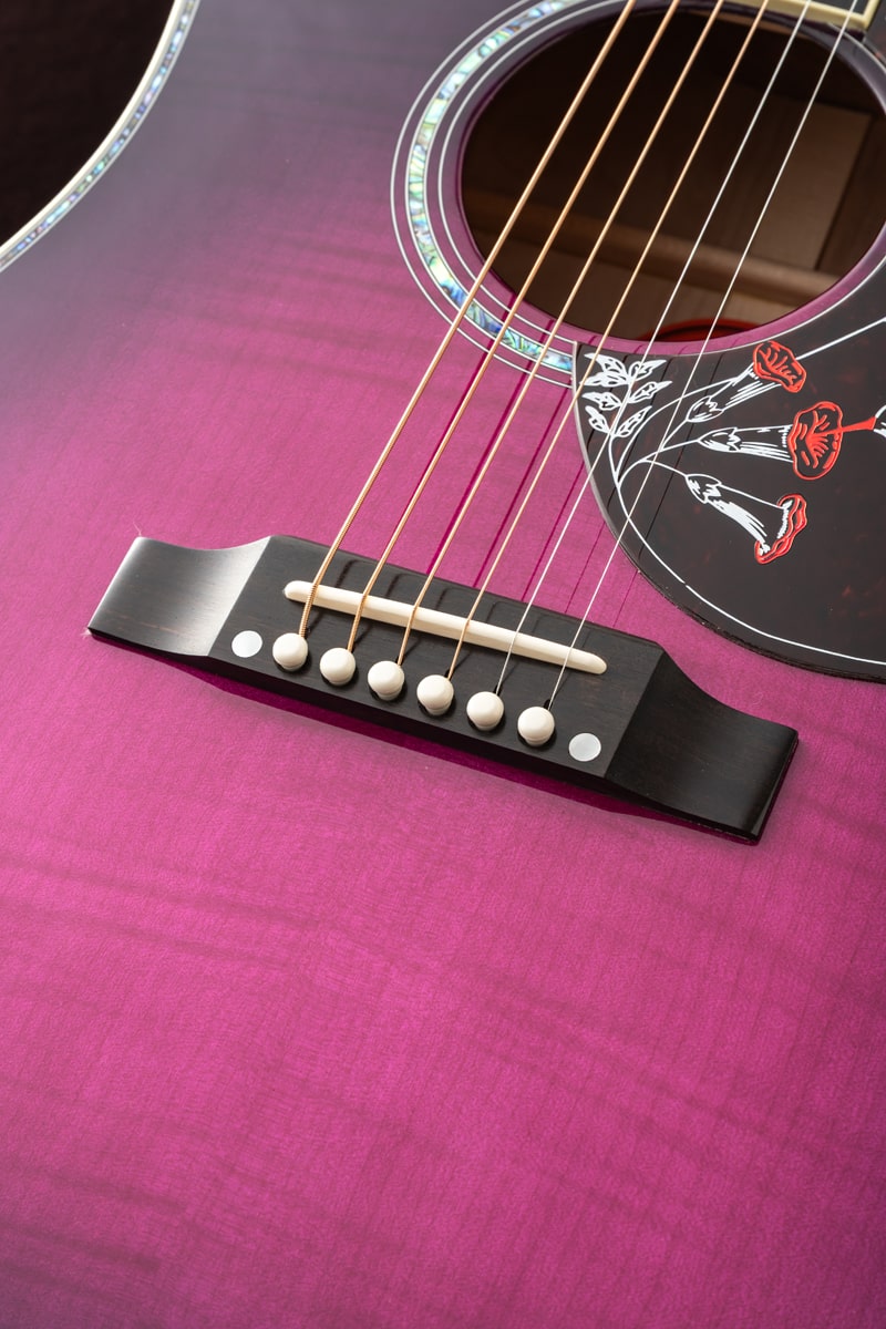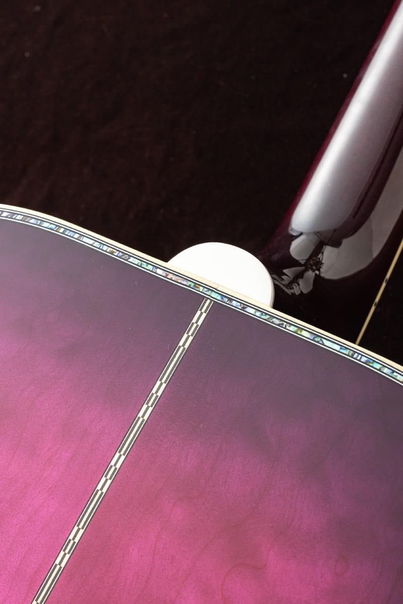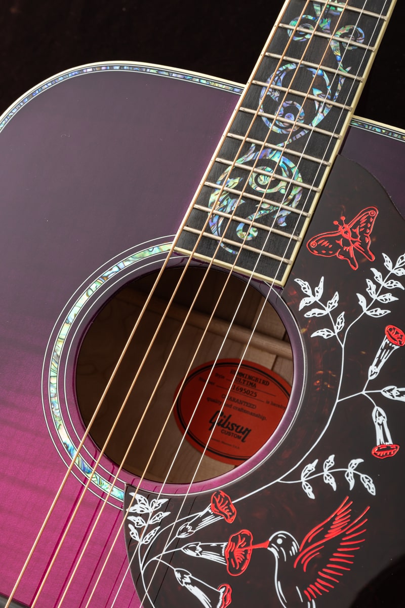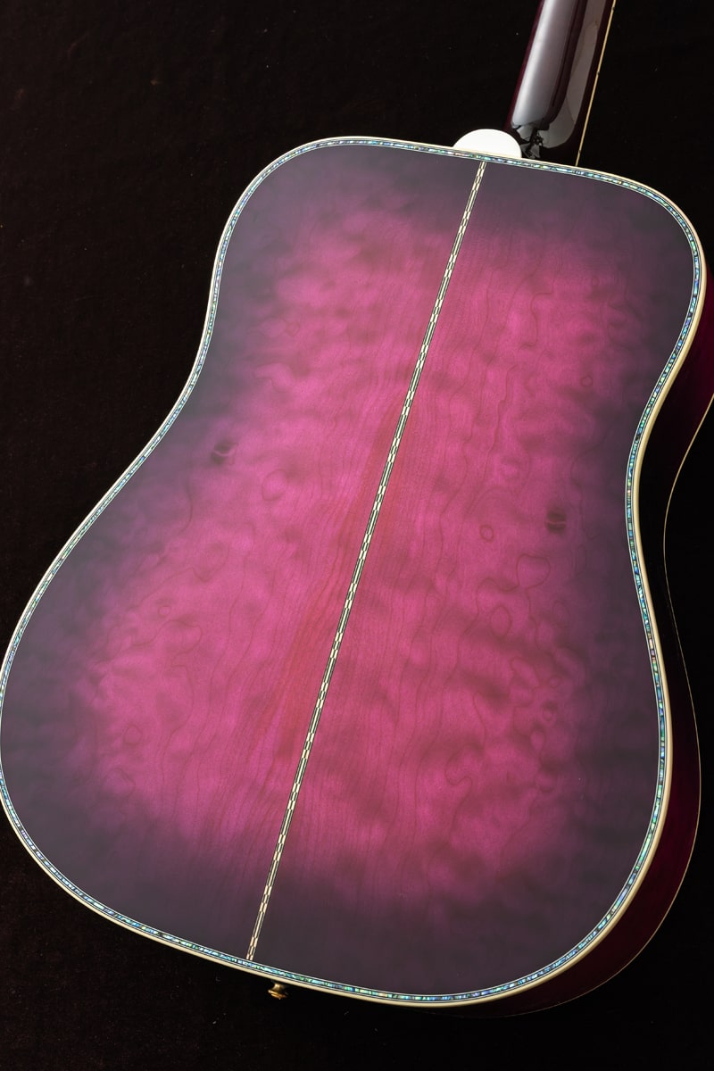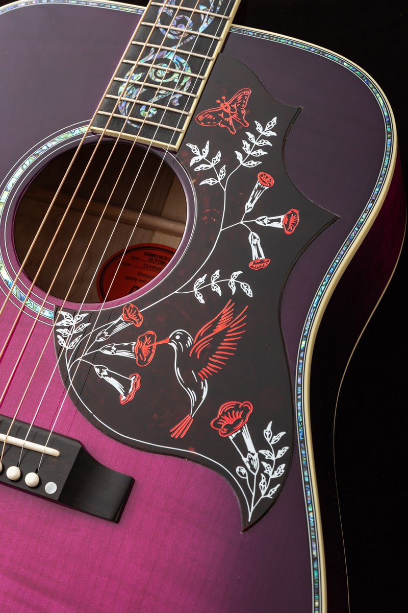 現地で出会った際に思わず心を奪われた、大変美しい1本です。究極のハミングバード、Hummingbird Ultimaを特別なMerlotカラーで仕上げています。パープルのグラデーションが極上メイプルの杢目をより一層引き立てております。トップに極上のフレイム・メイプル、サイドバックにキルト・メイプルを使用。厳選された二種のメイプルを組み合わせた、かつてない仕様です。一般的なハミングバードはローズウッド指板ですが、本器はエボニー指板を採用。ヘッドストックと指板にはゴージャスなAbalone Vine装飾が細やかに施されております。多層ボディバインディングにも惜しげもなくアバロンを配し、その輝きは只ならぬ風格を醸し出しております。
