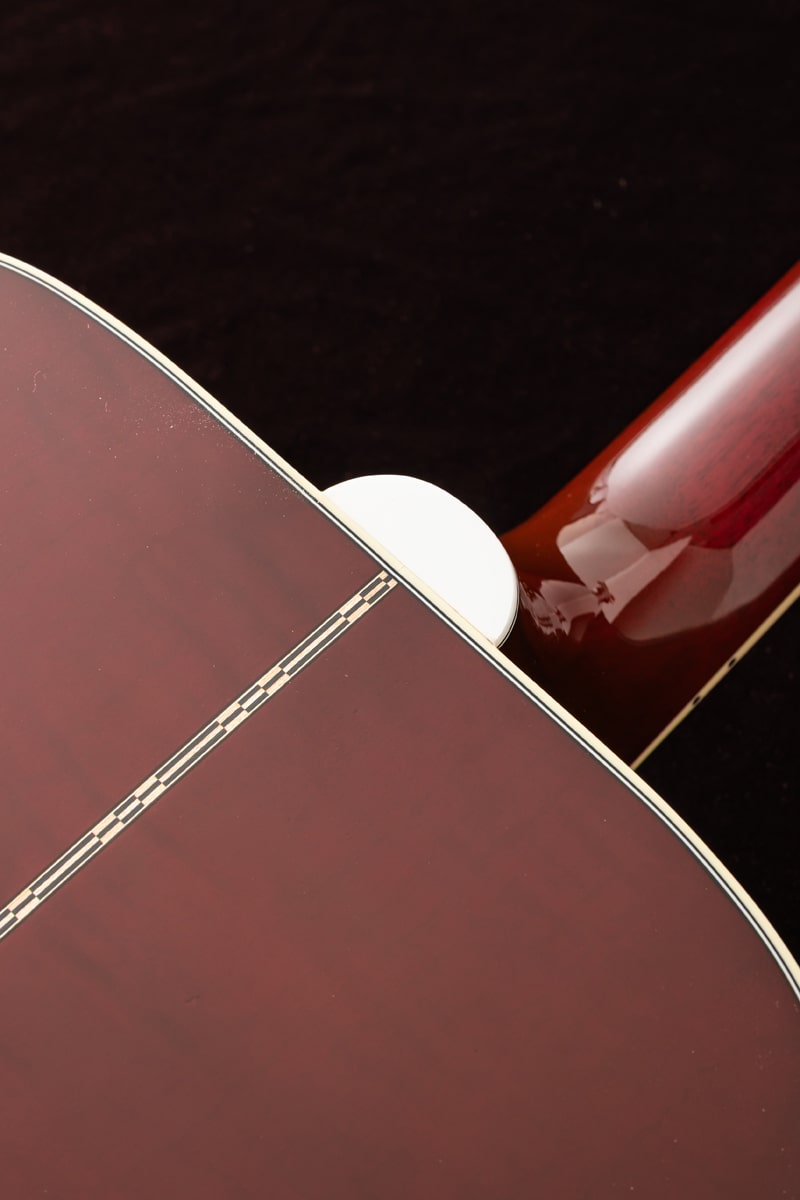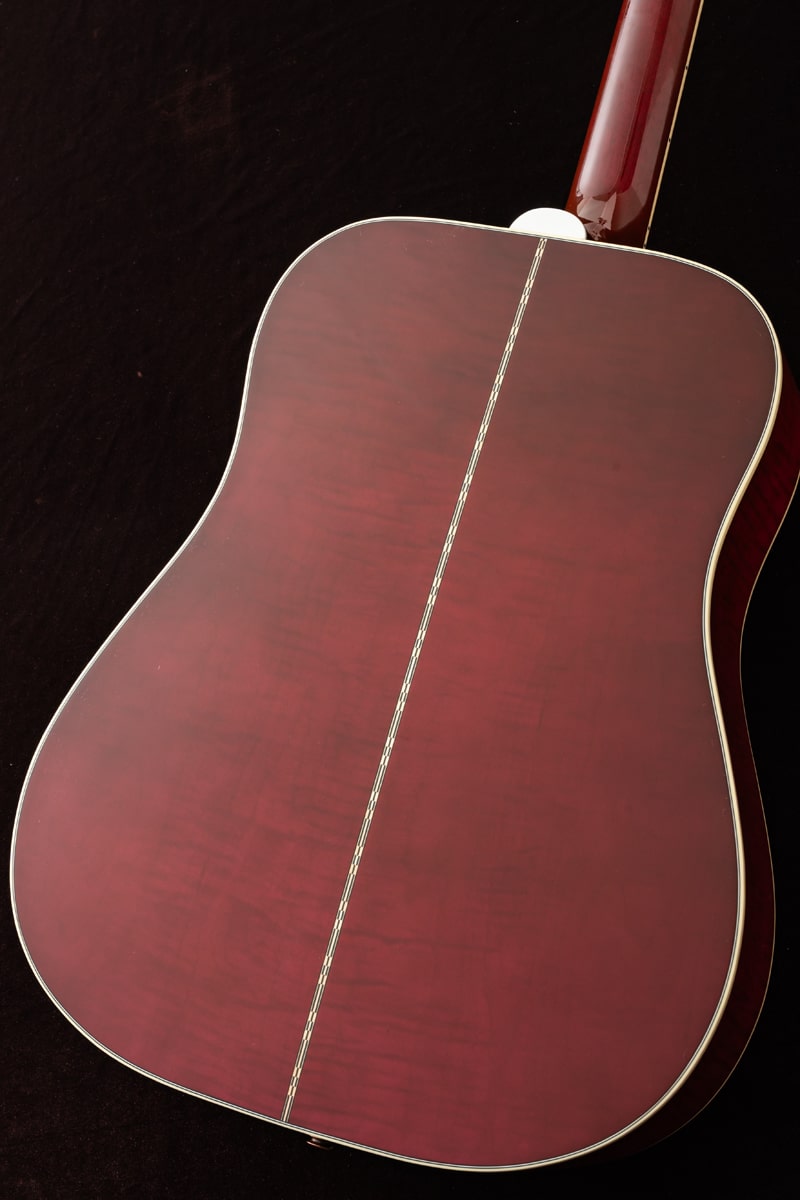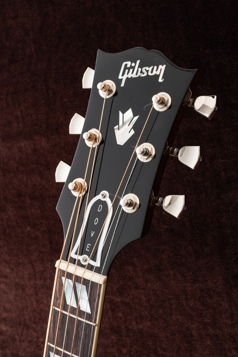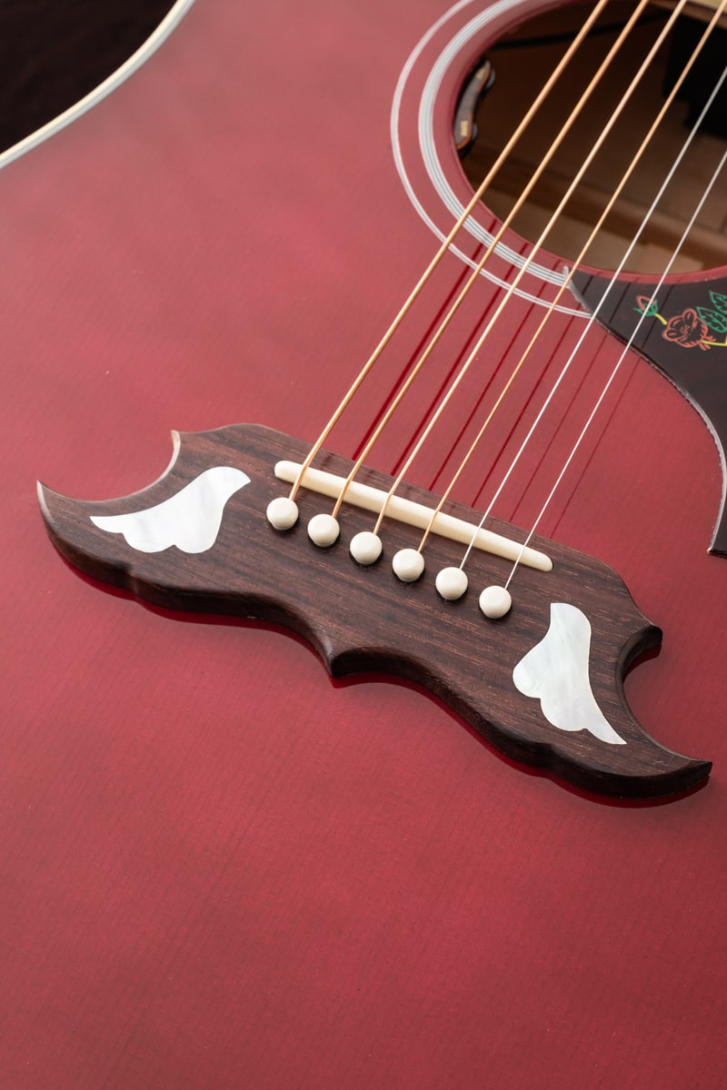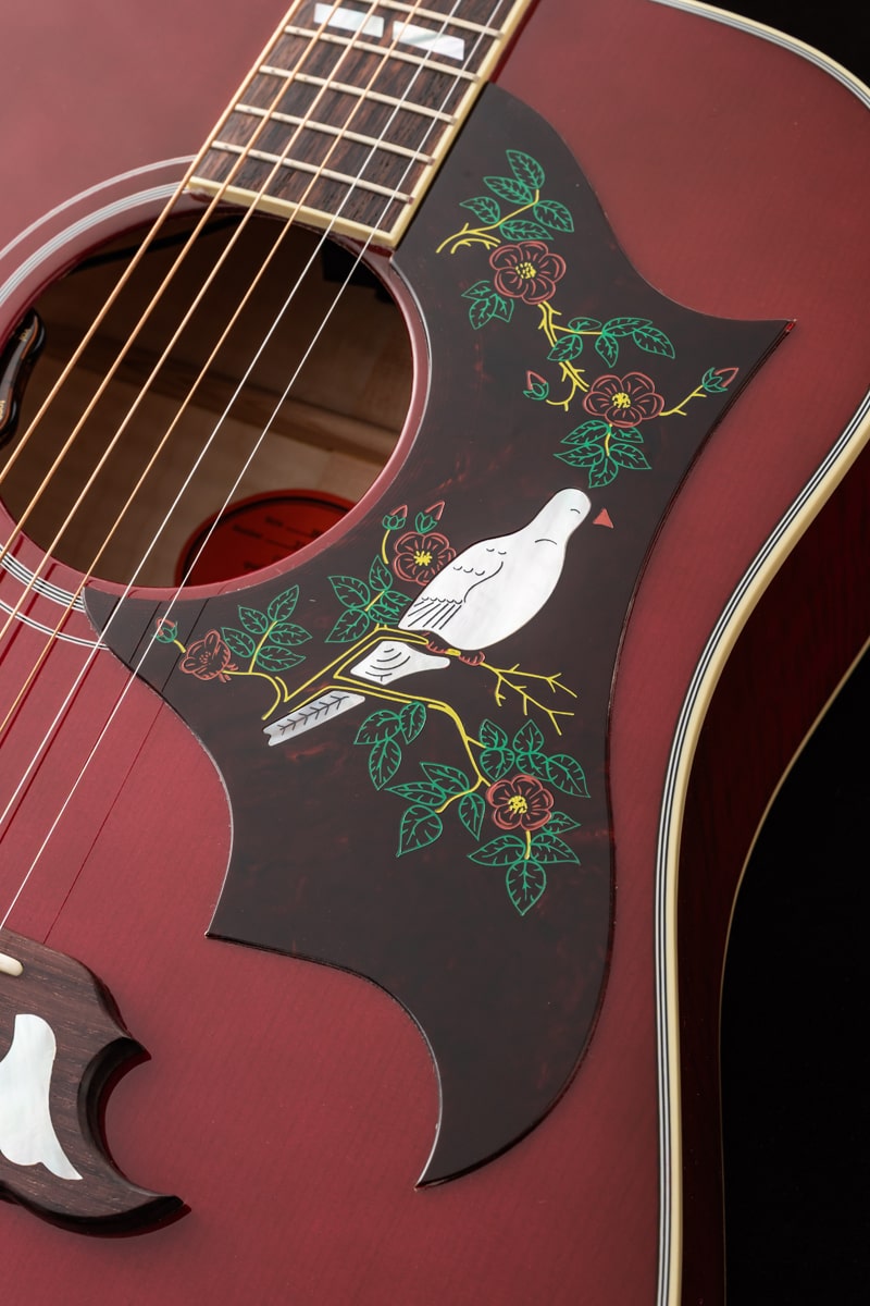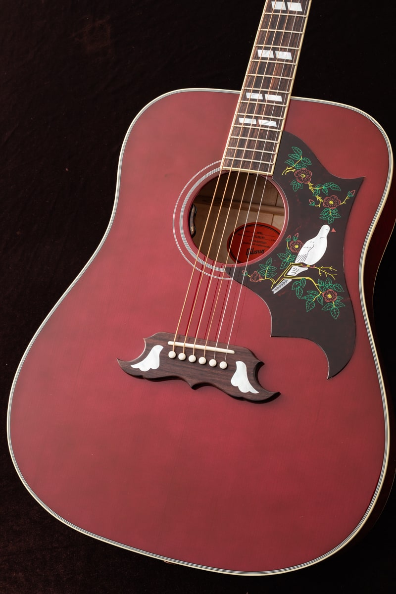 当社スタッフがモンタナ工場にてピックアップしてきた逸品!美しいフレームが透けるワインレッドカラーはレギュラーには無いカラー!スプルース トップ、メイプル サイド&バック、ネック材はマホガニーが使用されています。ハミングバードの24 3/4インチよりも若干長い25 1/2インチスケールとなっておりメイプル材との組み合わせにより輪郭のある重厚なサウンドキャラクターが特徴でピックガードの鳩のインレイが印象的なモデルです。指板やブリッジベース、ピックガードに豪華なインレイが施され、SIDE、BACK、NECKに上品な杢目のメイプルを使用した上位グレードのGibson DOVE。L.R.Baggs Element VTCピックアップ搭載です。