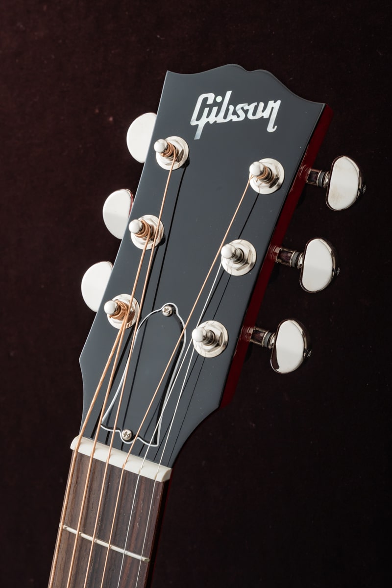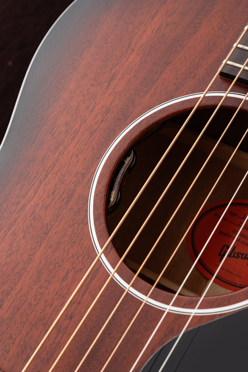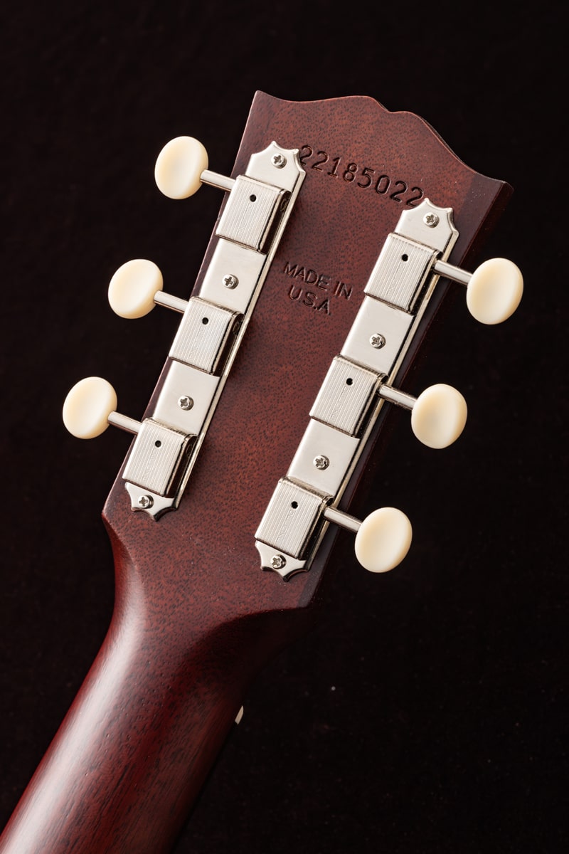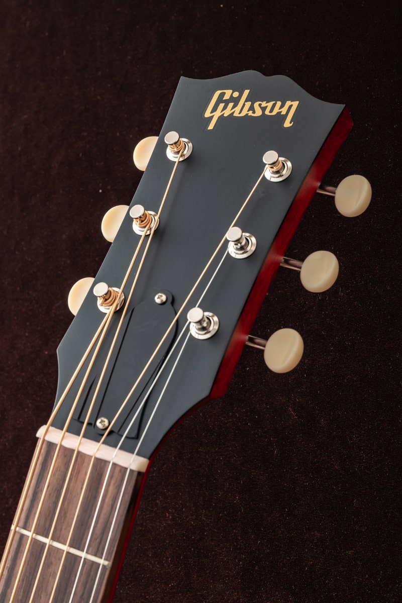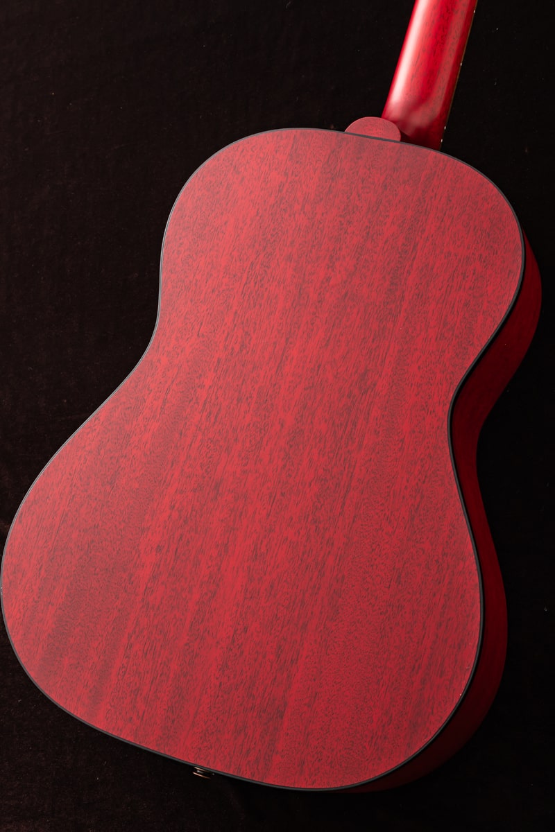 1942年、バナーロゴをヘッドストック上に冠していた“バナー期”に初めて登場し、その小ぶりなボディからは想像できない豊かなサウンドで瞬く間に愛されるモデルとなったGibson LG-2。今回ハンドピックしたのは、バックとサイド、そしてサウンドボードに至るまで、ソリッド・マホガニーを使用したスモールギブソンのチェリーレッドカラー。オール・マホガニー・ボディの本モデルは、同サイズのスプルース・トップを持つギターと比べて、より温かく丸みのあるサウンドを生み出し、フォーク、ブルース、フィンガースタイルに最適です。また、その小ぶりなボディサイズは、大きなボディのアコースティック・ギターと比べて抱えやすい点も魅力です。さらに、現代のパフォーマーやレコーディング・ギタリストのニーズに応えるため、L.R. Baggs VTCアンダーサドル・トランスデューサーと内蔵プリアンプが搭載されています。
