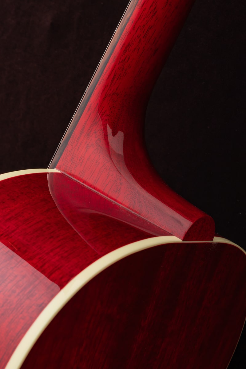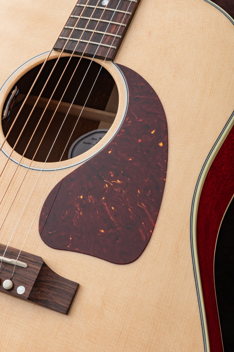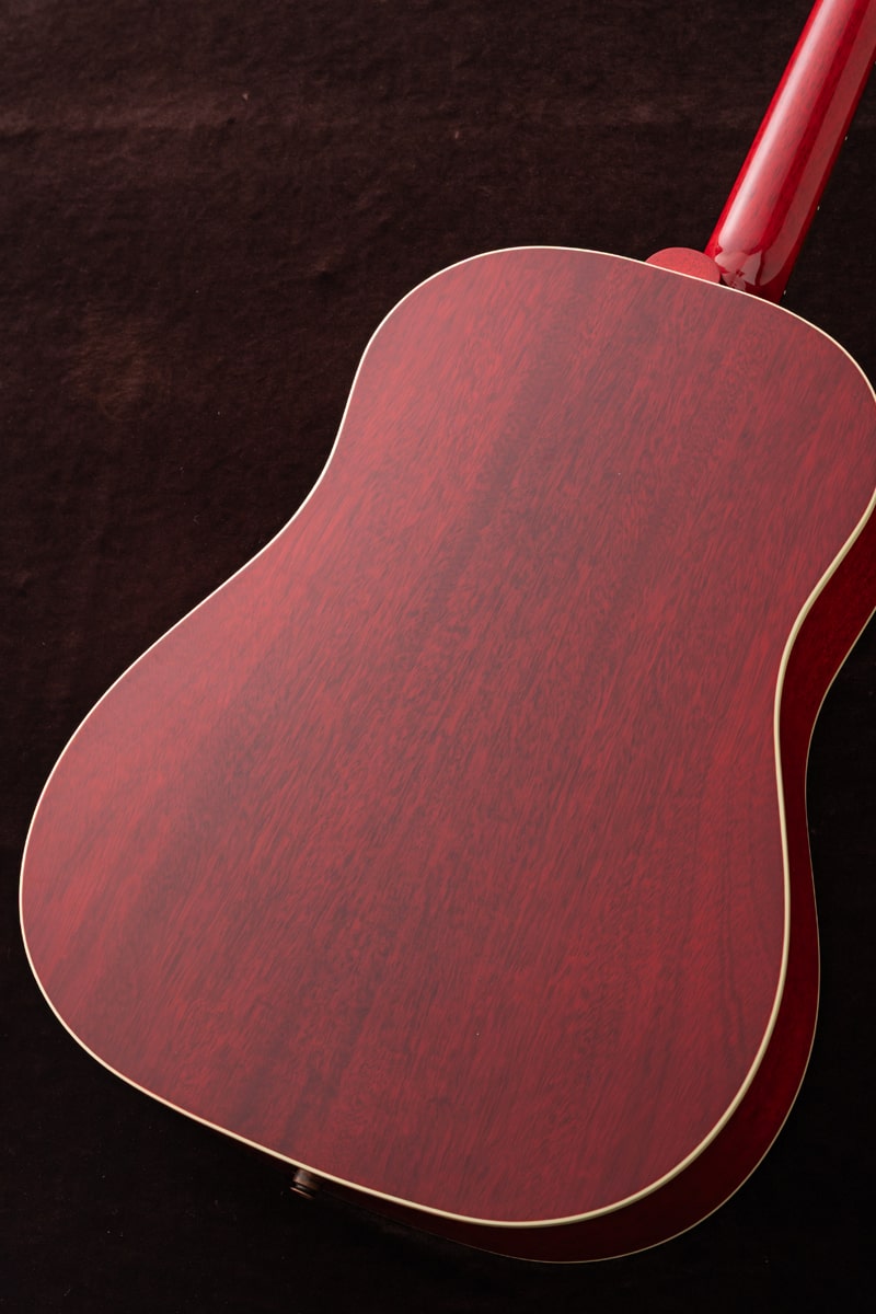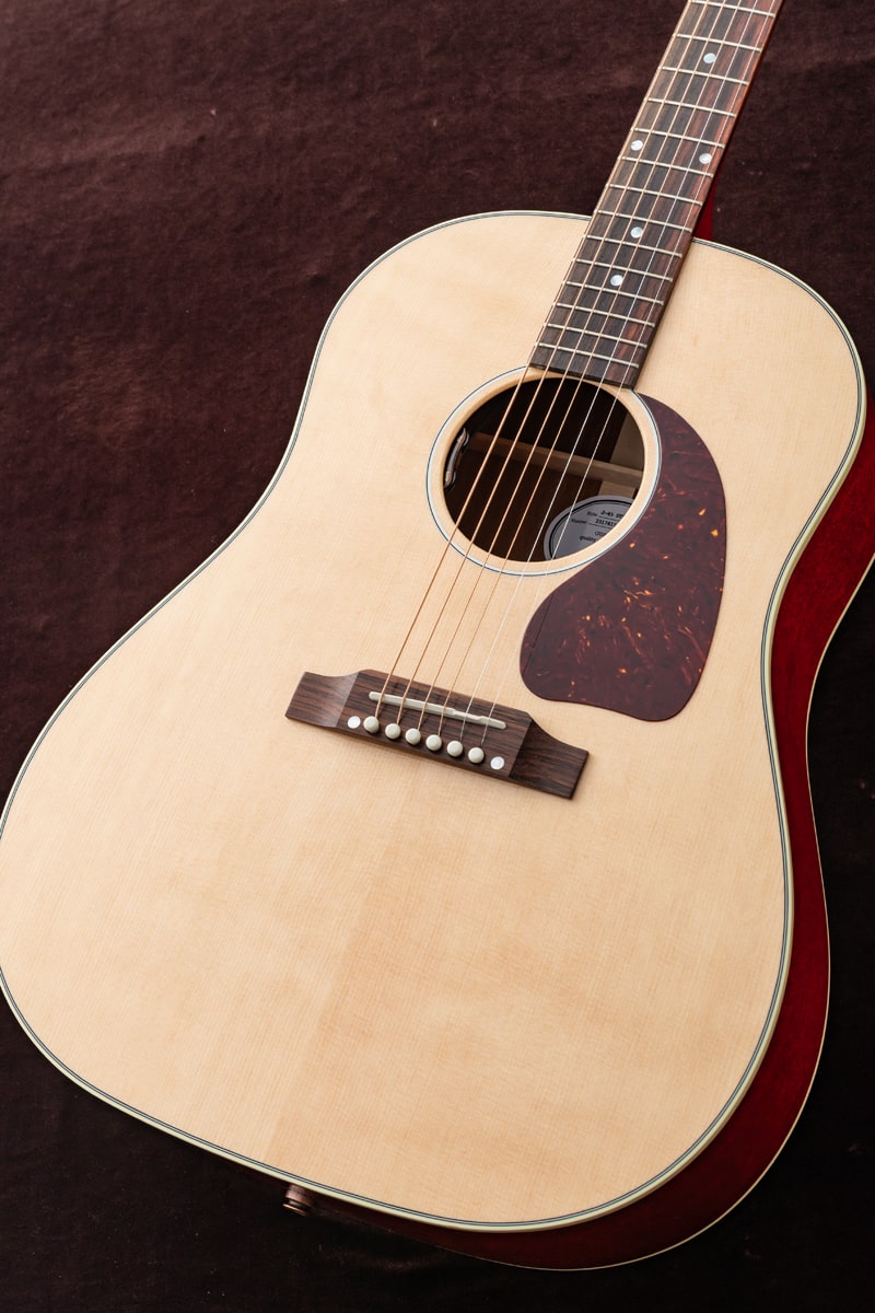 Gibsonの名作「J‑45」のカラーカスタム品を弊社スタッフがGibson モンタナ工場に赴きハンドピック。トップがナチュラルカラーで仕上げられ、サイドとバック、そしてネックに深みのあるチェリーカラーを採用。通常のJ-45とは異なる美しいカラーコントラストが印象的で、ナチュラルトップの爽やかな表情とチェリーフィニッシュの鮮やかな深みが絶妙に調和し、ステージでもひと際目を引く佇まいを生み出します。サウンド面では、J-45ならではの力強く温かい低音、豊かな中域、バランスのよいレスポンスをしっかりと継承しており、ストロークからフィンガースタイルまで幅広い演奏に対応します。LR Baggs Element VTC を搭載しているため、ライブやレコーディングでも自然で扱いやすい音を得ることができます。
