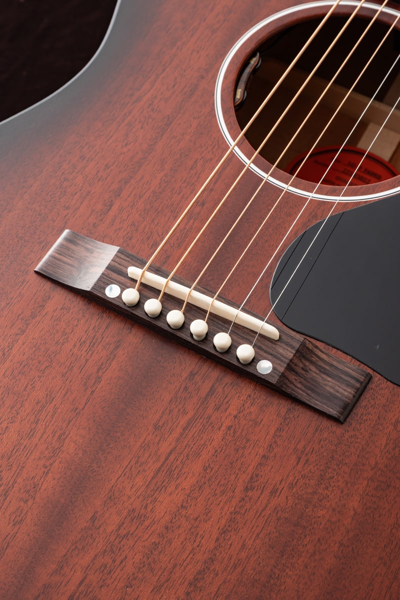 当社Gibson Acoustic担当スタッフがGibson社現地にてハンドセレクトしたサウンド重視の一本。LG-2 All-Mahogany Fadedのオール・マホガニー・ボディは、同サイズのスプルース・トップを持つギターと比べて、より温かく丸みのあるサウンドを生み出し、フォーク、ブルース、フィンガースタイルに最適です。また、その小ぶりなボディサイズは、大きなボディのアコースティック・ギターと比べて抱えやすい点も魅力です。さらに、現代のパフォーマーやレコーディング・ギタリストのニーズに応えるため、LG-2 All-Mahogany Fadedには工場出荷時からL.R.Baggs VTCアンダーサドル・トランスデューサーと内蔵プリアンプが搭載されています。