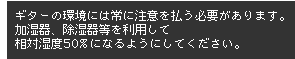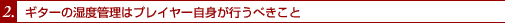| どんなギターも正しい保管、正しい取り扱いをしなければ、故障などの原因になります。自分で行うべき管理を怠ったがために発生するトラブルが少なくありません。そのような場合には、たとえ保証期間内であっても修理は有料になります。そのような事故を防ぐためにも、ここに書かれていることを厳守し、常にギターをベストコンディションに保つように心がけてください。 |