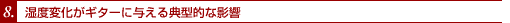 | 湿度が高すぎるのも有害になり得ます。典型的な兆候は、フレットや弦の変色(さび)、チューニングマシーンのニッケル、クローム、もしくは金メッキの腐食、トップや他の木材部分の膨張、高い弦高、添え木やブリッジのはがれなどです。 | ||||||||||||||