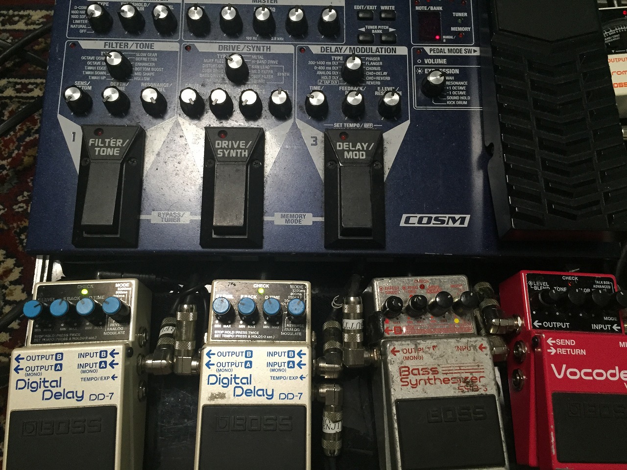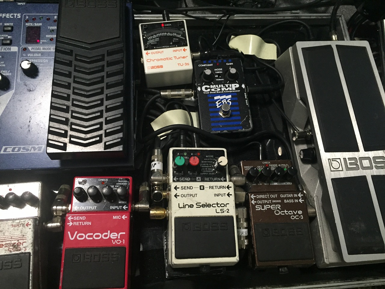 BOSS OC-3 / BOSS LS-2 / BOSS VO-1 / BOSS SYB-3 / BOSS DD-7 × 2 / BOSS ME-50B / EBS MULTICOMP / BOSS FV-500L / BOSS FS-5U / BOSS TU-3s/ BOSS SY-300