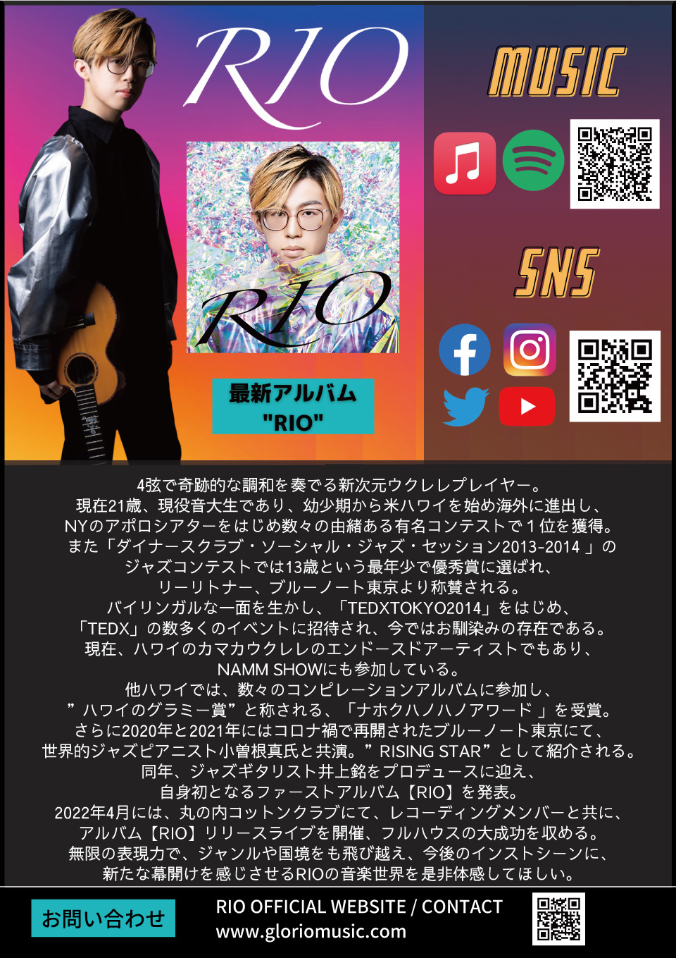 新次元ウクレレプレイヤー、Rioのニューアルバム『RIO』リリースツアーが大阪、京都、名古屋で行われる。