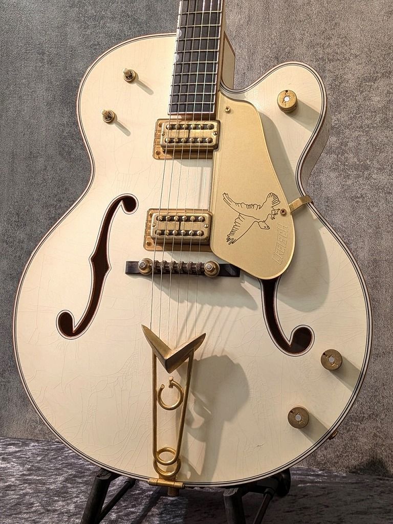 「世界一美しいギター」の頂点、1959年製ホワイトファルコンを、名匠チャド・ヘンリクセンが魂を込め復刻した至高の逸品です。最大の魅力は、元Fenderトップテックの彼が「手作業」に拘り抜いたネック。吸い付くようなCシェイプは、長時間の演奏でもストレスを感じさせません。 サウンドは、ディープボディ×トレッスル・ブレーシングの恩恵で、豊かな箱鳴りとドライブ時の粘るコンプレッション感が共存。Ray Butts PUが放つ分離感抜群の「鈴鳴り」は、まさに黄金期のトーンそのものです。非対称テールピースなど細部まで徹底考証された、ルックス・音・演奏性の全てが究極。まさに「ドリーム・ギター」の名に相応しい、一生モノのマスターピースです。