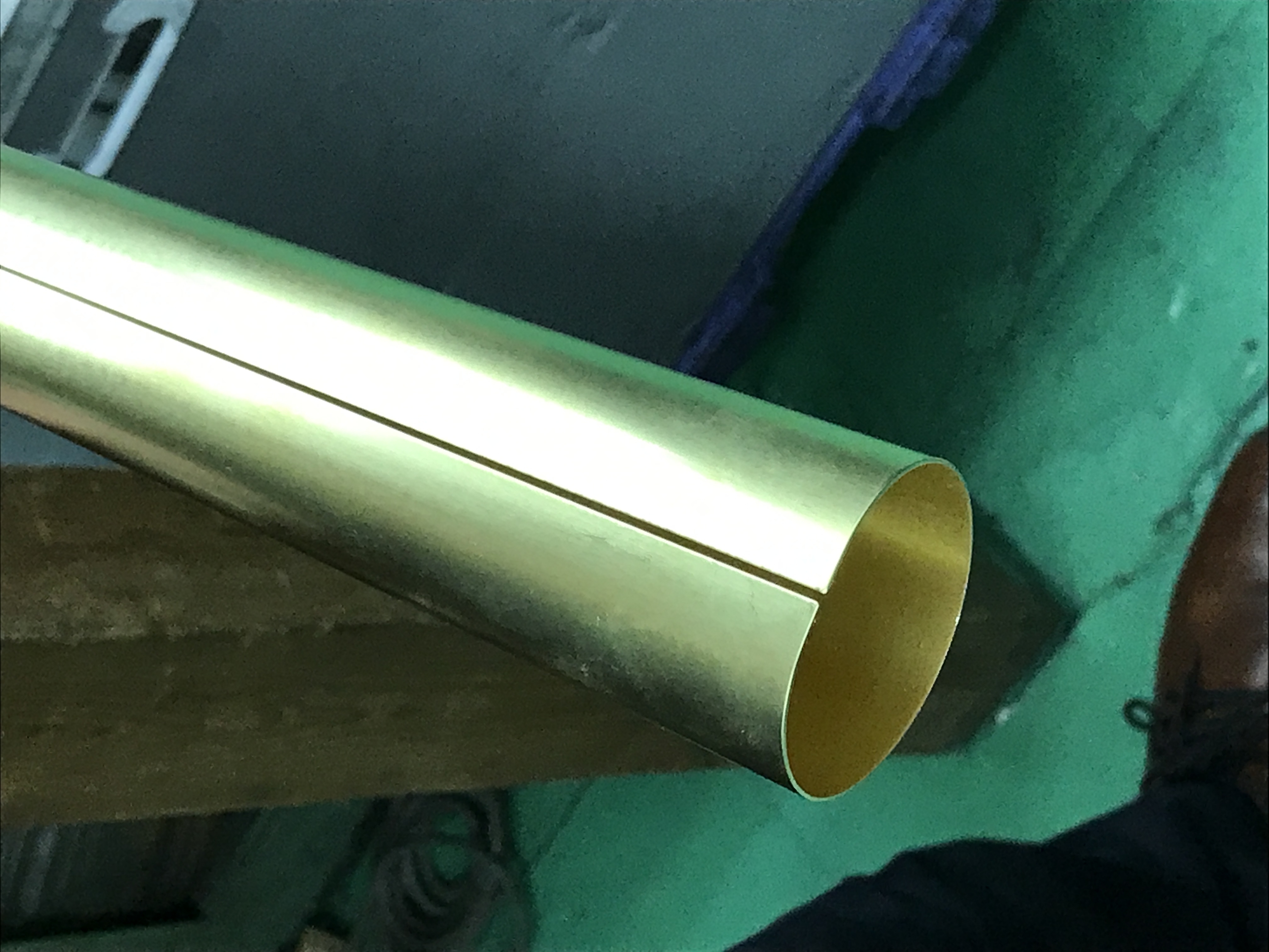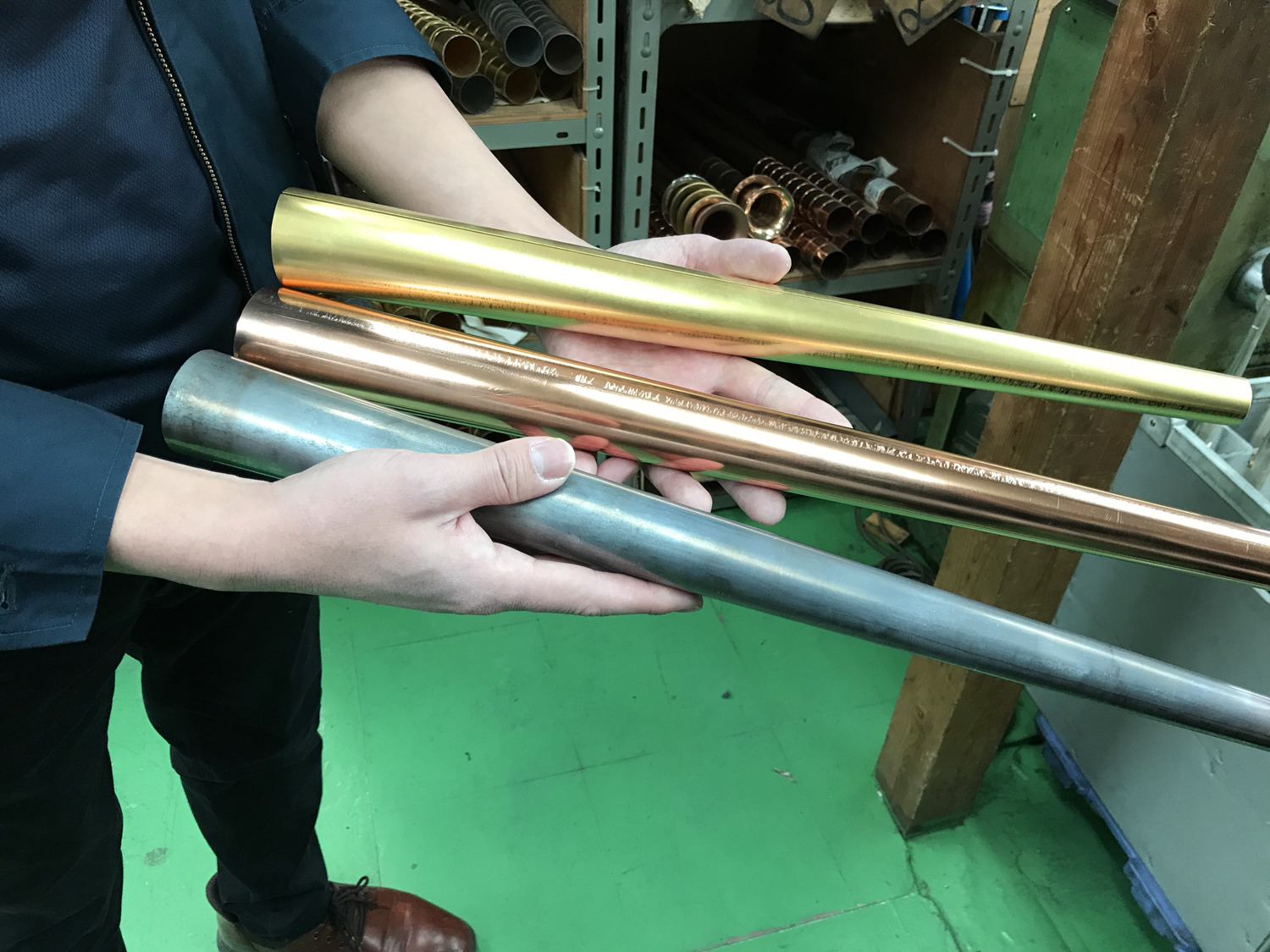 | 手前から銀・ブロンズブラス・イエローブラスの3種、素材の厚みや配合率は企業秘密 。 | よく見ると小さなな穴が開いています。ソプラノの小さなトーンホールをロー付けした行程 。 |