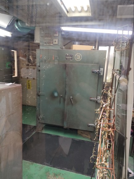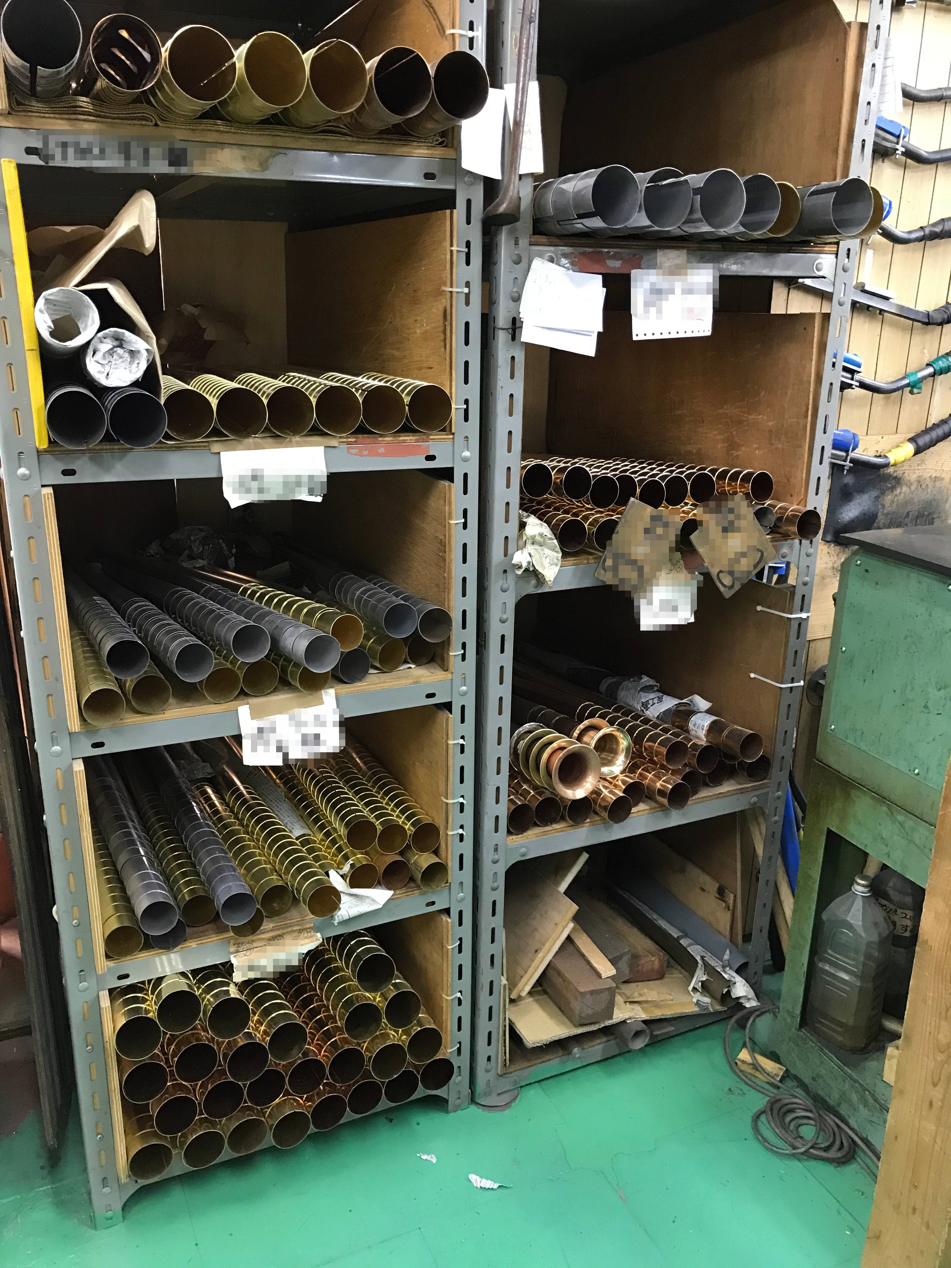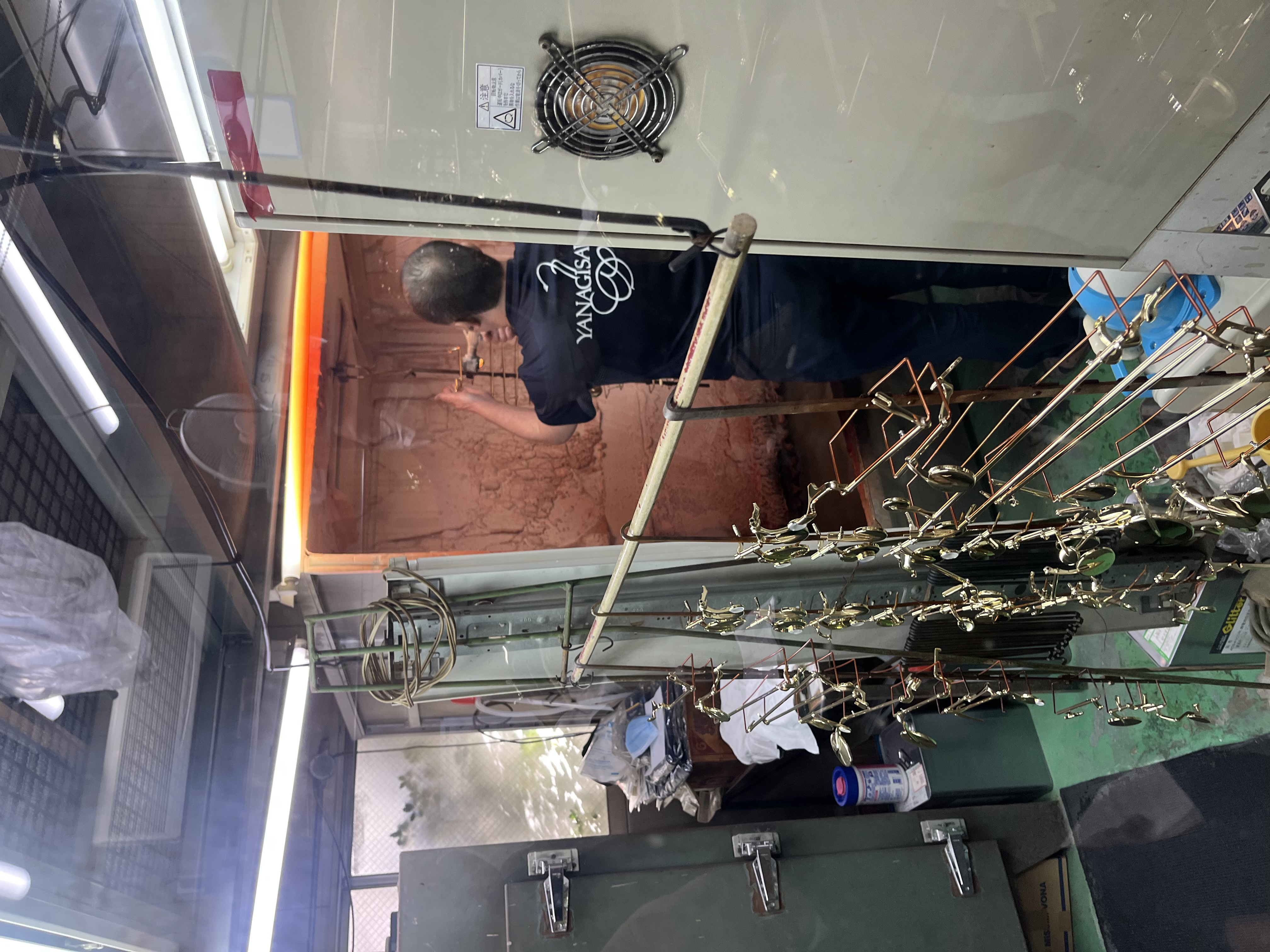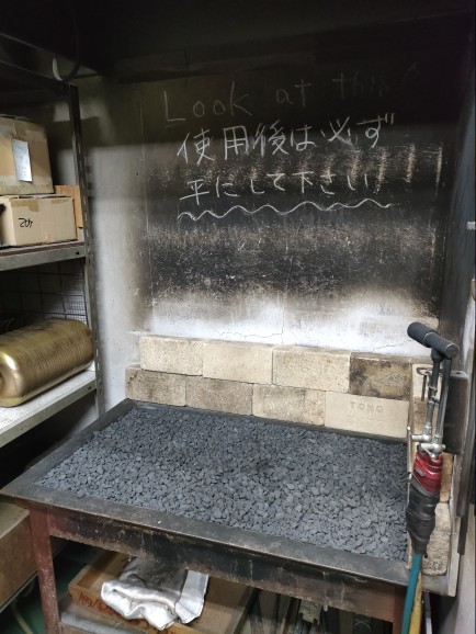 | ブロンズのU字管のつなぎ目がツルっときれいに仕上がりました、この後次の行程へ移ります 。 | 大きなガスバーナーで管体を熱して、金属を柔らかくする作業場 。 |