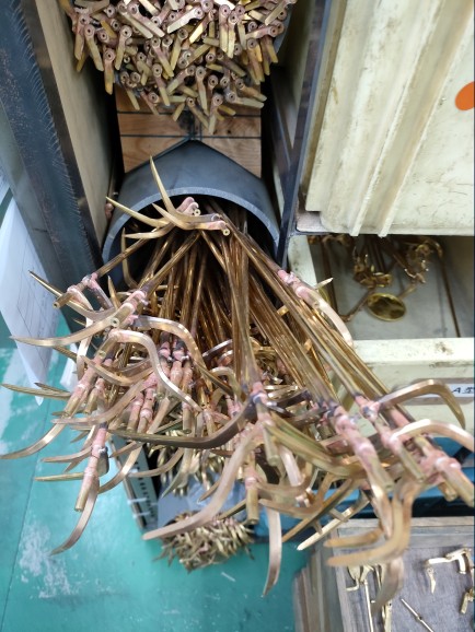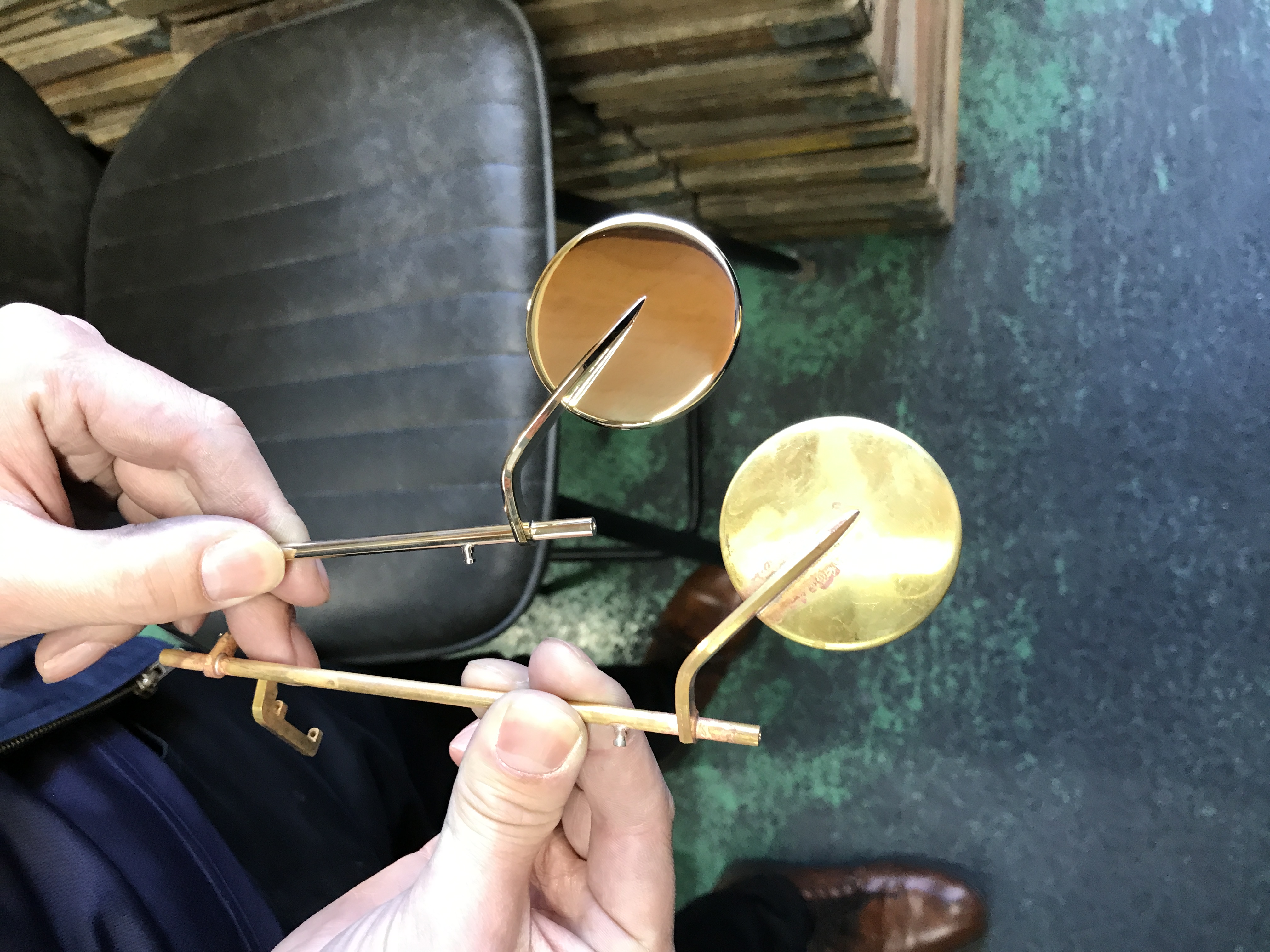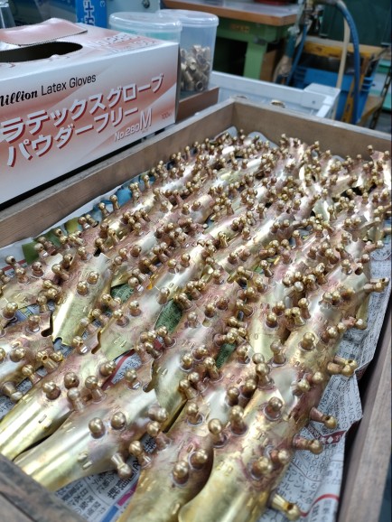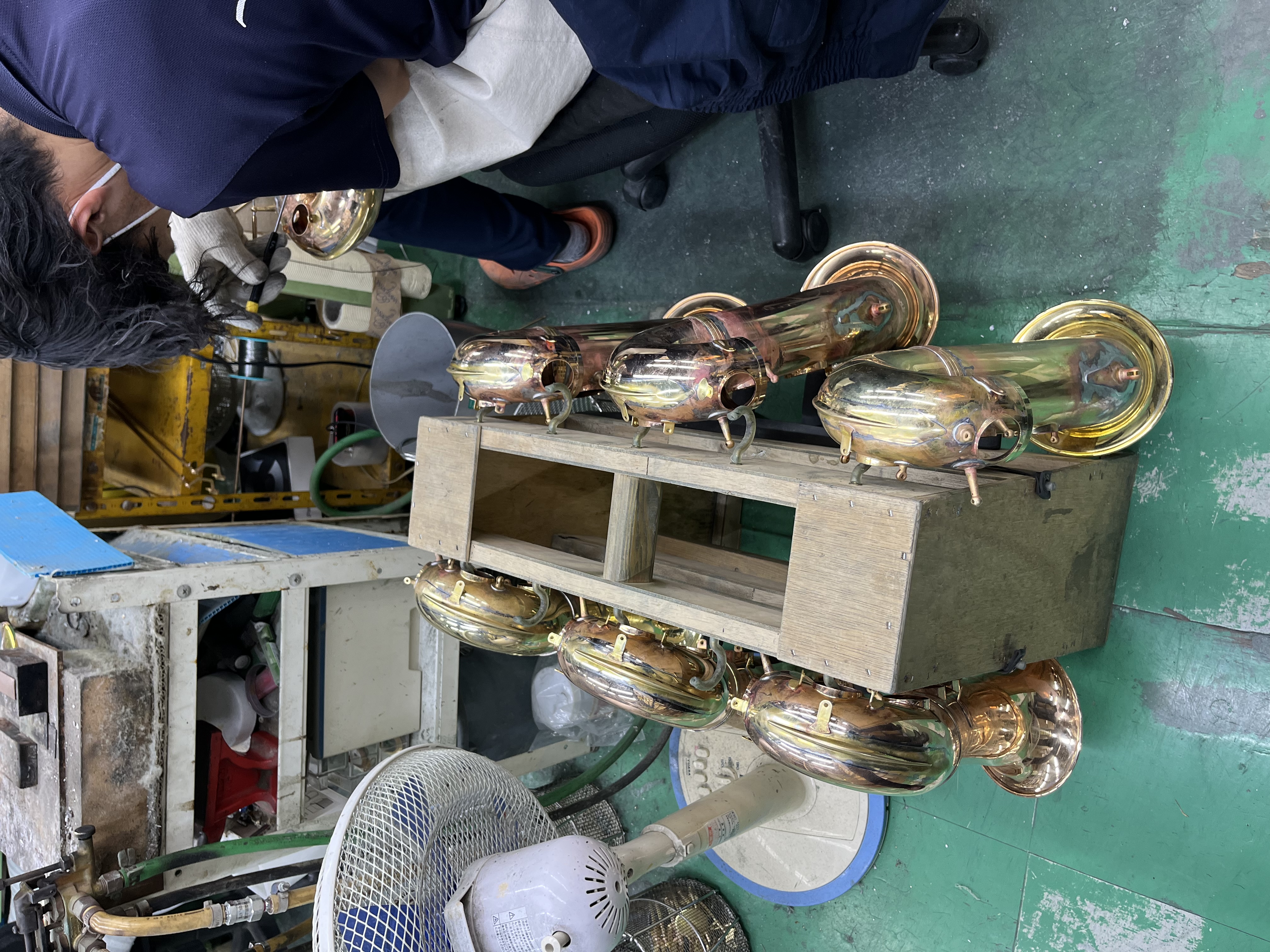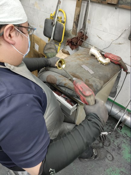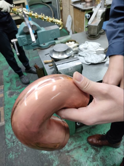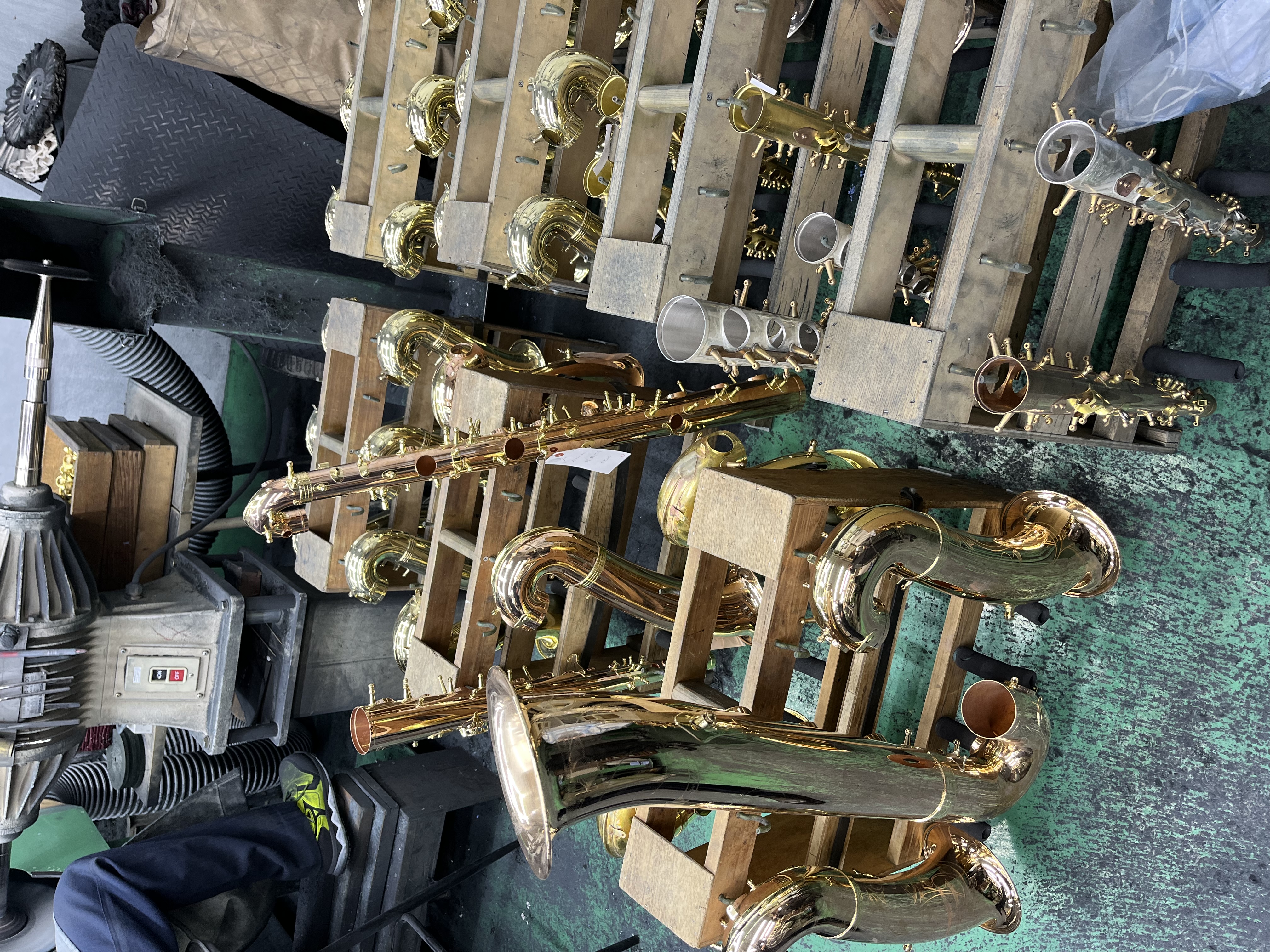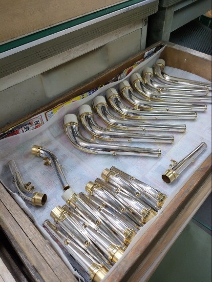| こちらはベルとU字管を溶接したテナーサックス、角度がズレないように丁寧に作業します 。 | 磨き作業待ちのU字管、ハンダの溶接跡や細かなキズを消しピカピカに磨いていく作業「バフ掛け」です 。 |
