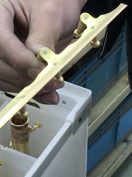 | 支柱のリングなど、キィカップ以外の「そういえば付いている」パーツも出番を待っています 。 | キィポストを管体にハンダ付けしていきます。毎回同じ位置に同じハンダの量で素早く作業します 。 |