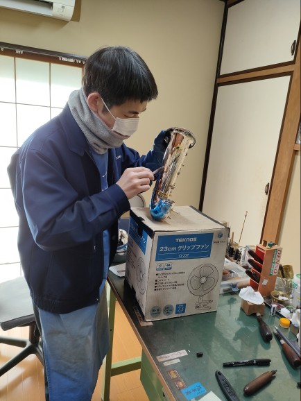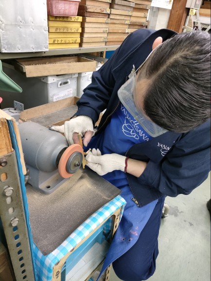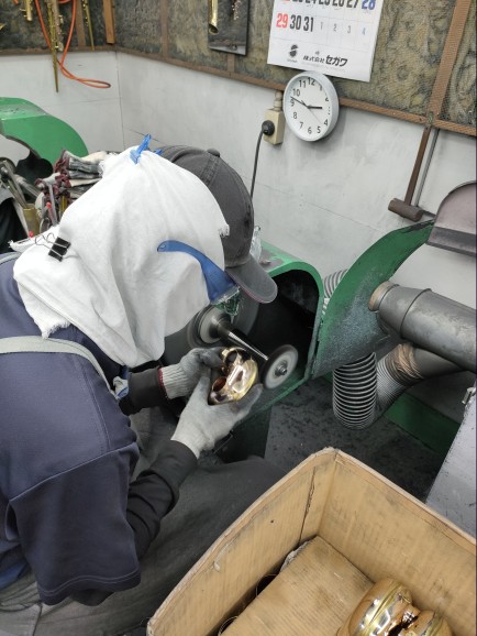 | この円盤状の布がバフです。研磨剤を付けて高速回転させ、キィや管体を当てて磨いていきます 。 | 削れた粉などが飛ぶ作業なので完全防備で作業します。高速回転の機械工具なので危険が伴います 。 |